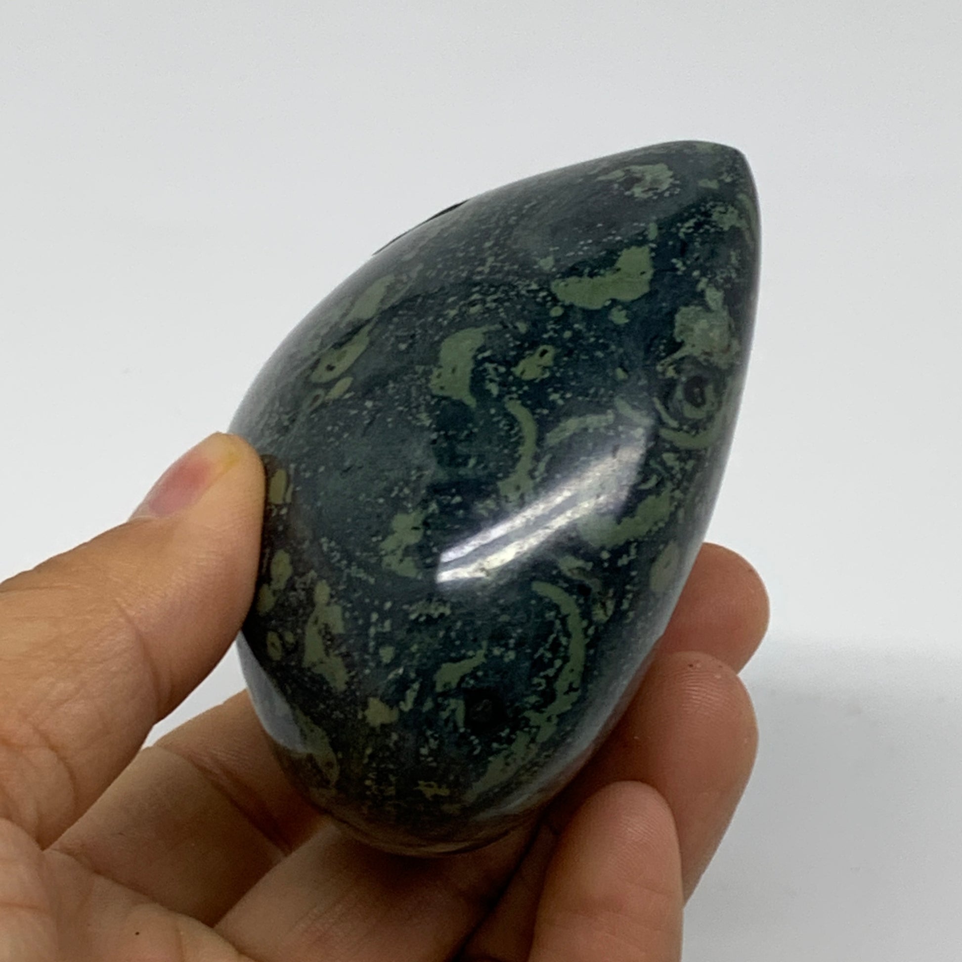 Kambaba jasper is also sometimes referred to as "Crocodile Rock" or "Crocodile Jasper" due to the resemblance of the black orbs to crocodile eyes