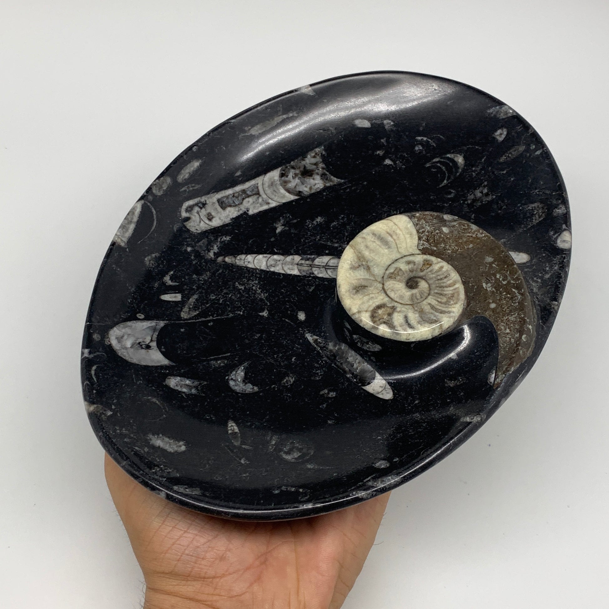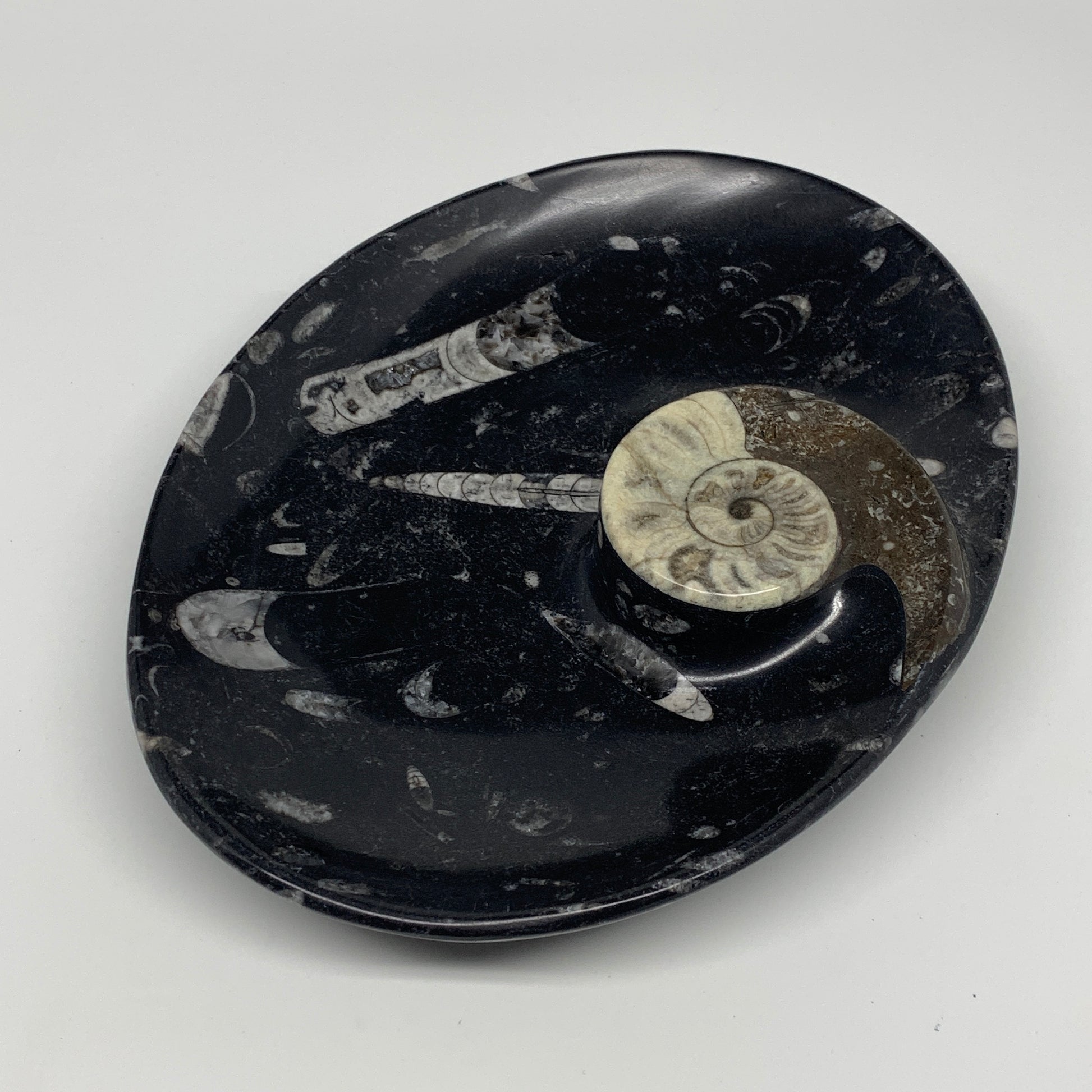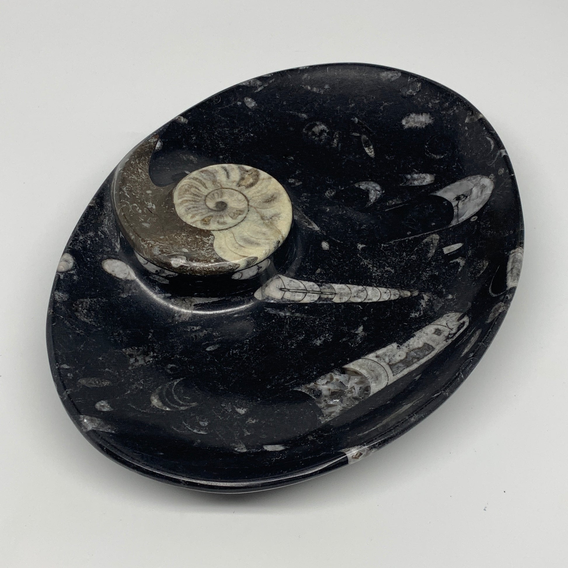 1026g, 8.75"x6.5" Black Fossils Ammonite Orthoceras Bowl Oval Ring @Morocco,B8455