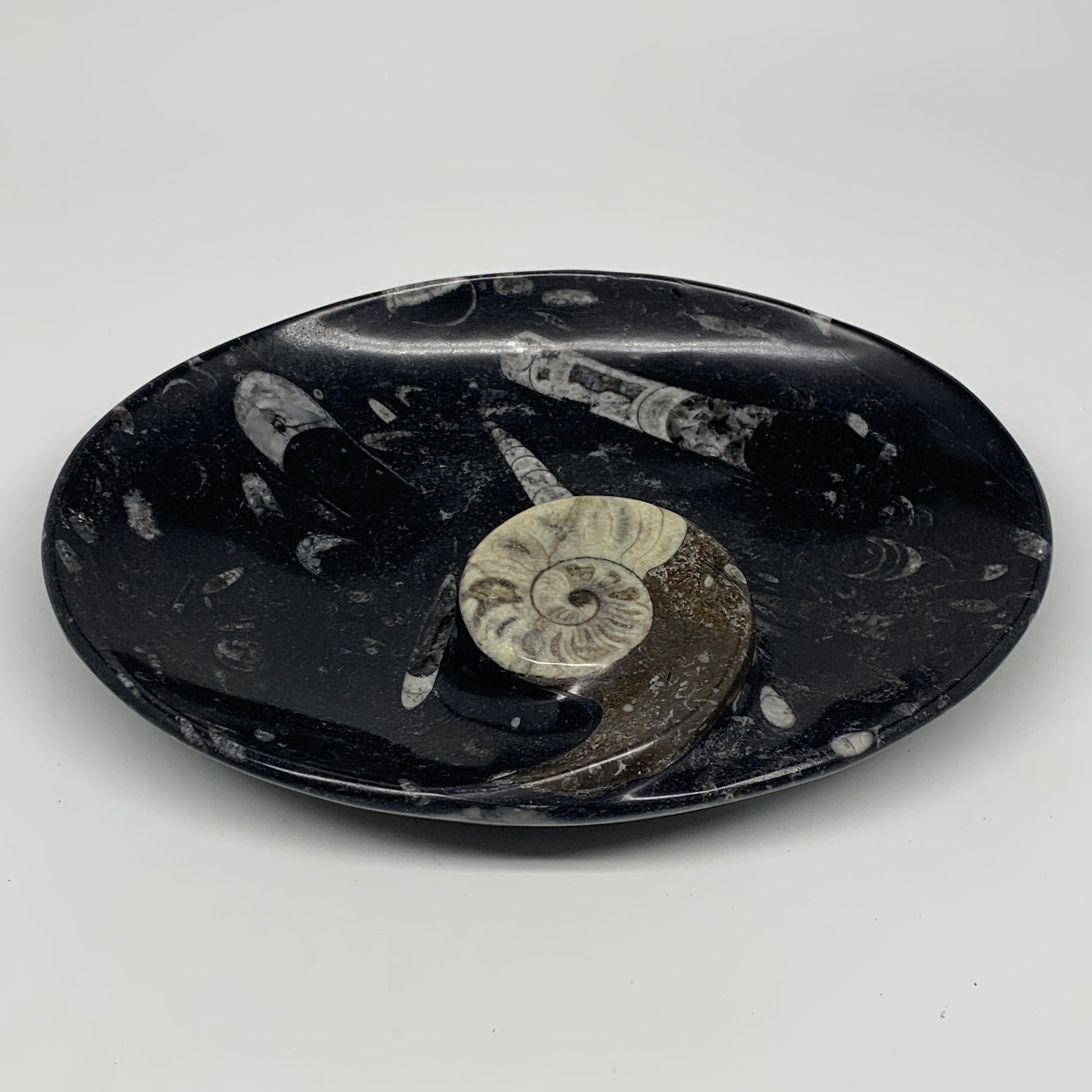 1026g, 8.75"x6.5" Black Fossils Ammonite Orthoceras Bowl Oval Ring @Morocco,B845
