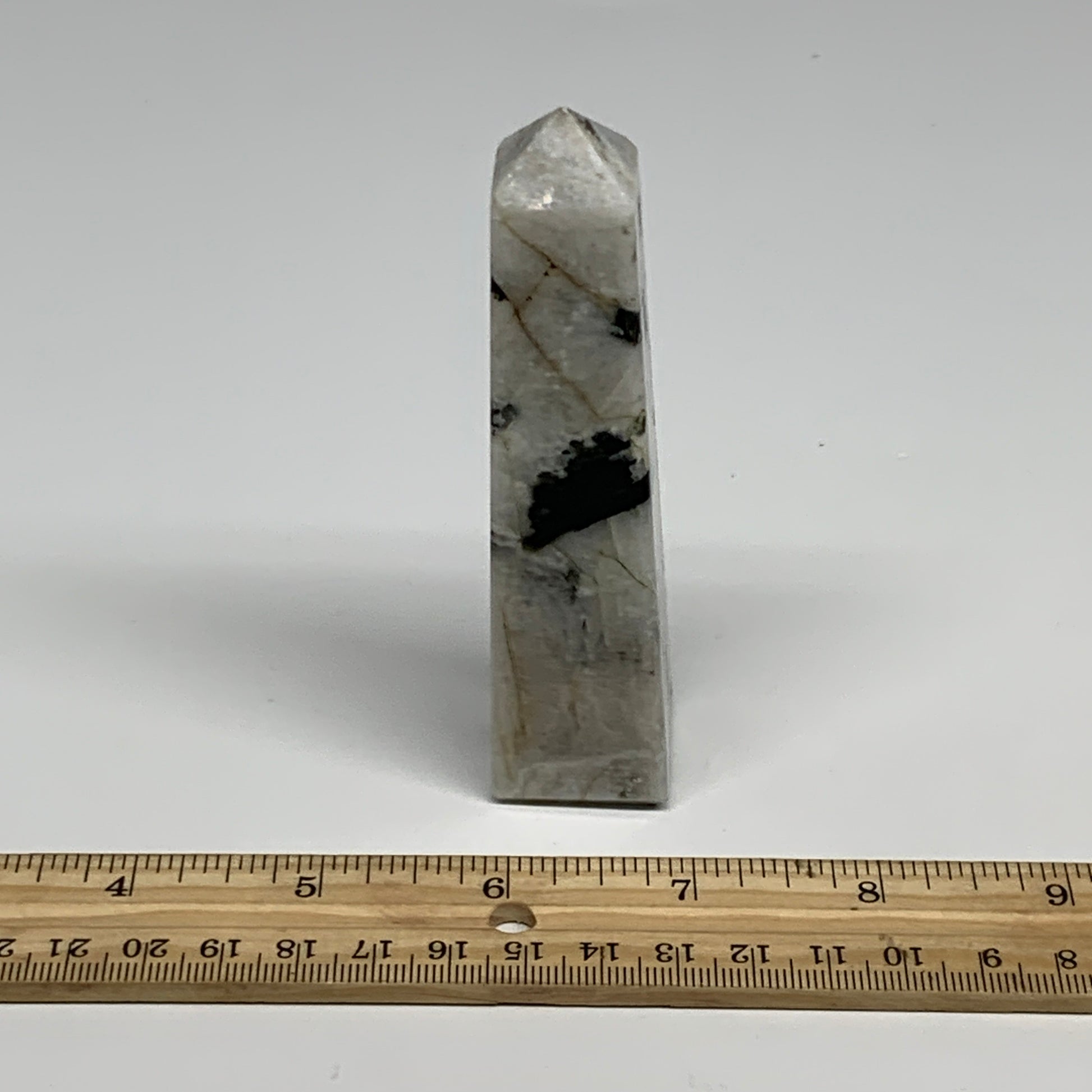 115.7g, 4.1"x1"x1." Rainbow Moonstone Tower Obelisk Point Crystal @India,B29304