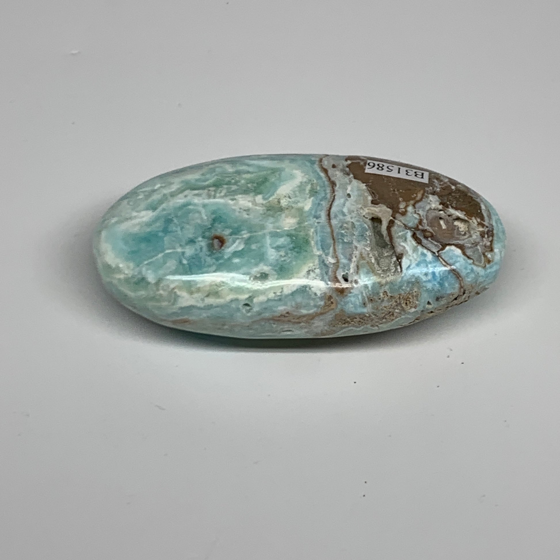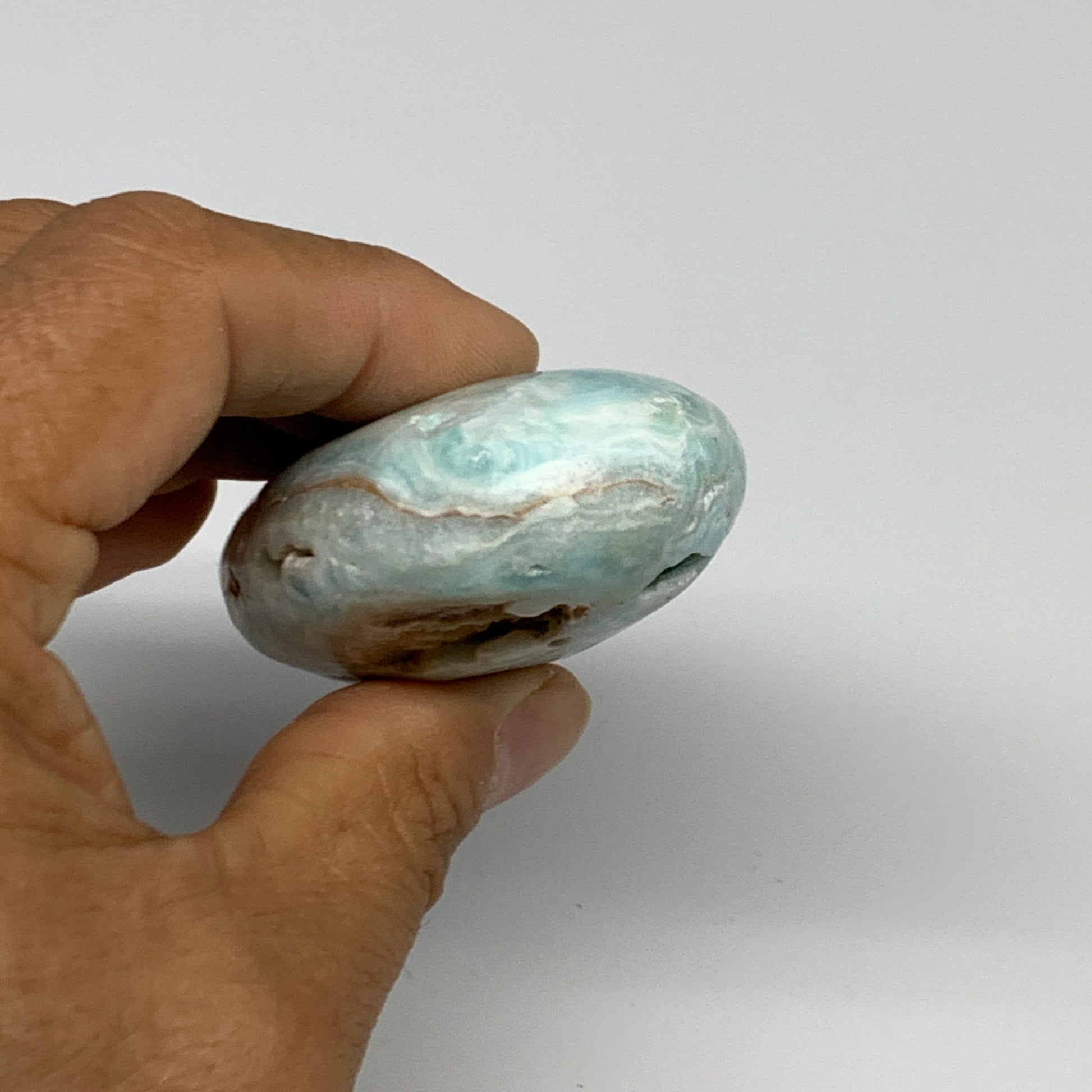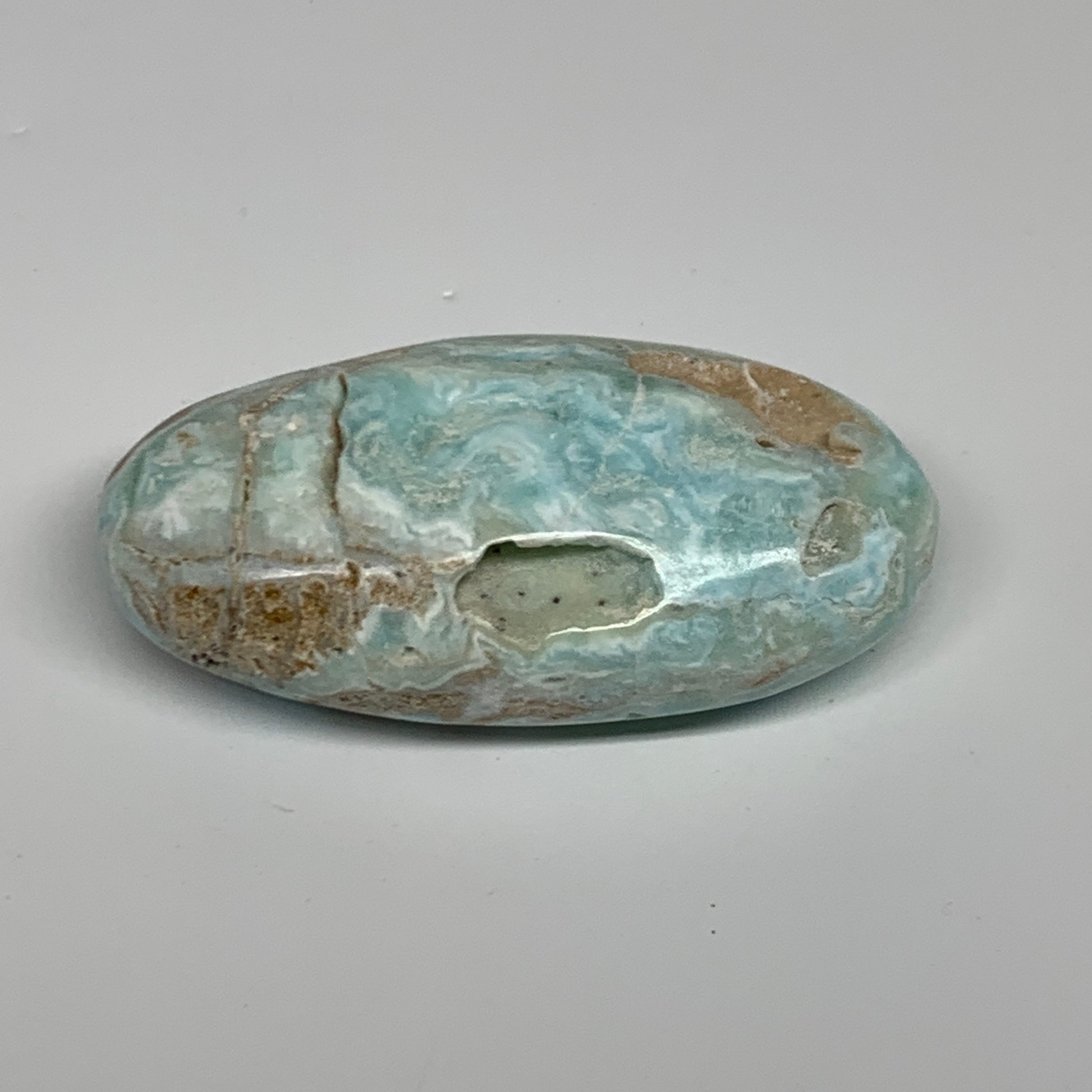 144.9g, 3.3"x1.7”x0.9", Blue Aragonite Calcite Palm-Stone @Afghanistan, B31586
