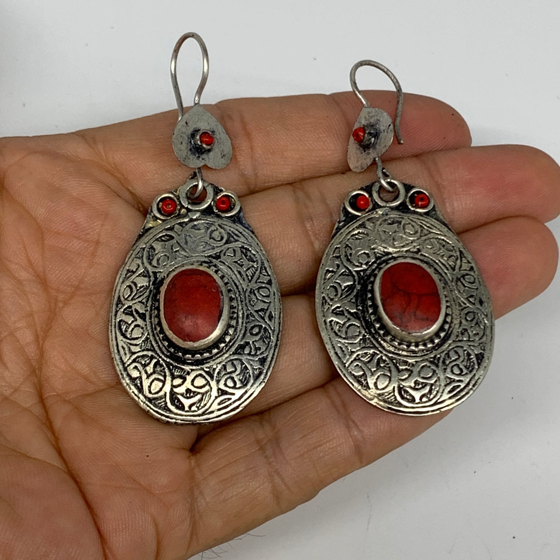 1pc, 2.6"x1.1" Turkmen Earring Tribal Jewelry Red Coral Inlay Oval Boho, B14275