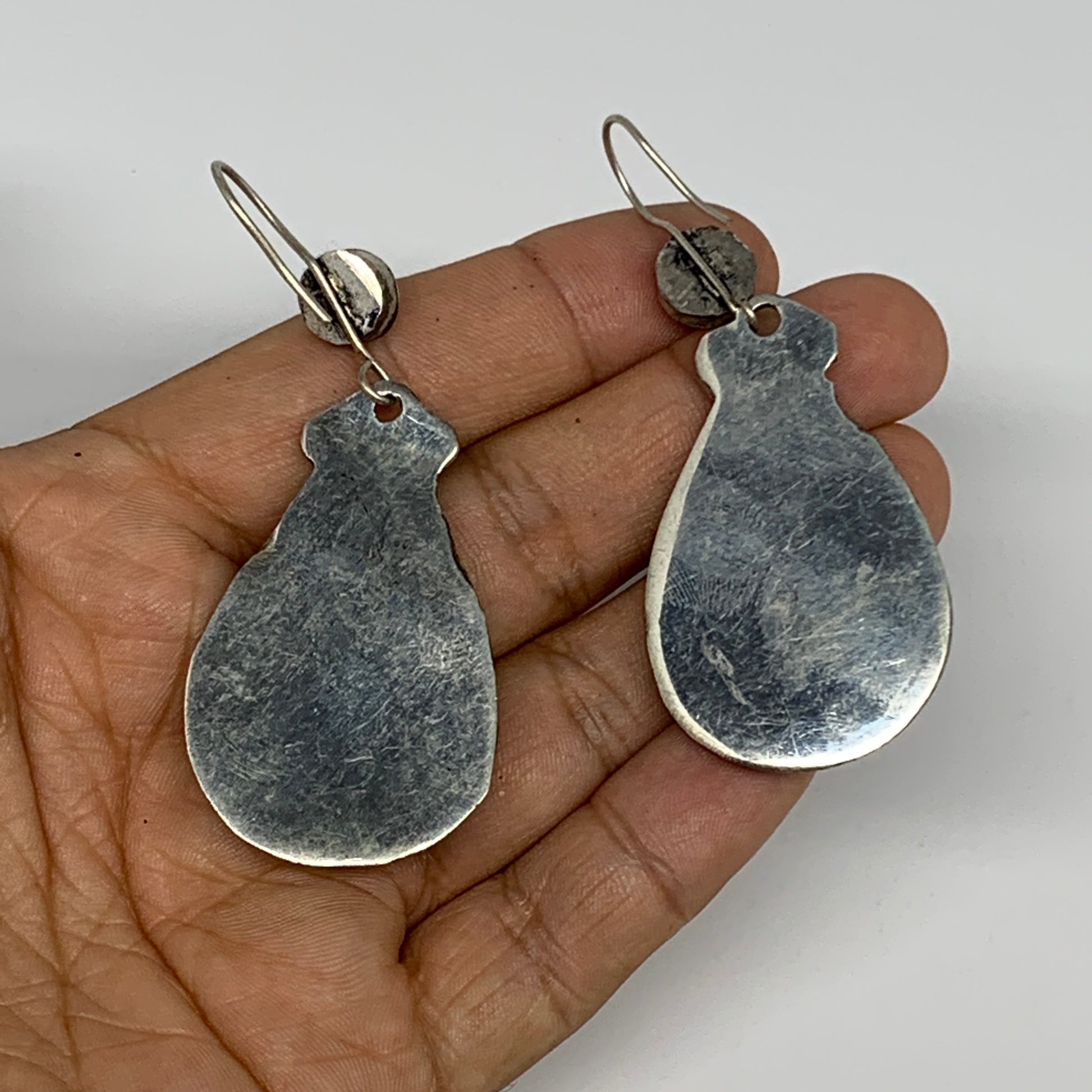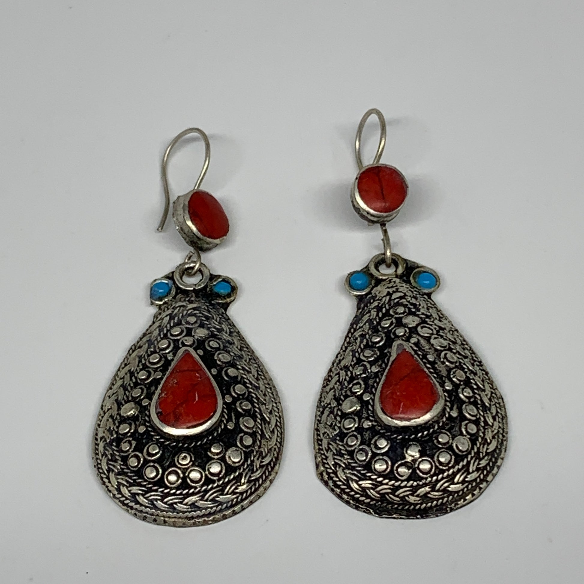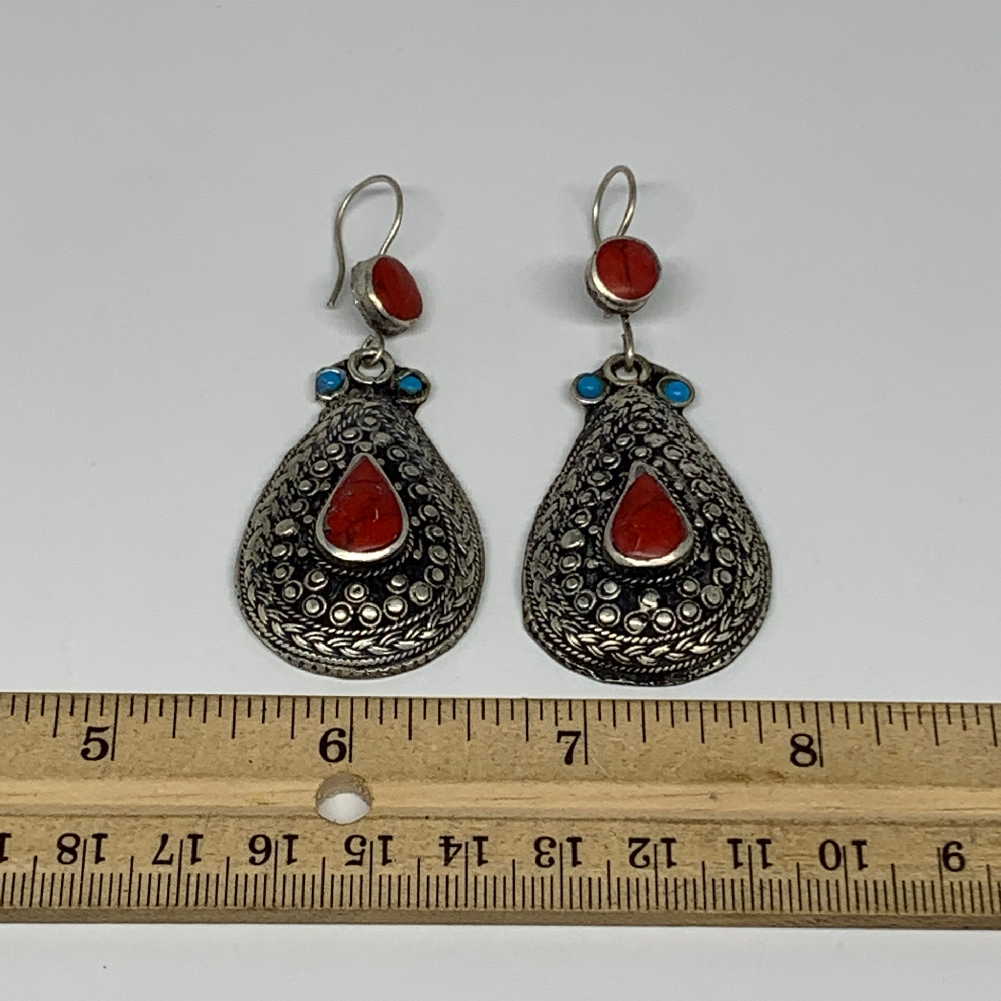 20.7g, 2.7x1.1" Turkmen Earring Tribal Jewelry Red Coral Inlay Teardrop Boho, B14234