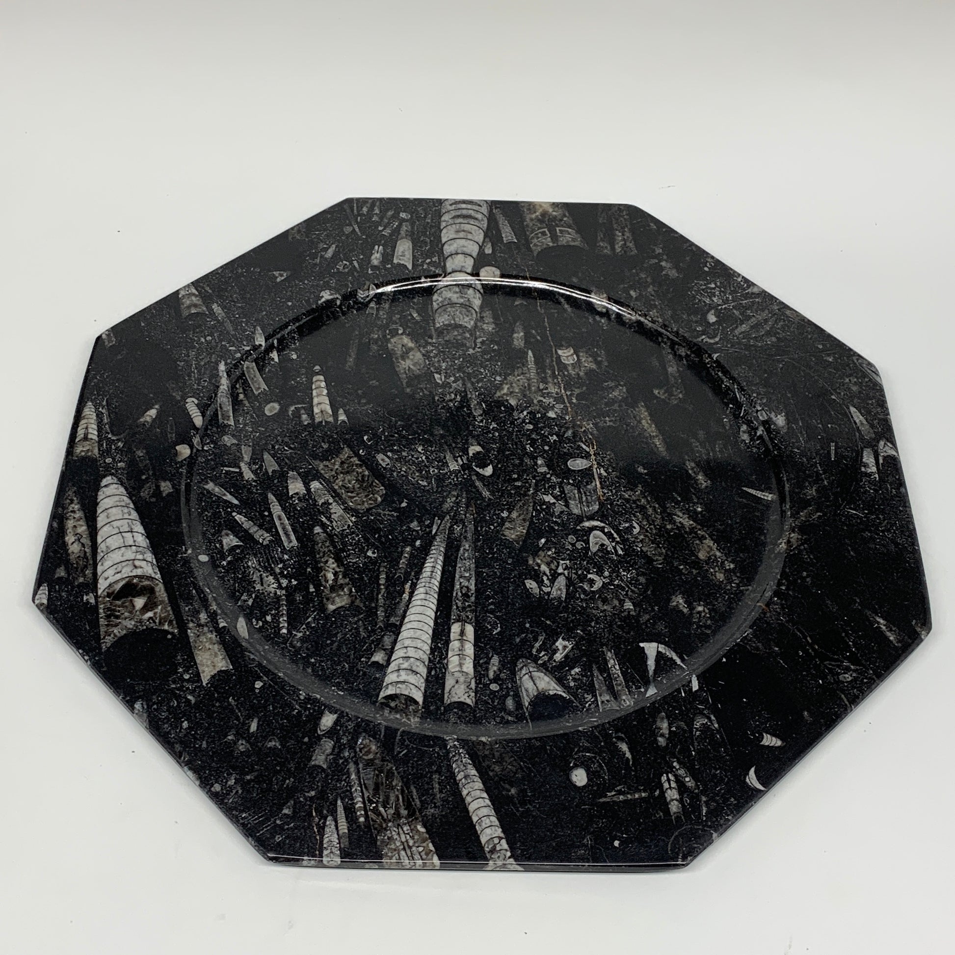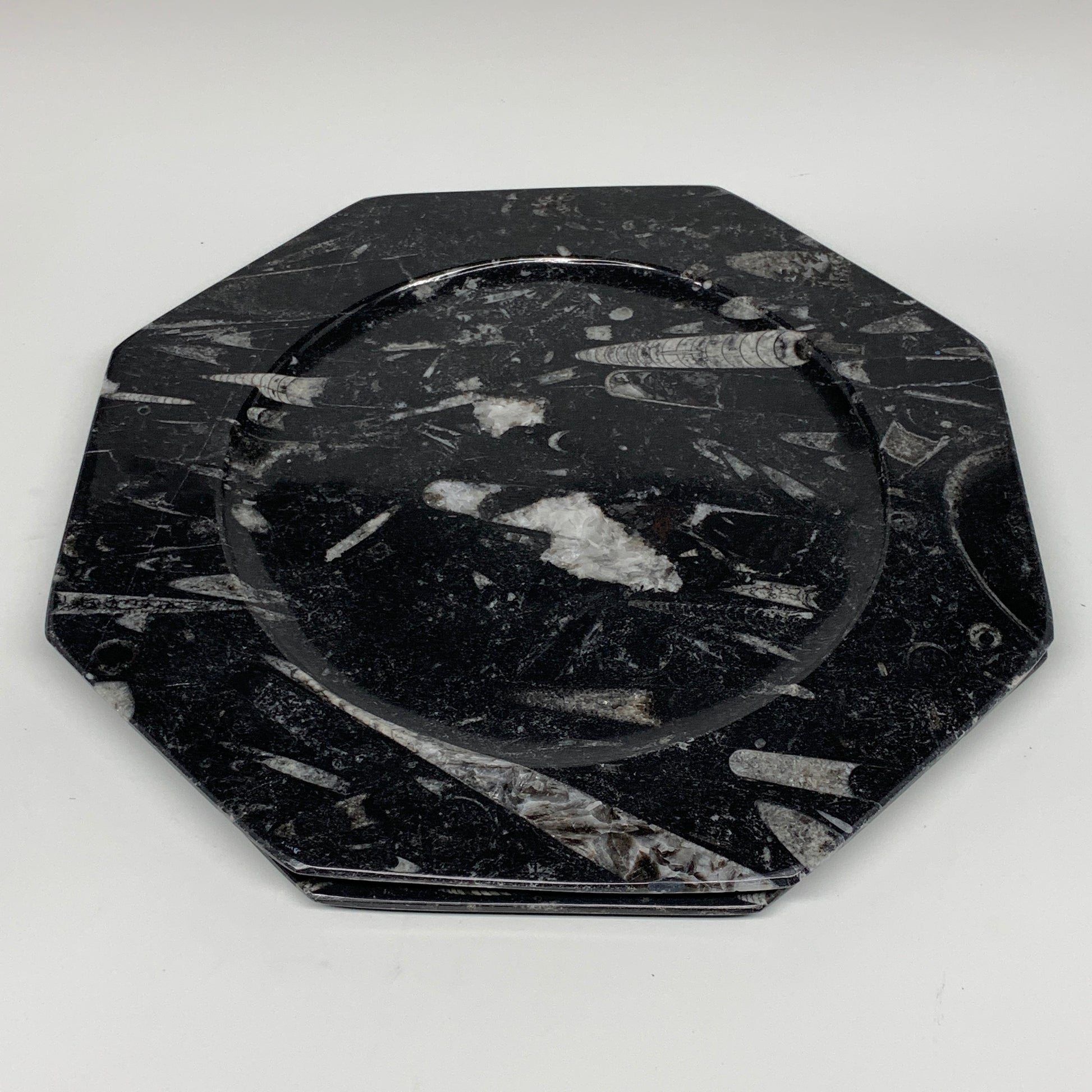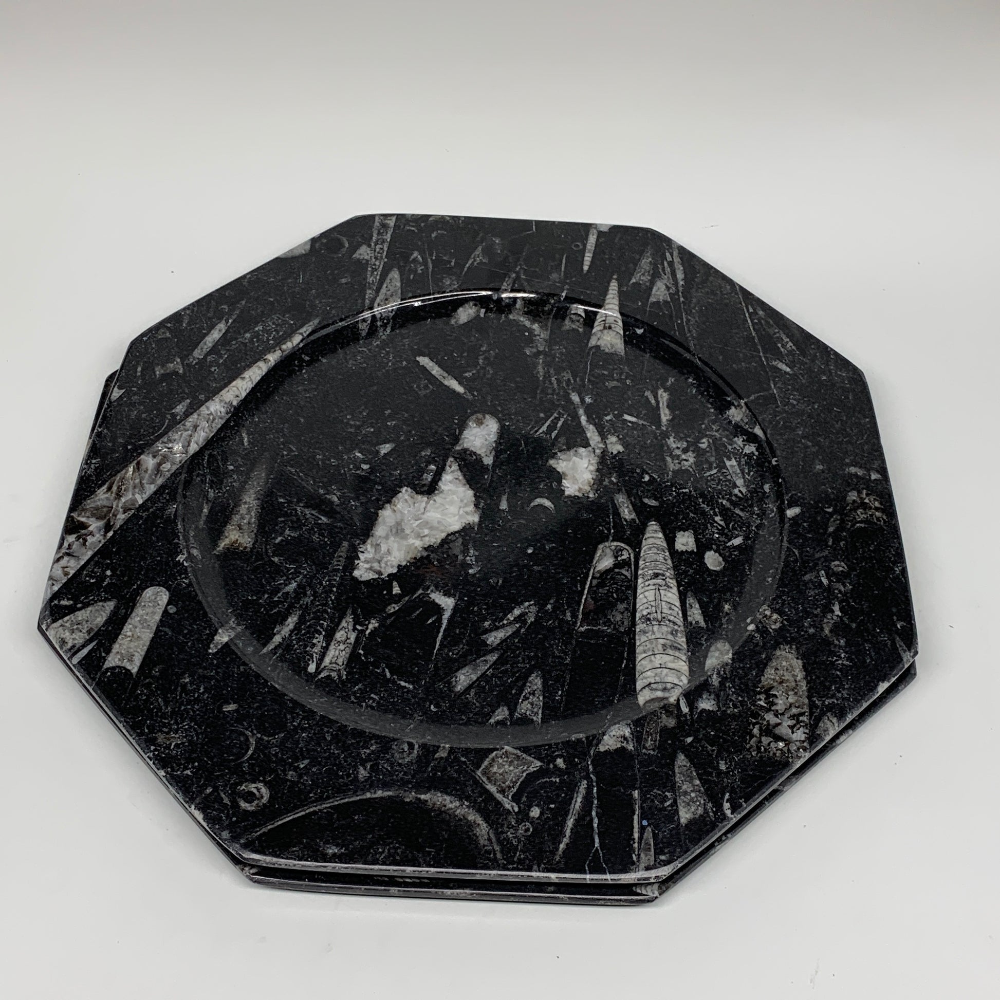 2pcs, 12" Large Octagon Shape Black Fossils Orthoceras Plates @Morocco, B8302