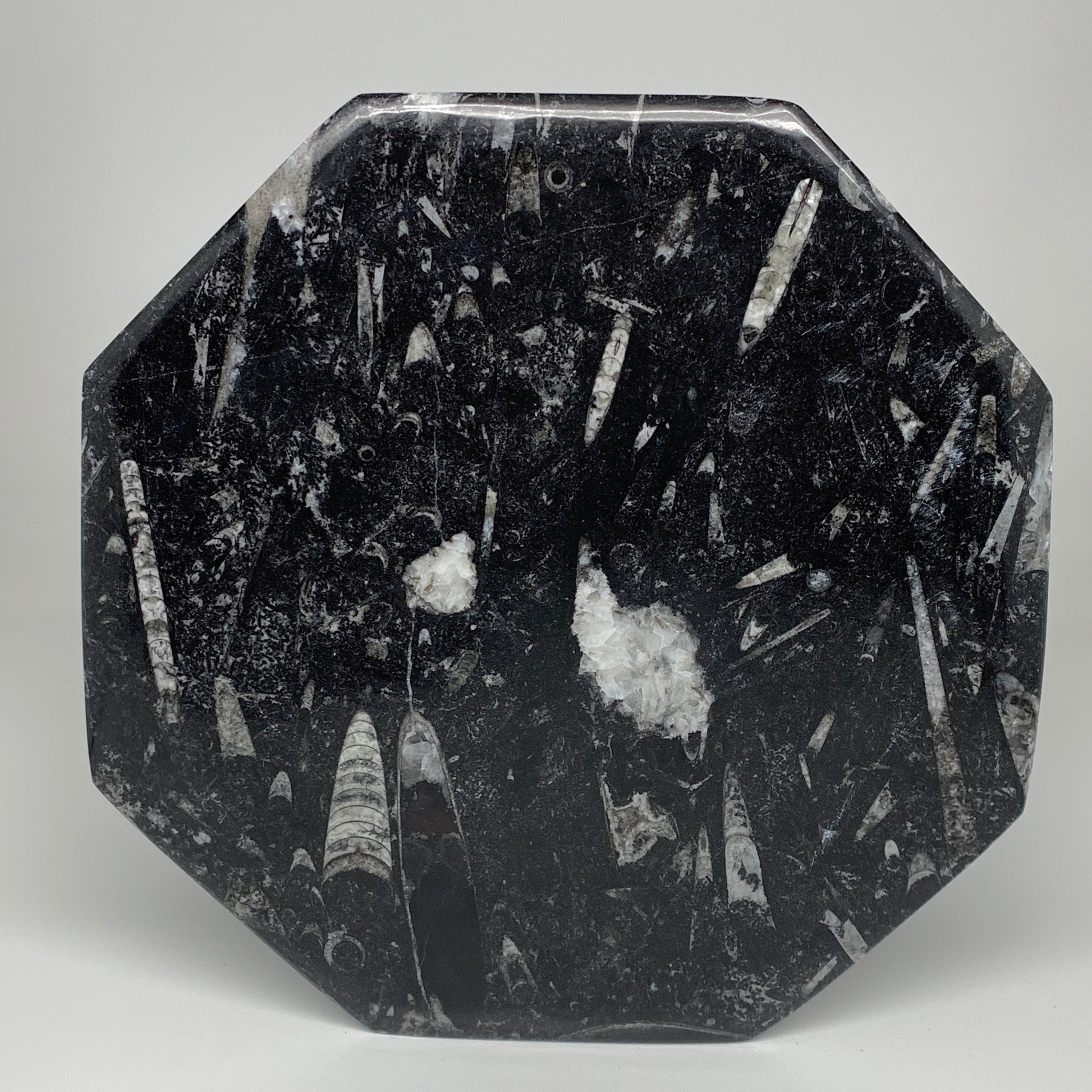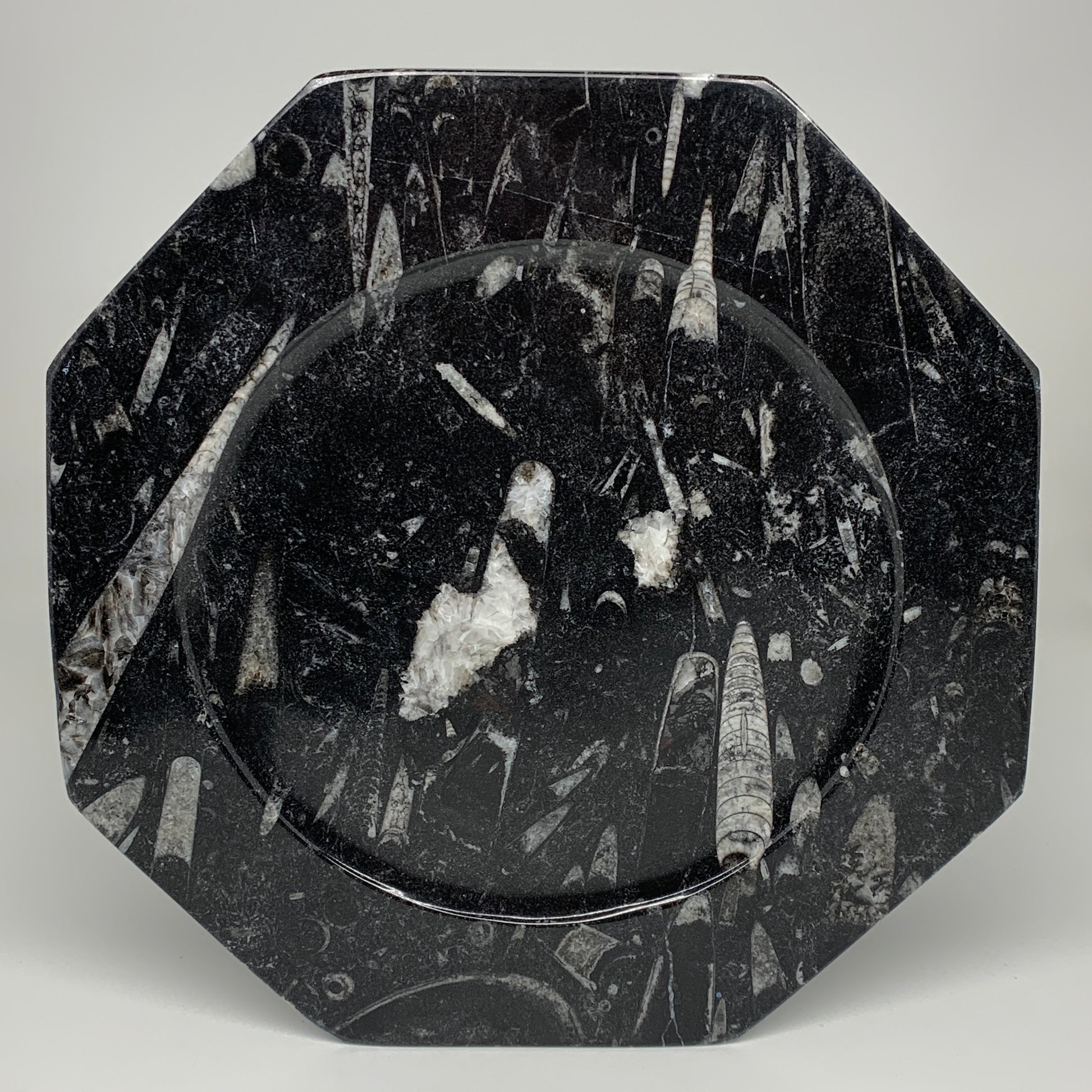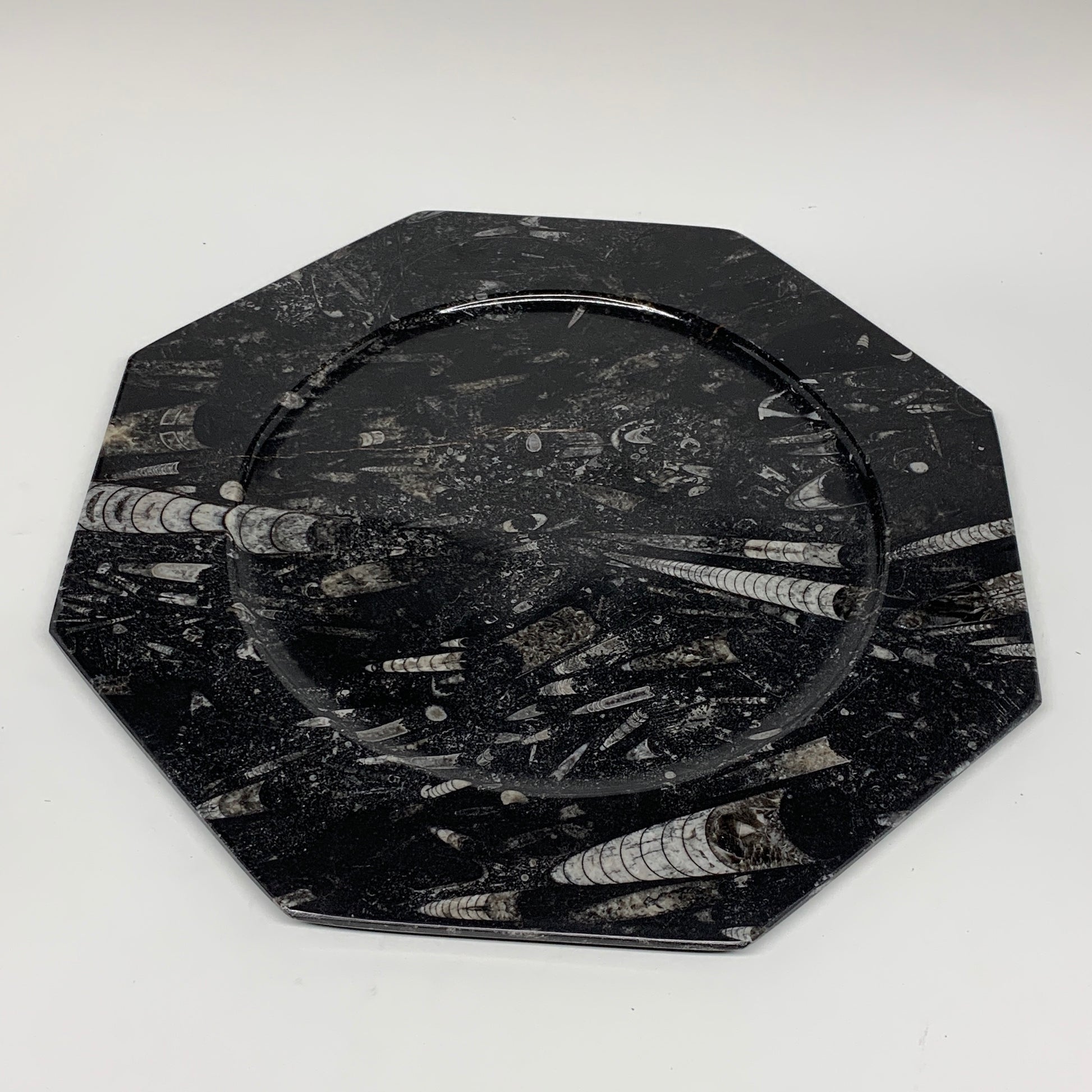 2pcs, 12" Large Octagon Shape Black Fossils Orthoceras Plates @Morocco, B8302