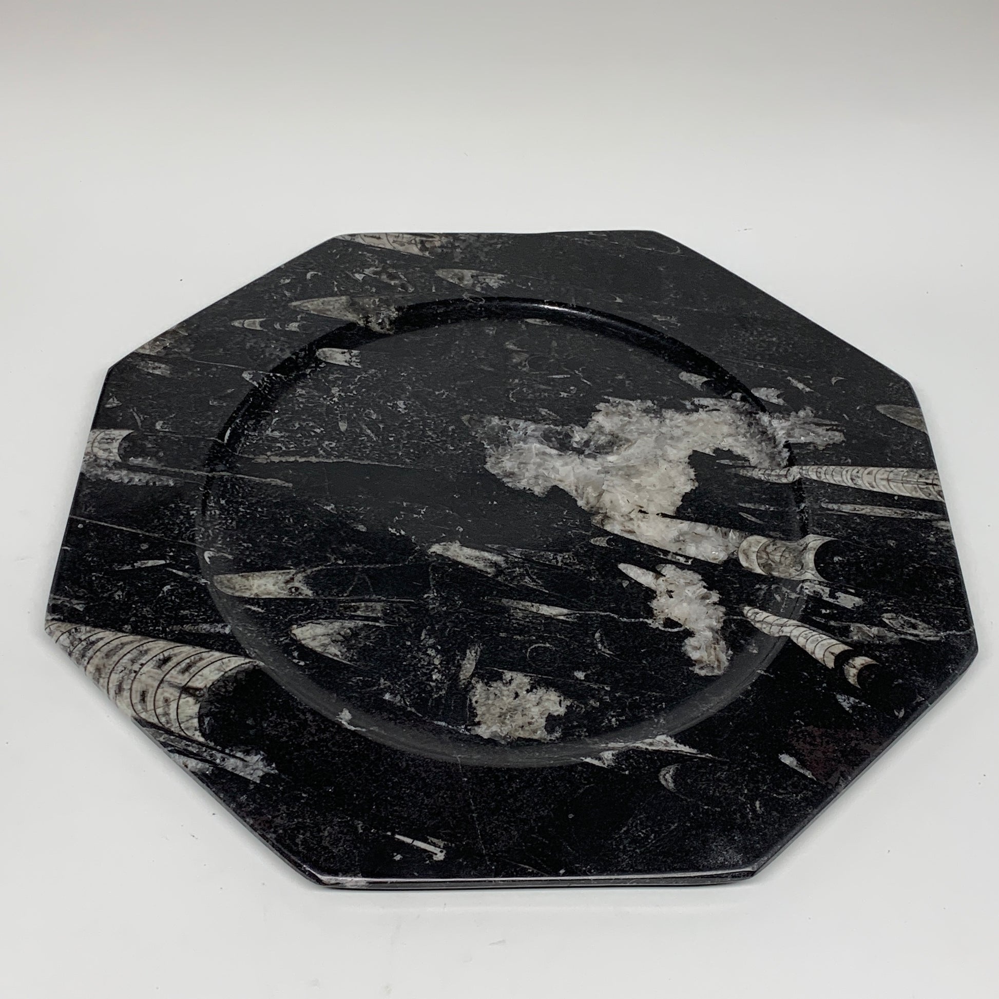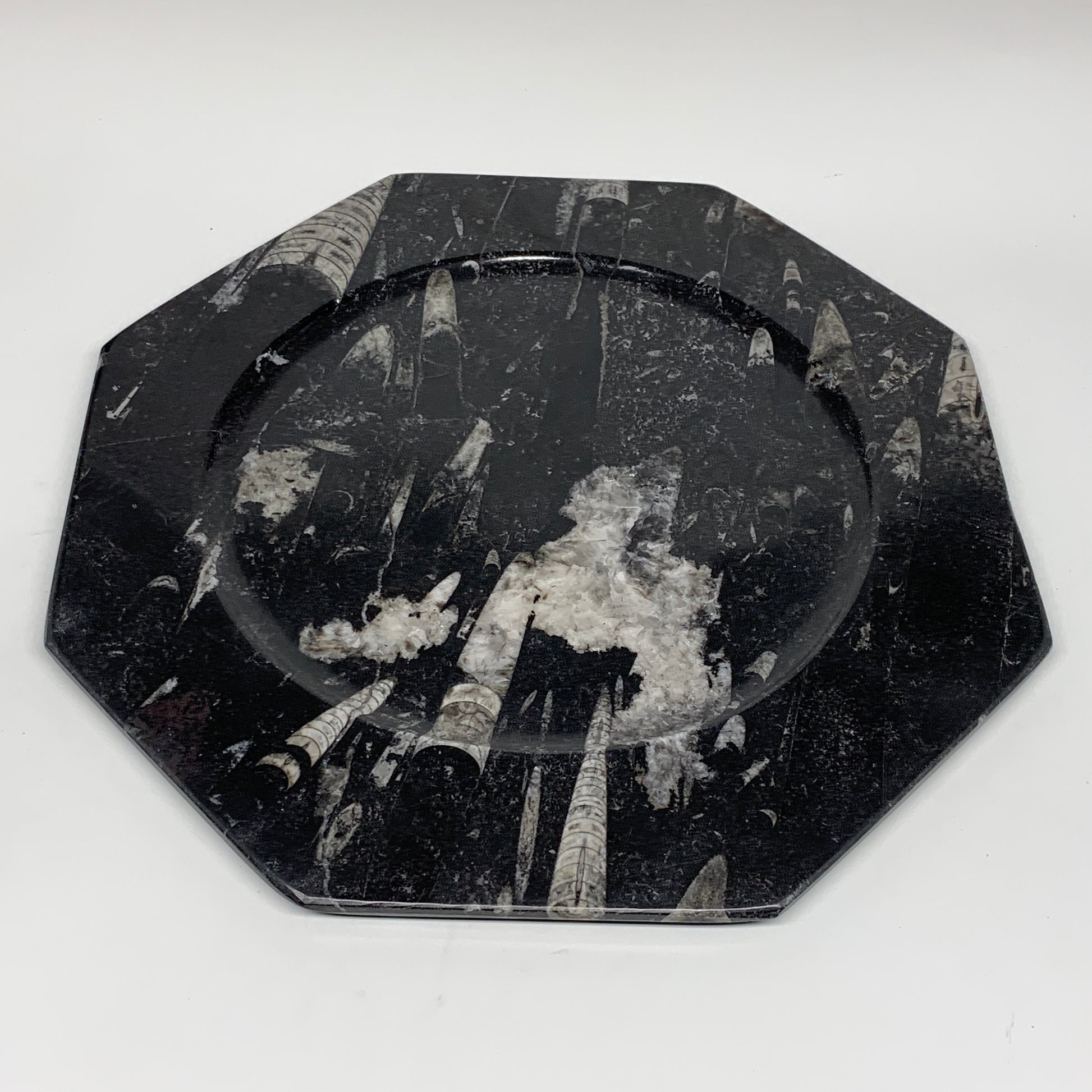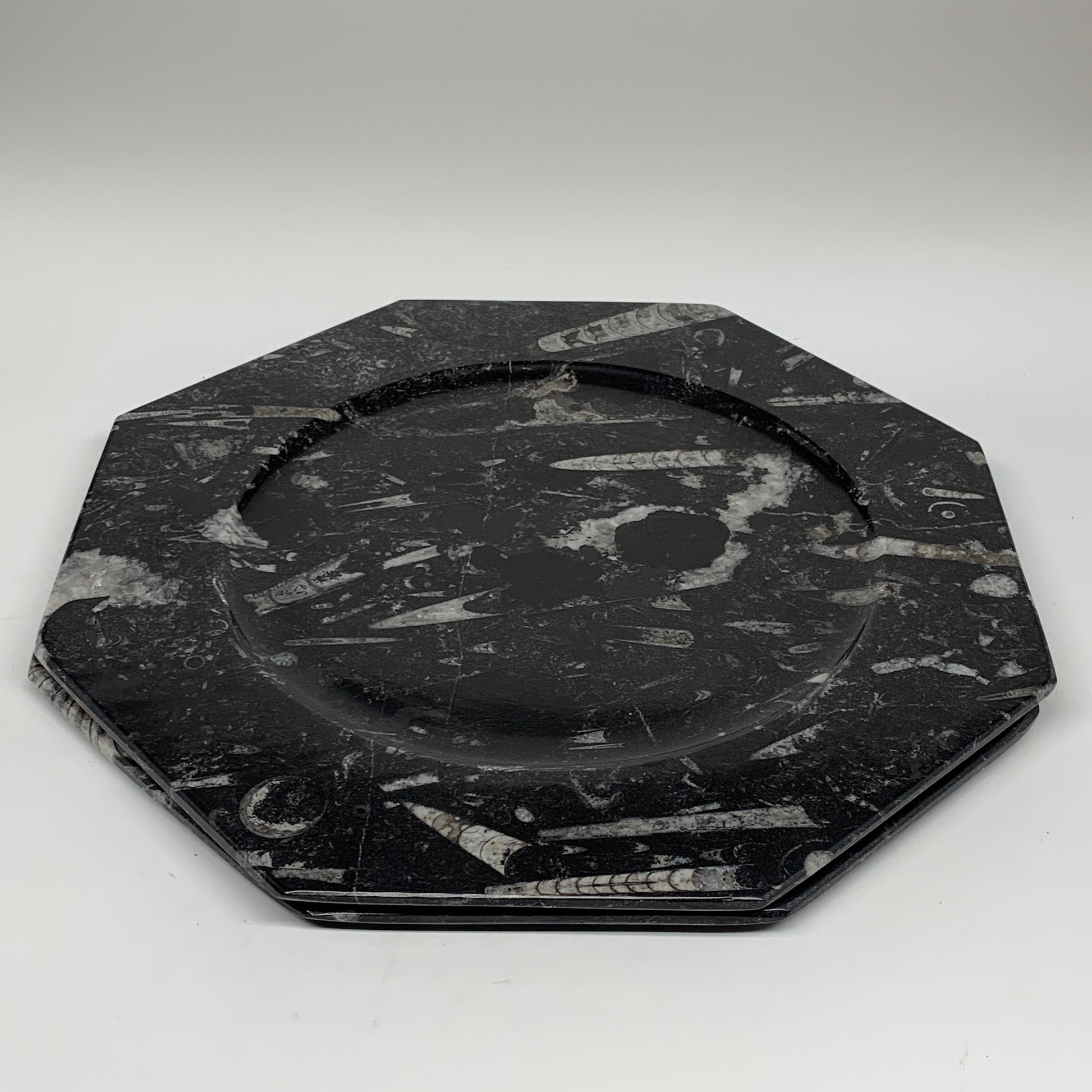 2pcs, 12" Large Octagon Shape Black Fossils Orthoceras Plates @Morocco, B8305