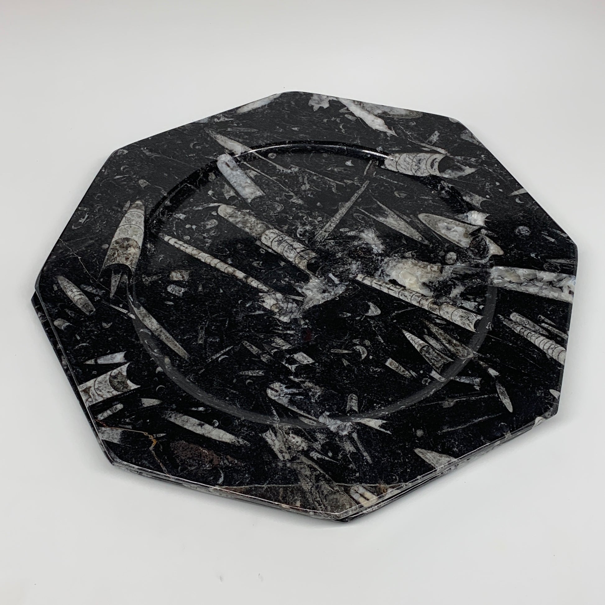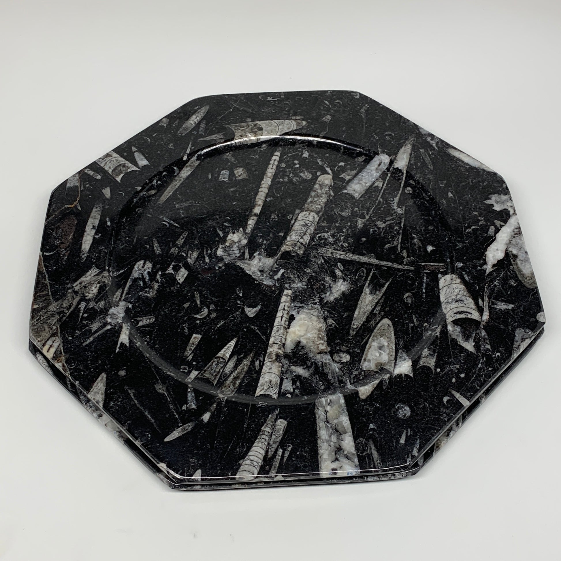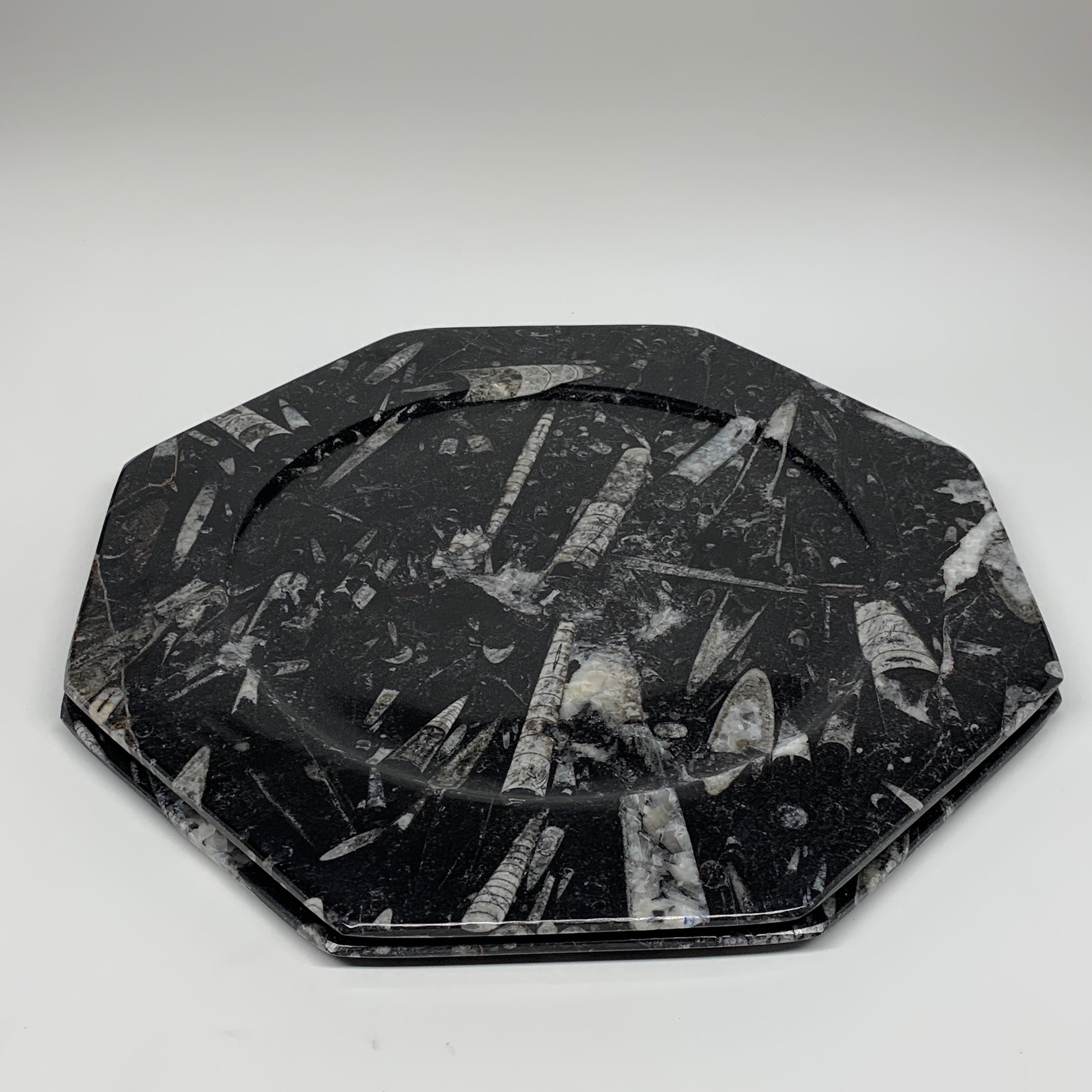 2pcs, 12" Large Octagon Shape Black Fossils Orthoceras Plates @Morocco, B8319