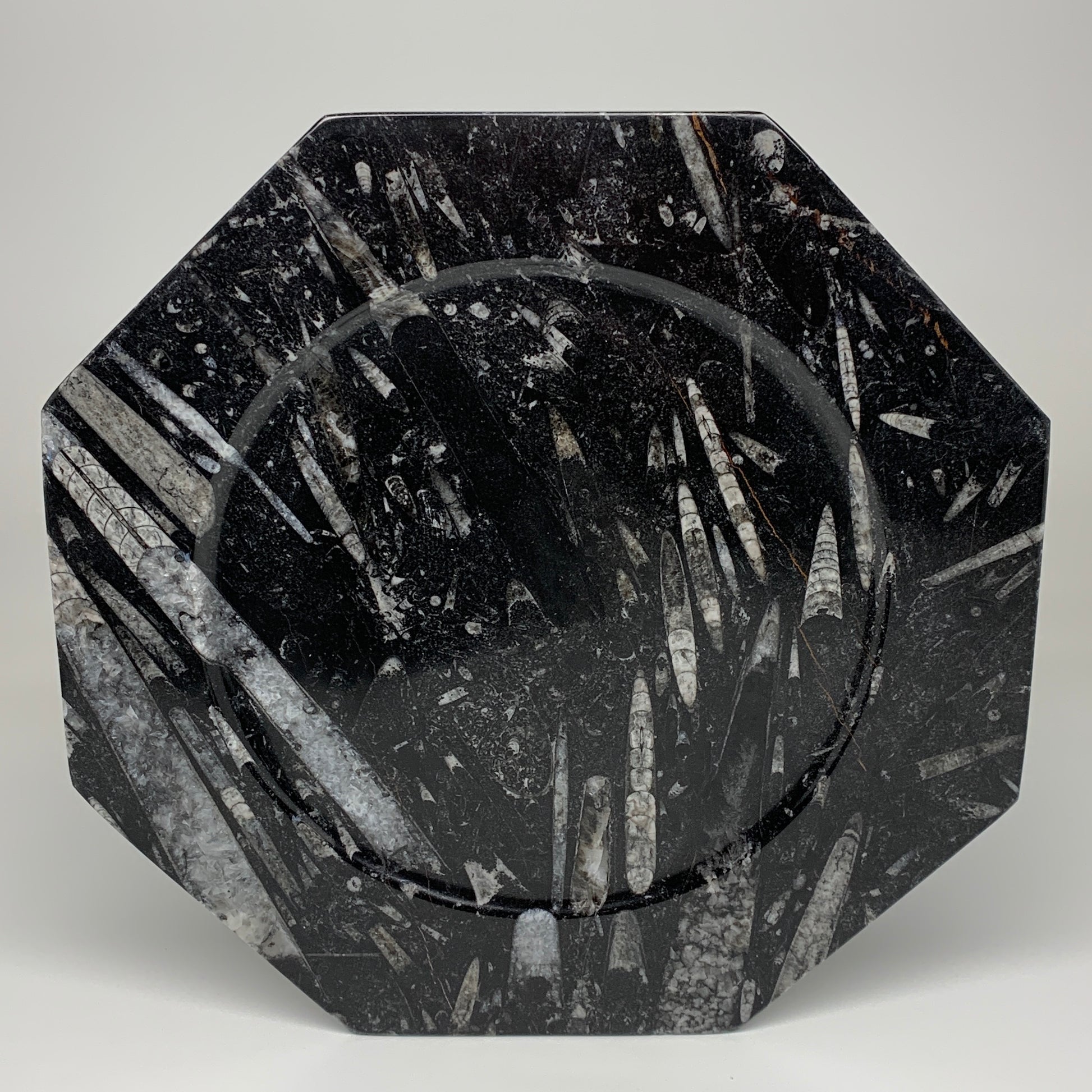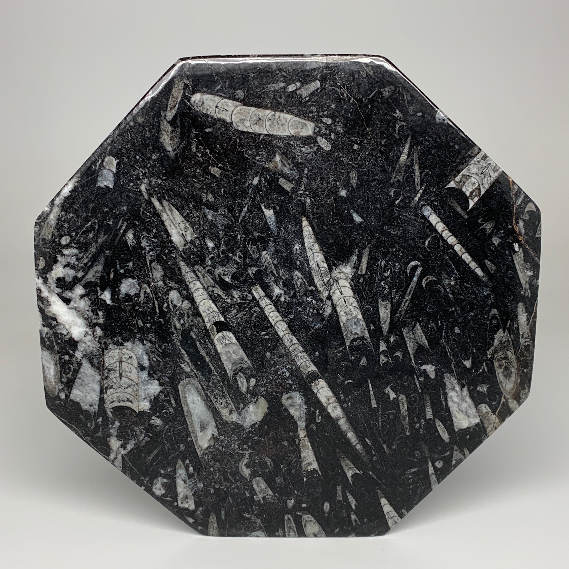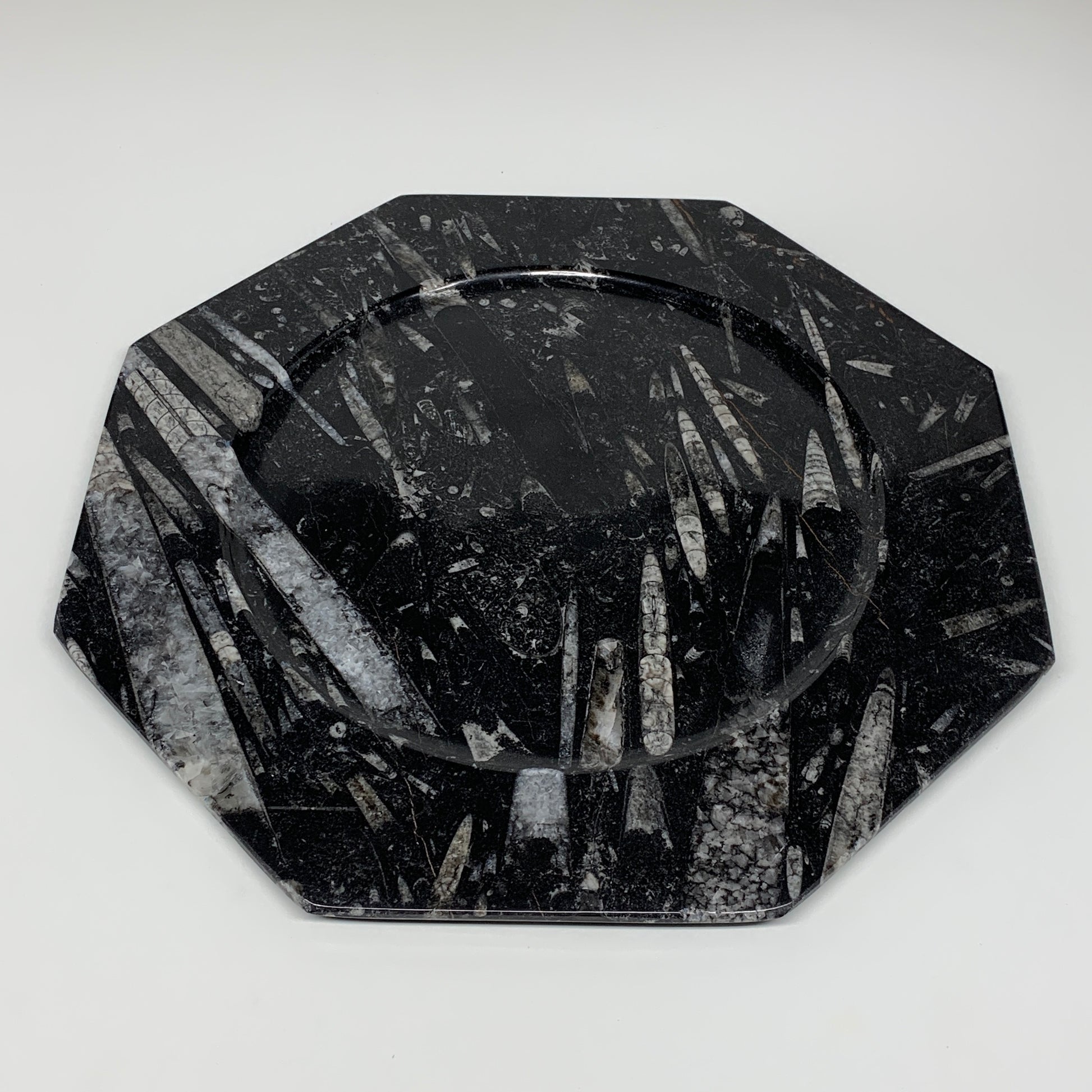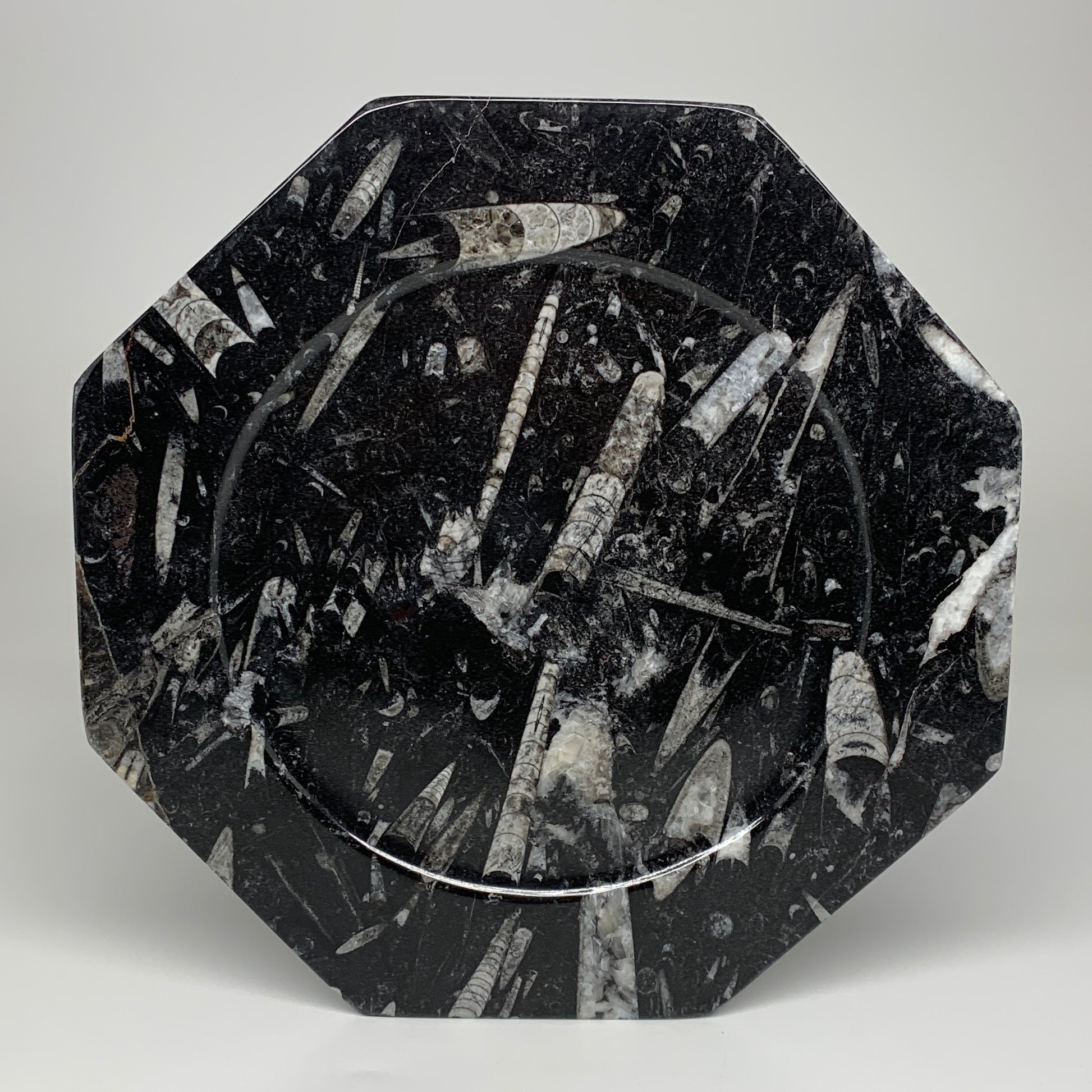 2pcs, 12" Large Octagon Shape Black Fossils Orthoceras Plates @Morocco, B8319