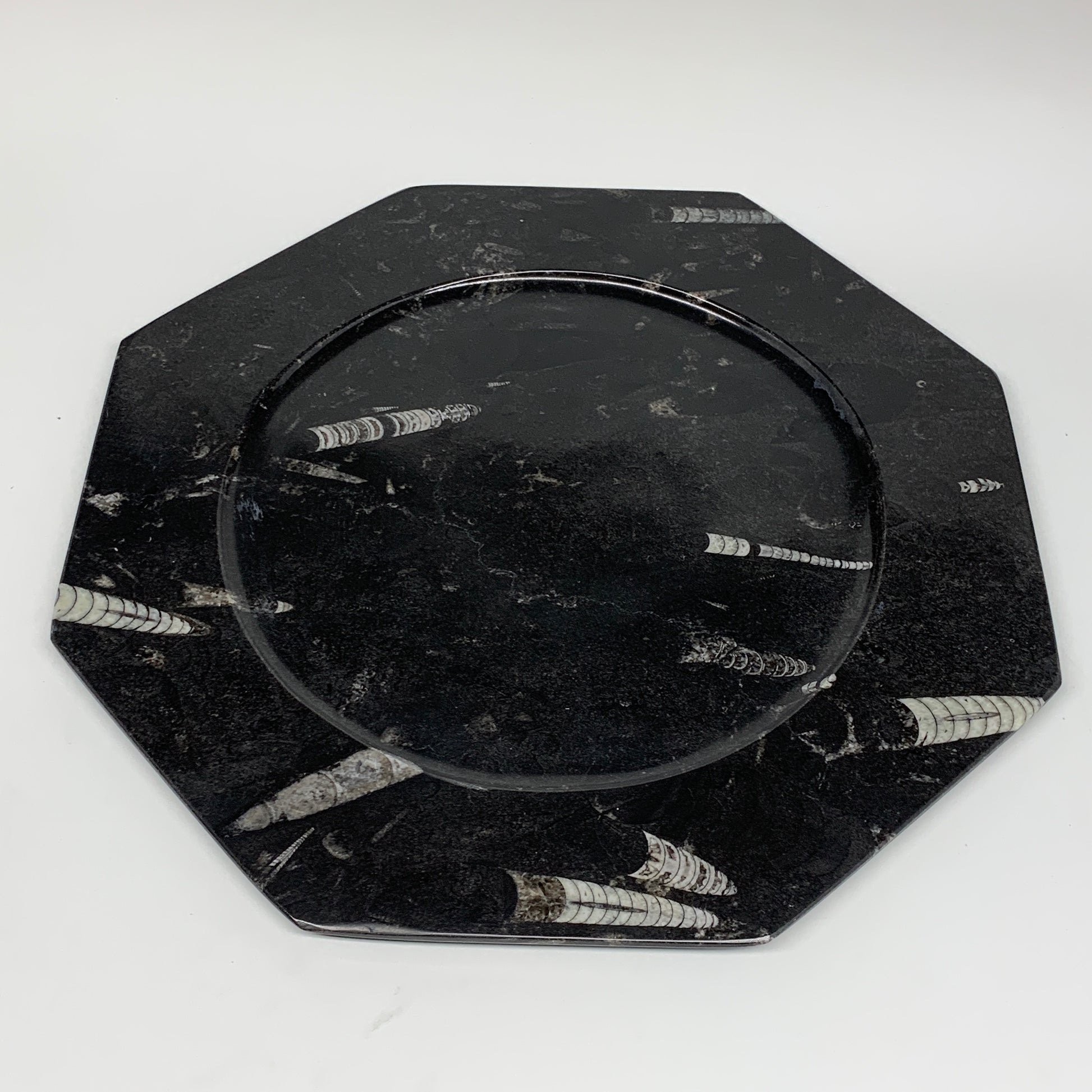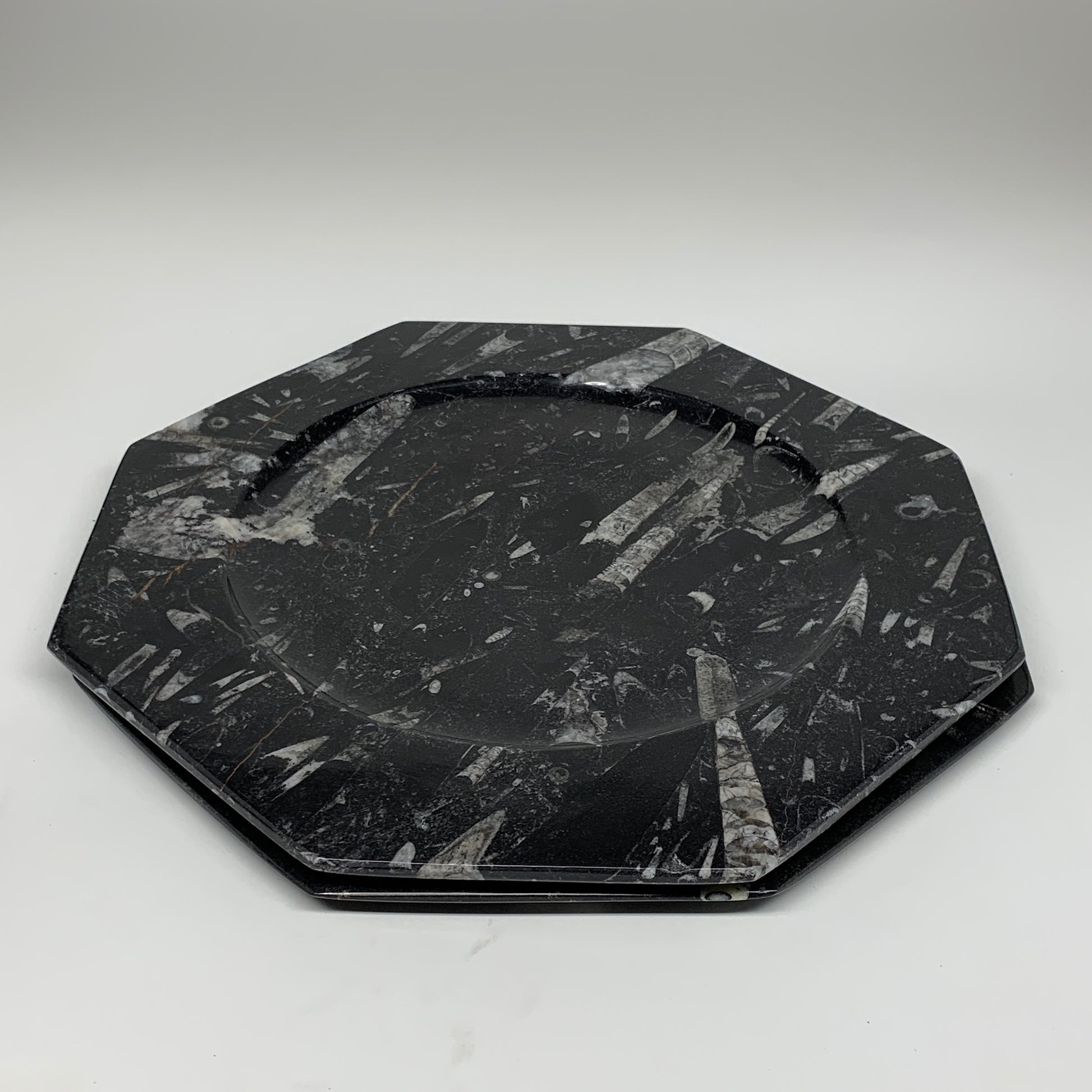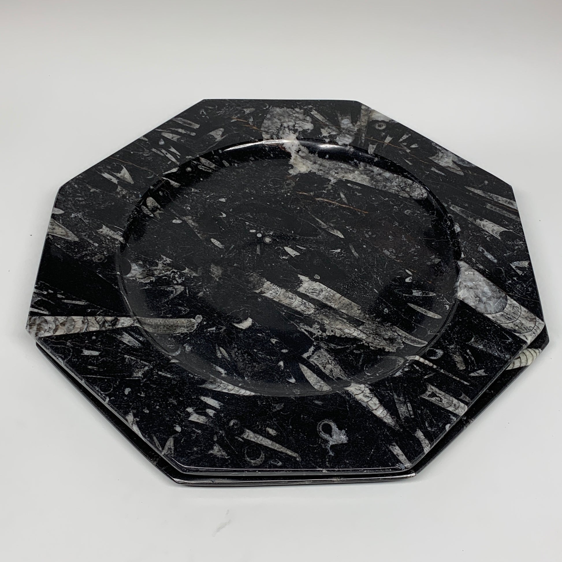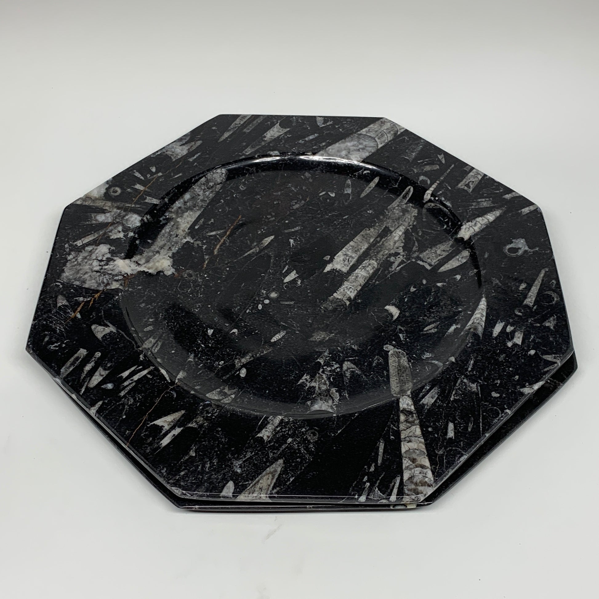 2pcs, 12" Large Octagon Shape Black Fossils Orthoceras Plates @Morocco, B8324