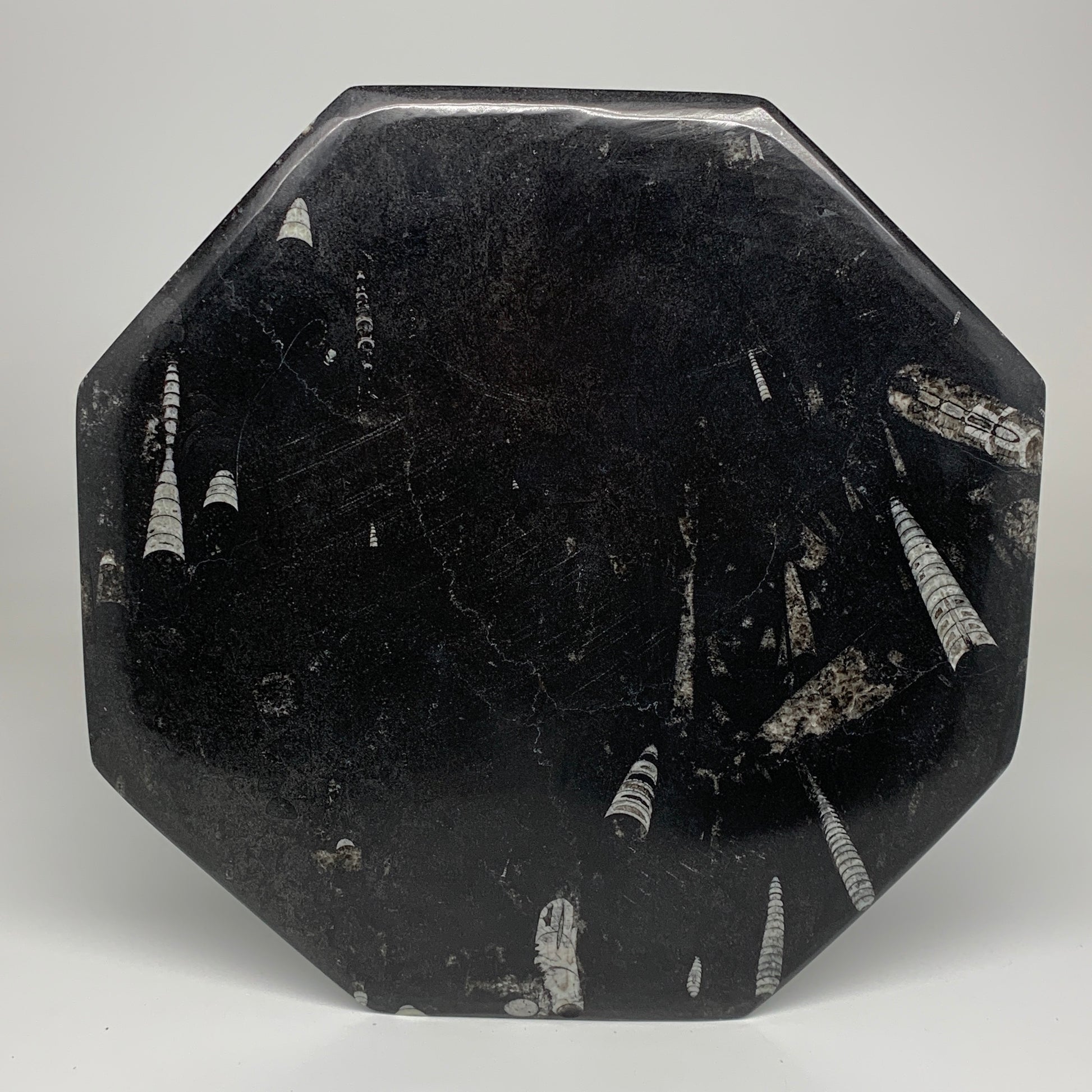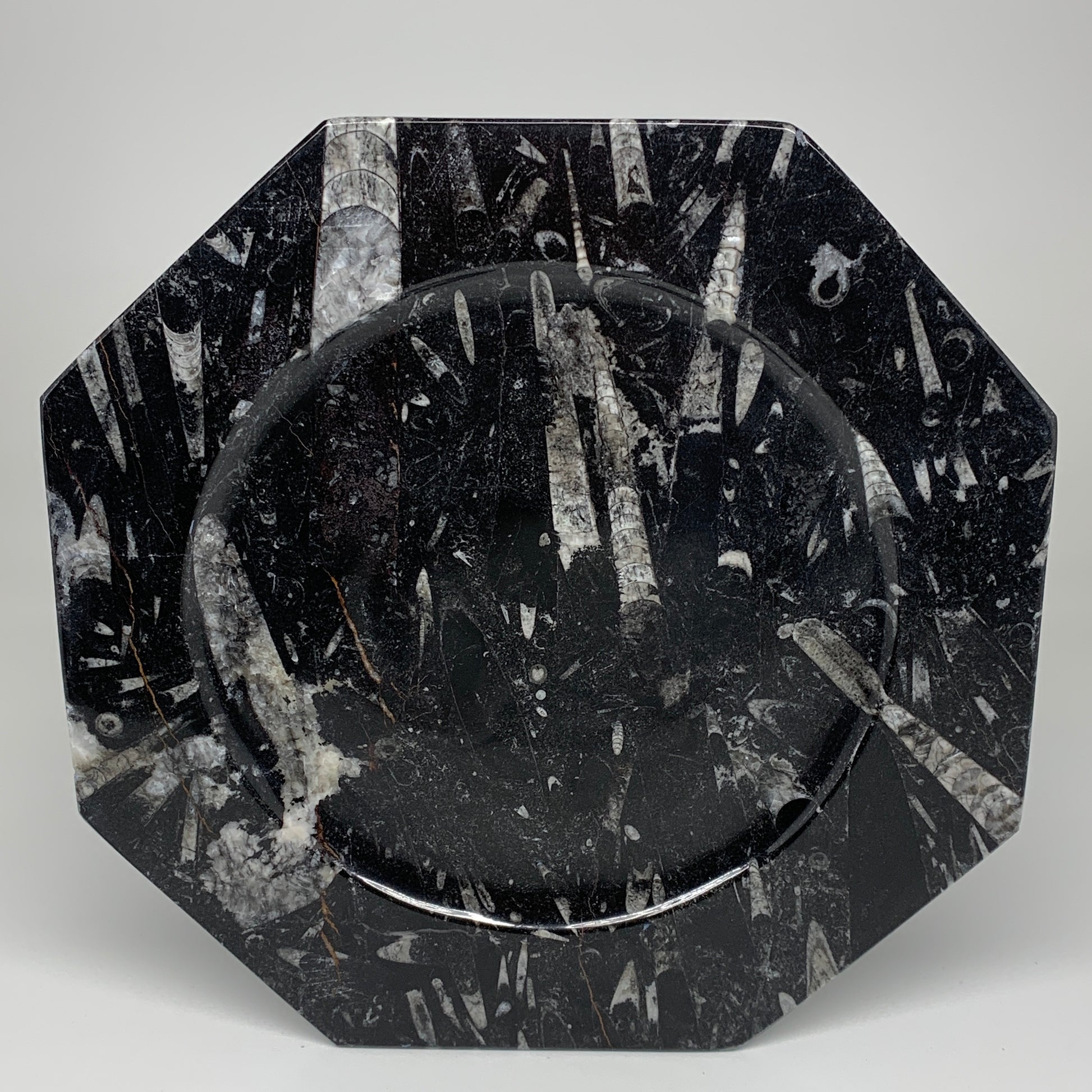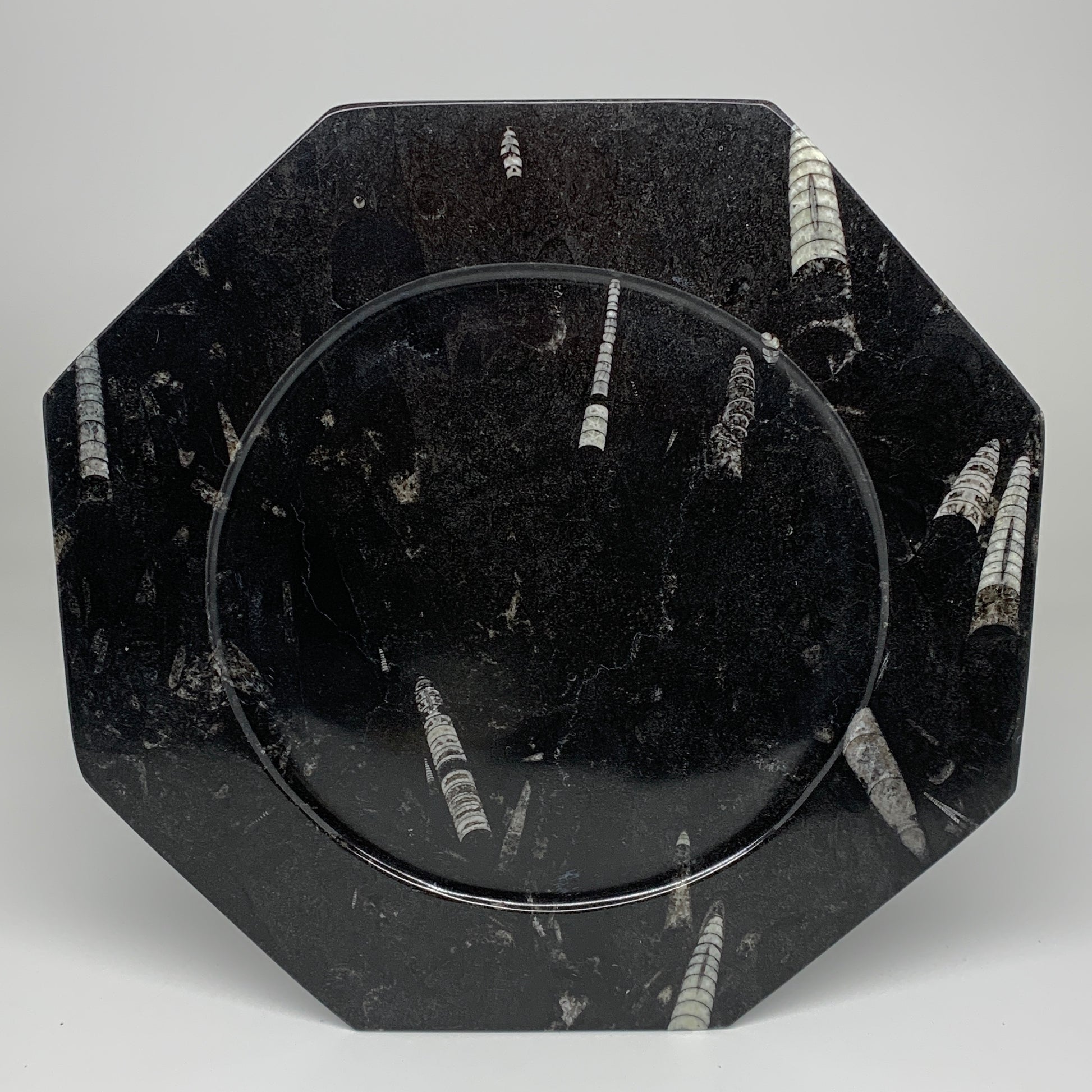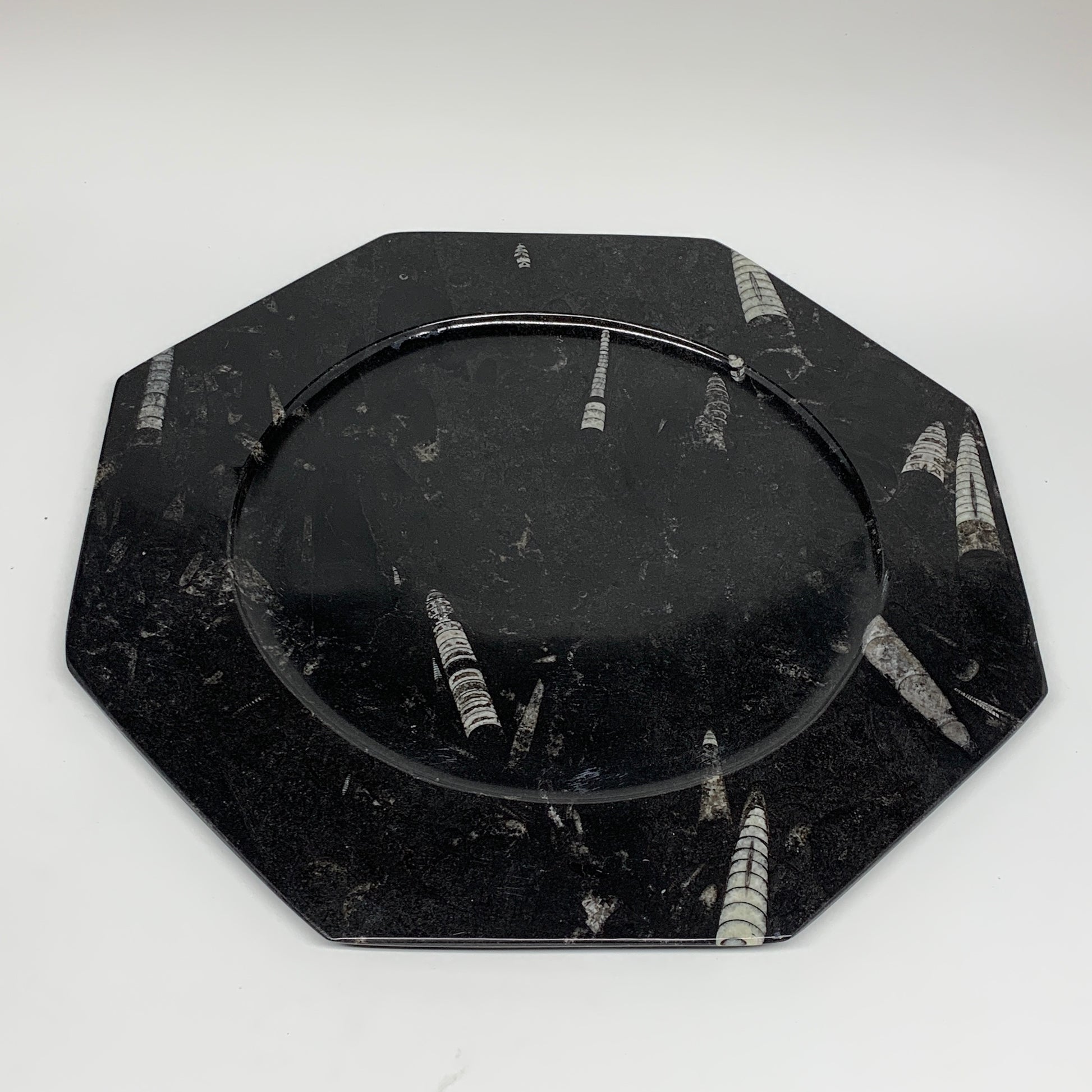 2pcs, 12" Large Octagon Shape Black Fossils Orthoceras Plates @Morocco, B8324
