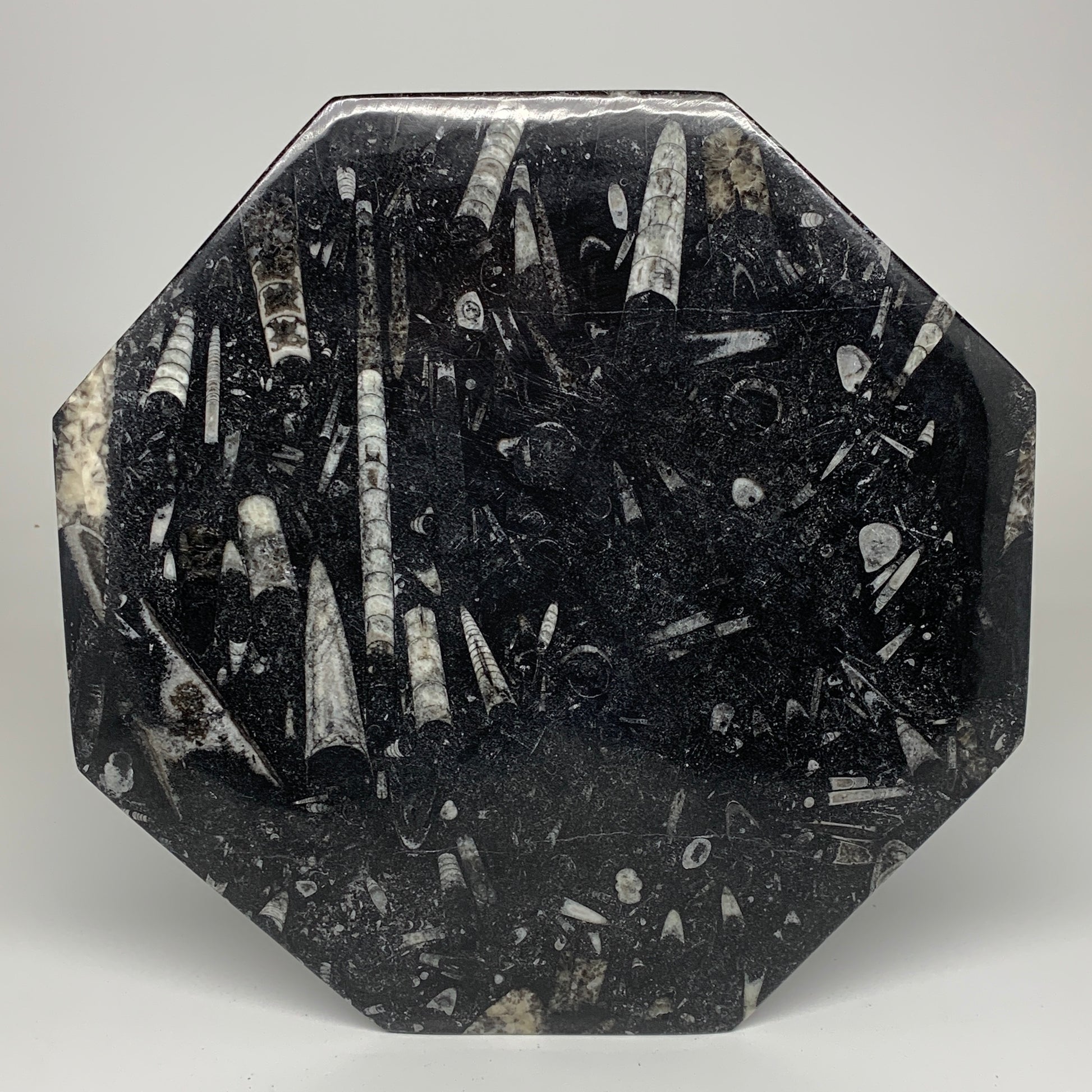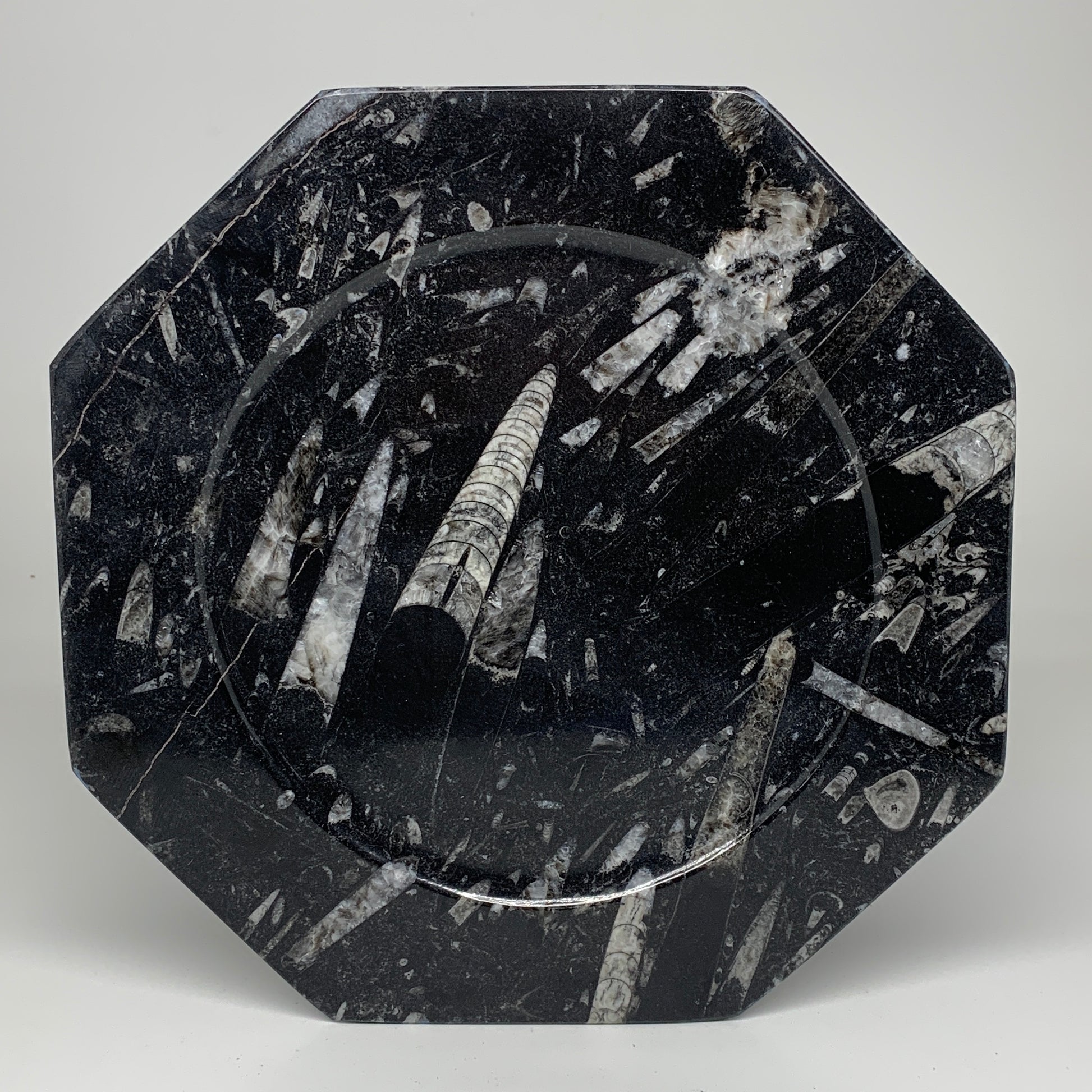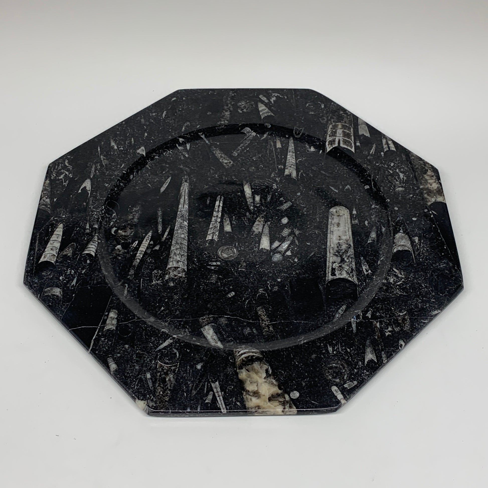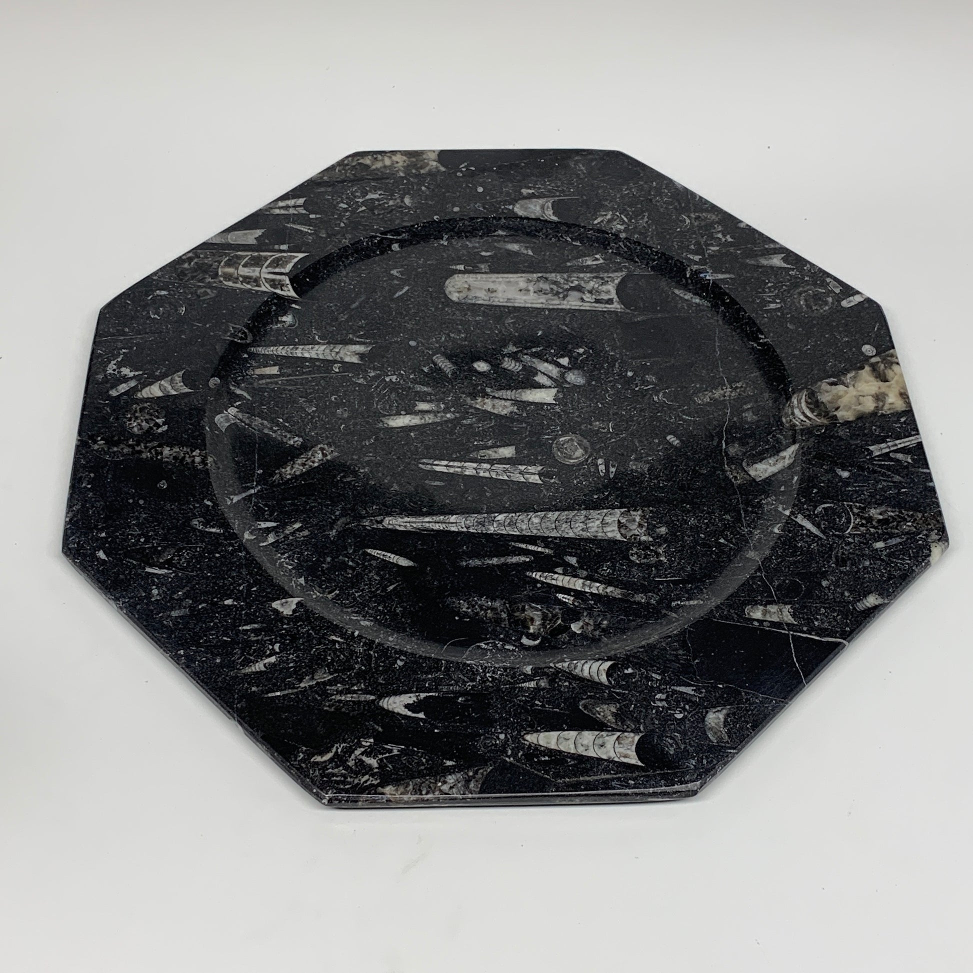 2pcs, 12" Large Octagon Shape Black Fossils Orthoceras Plates @Morocco, B8354