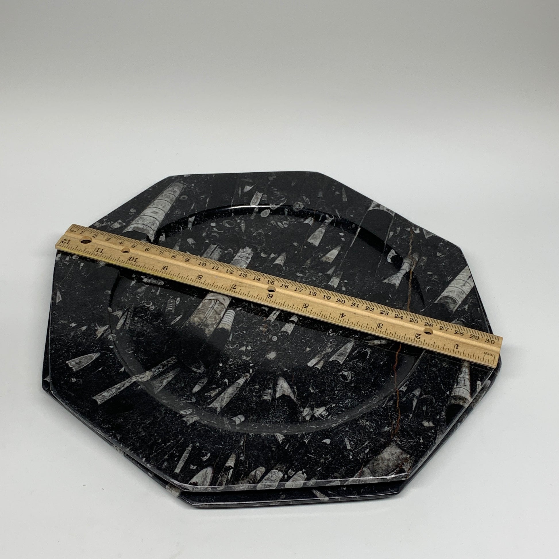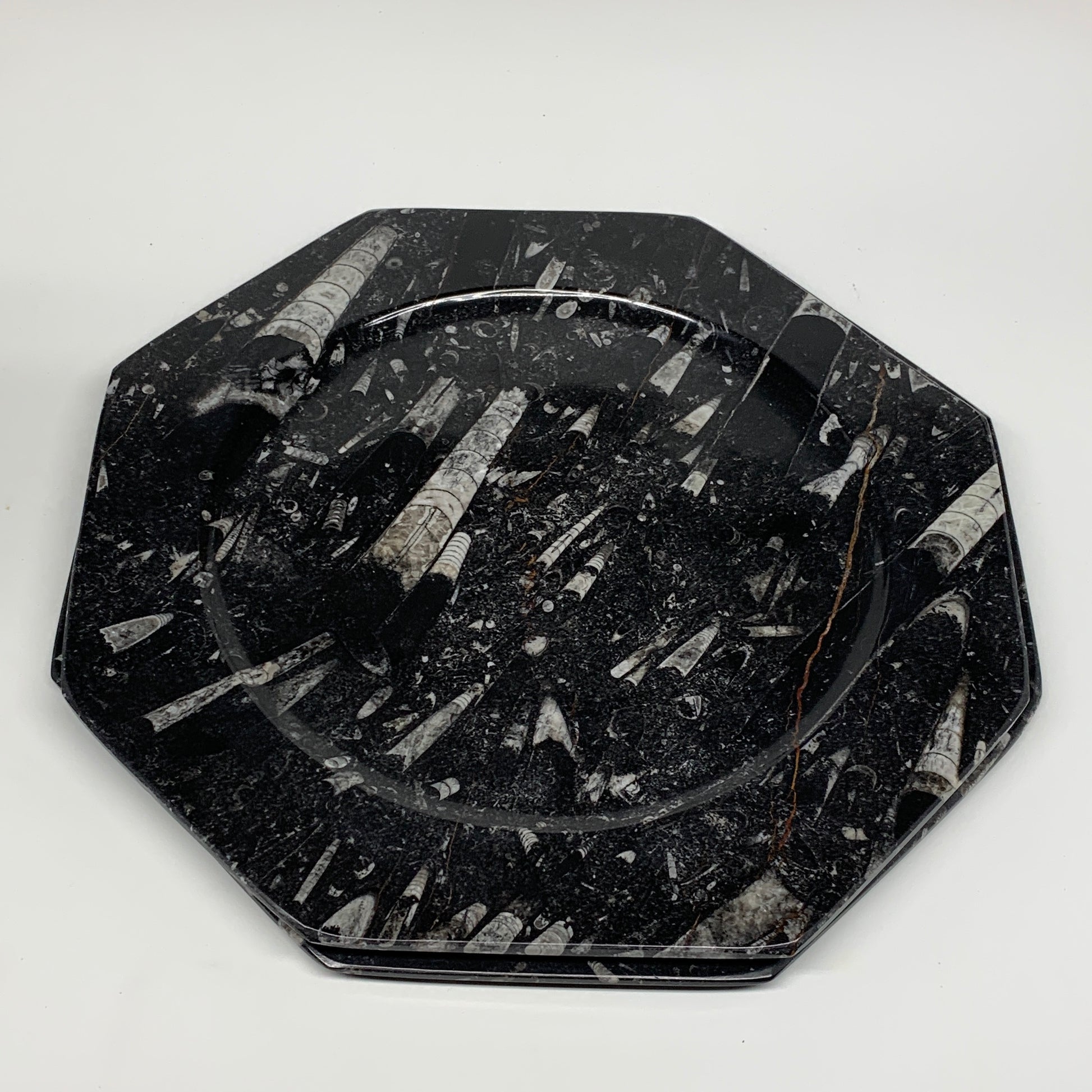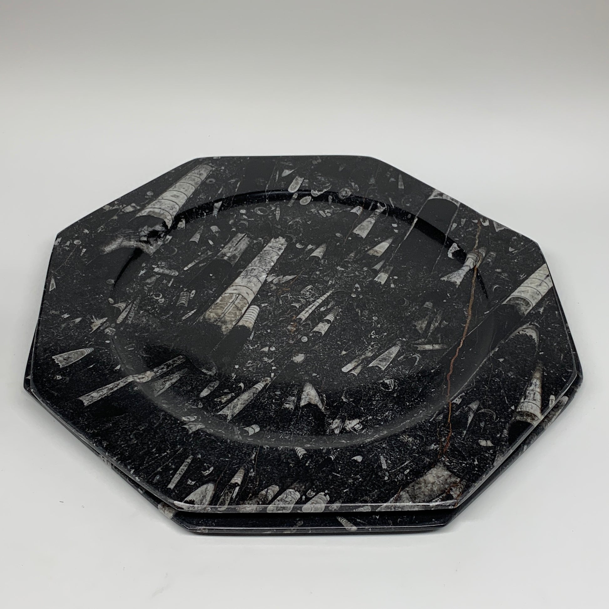 2pcs, 12" Large Octagon Shape Black Fossils Orthoceras Plates @Morocco, B8363
