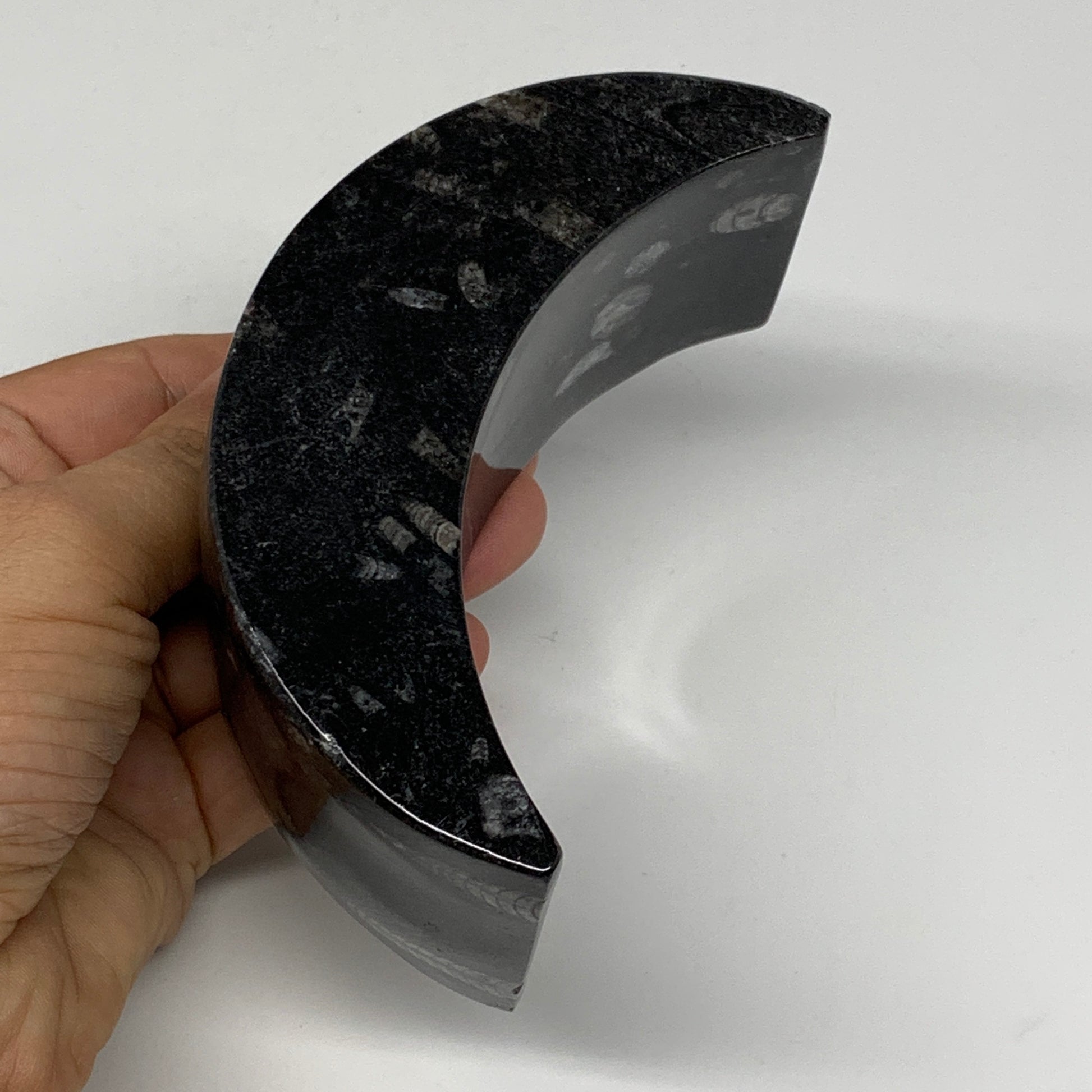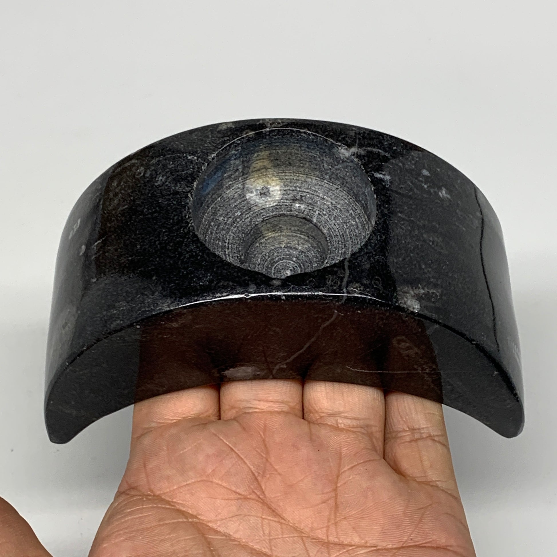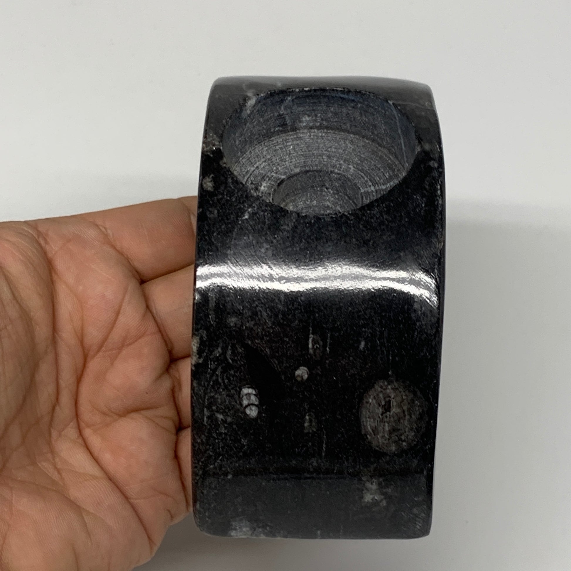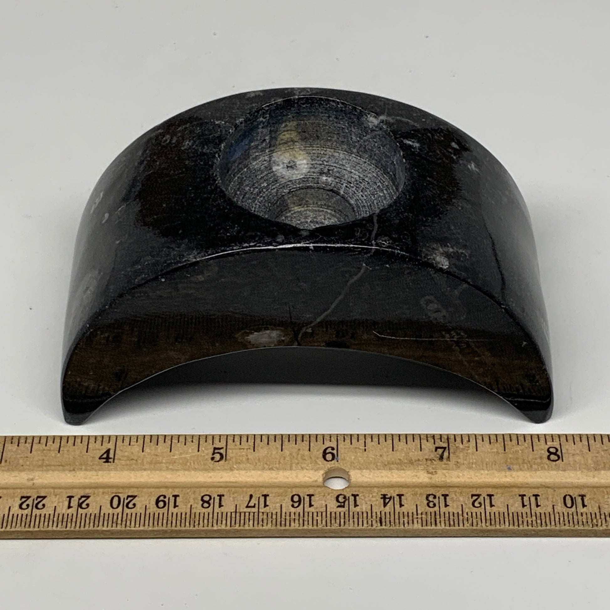 424g, 4.6" x 2" x 1.3" Moon Shape Fossils Orthoceras Candle Holder, B8694