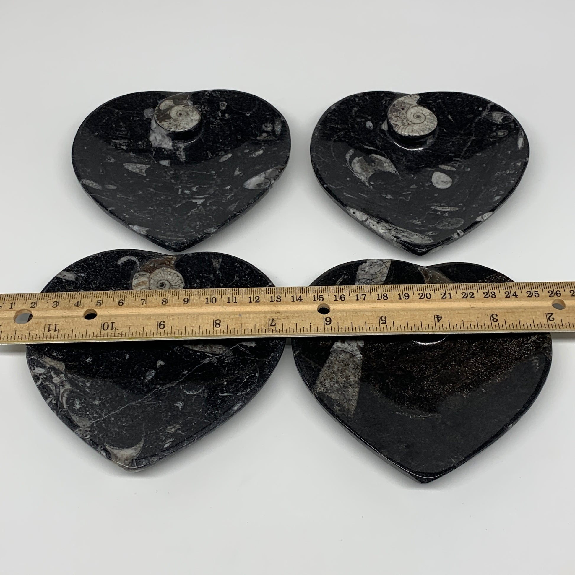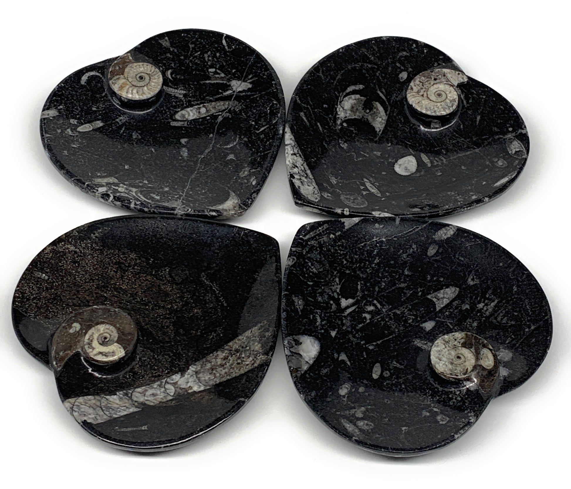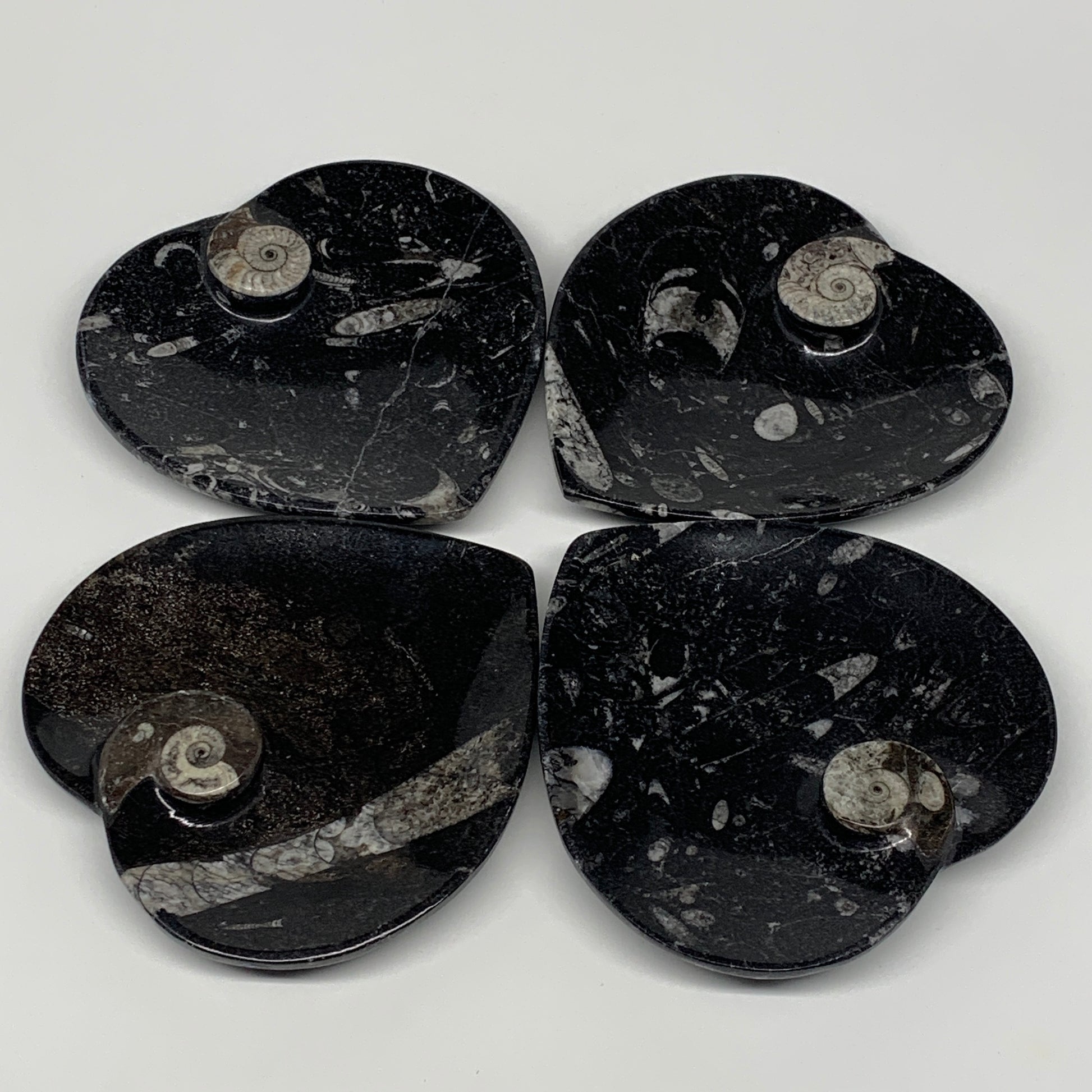 4Pcs, 4.8"x4.7" Small Heart Fossils Orthoceras Ammonite Bowls @Morocco, B8786