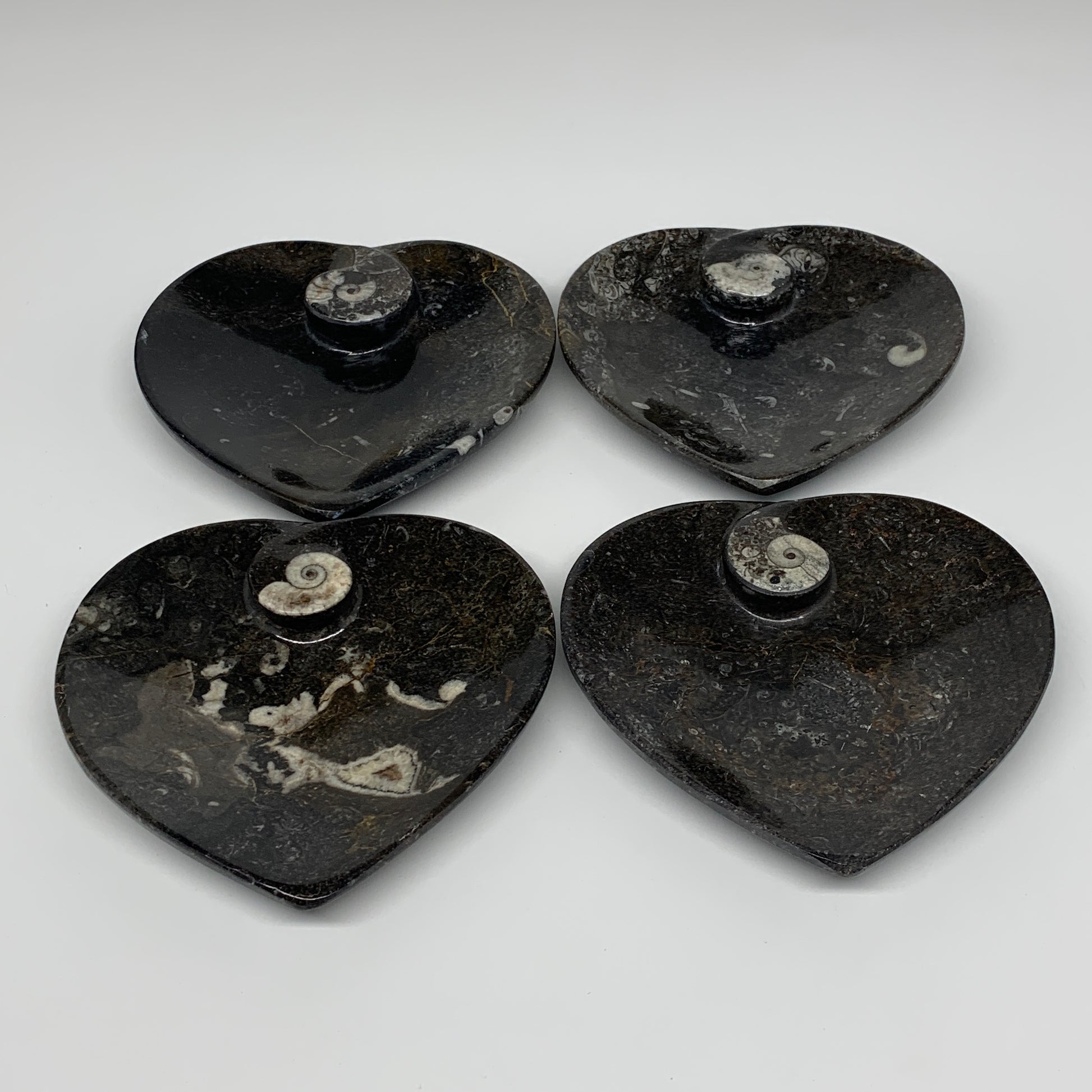 4Pcs, 4.8"x4.7" Small Heart Fossils Orthoceras Ammonite Bowls @Morocco, B8790