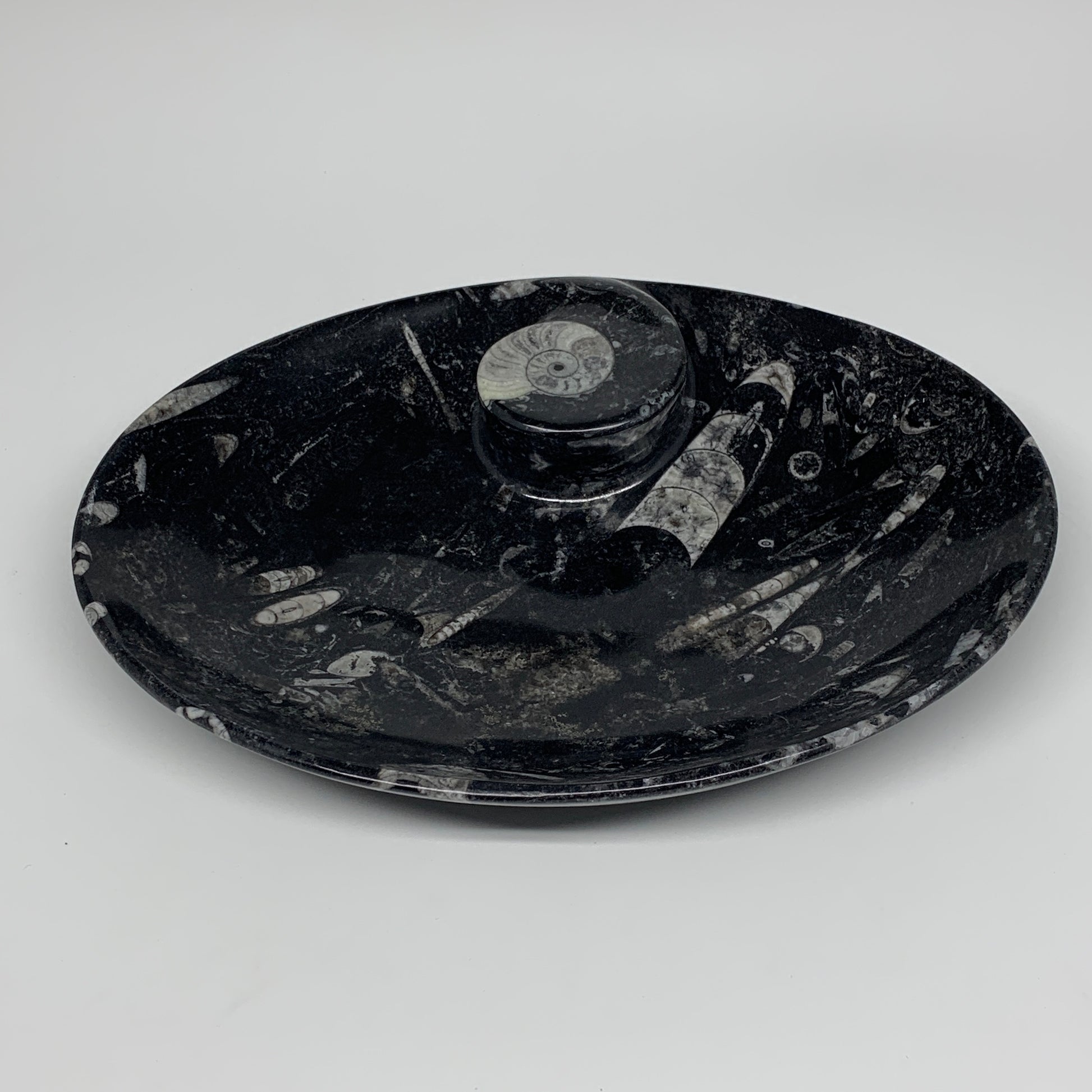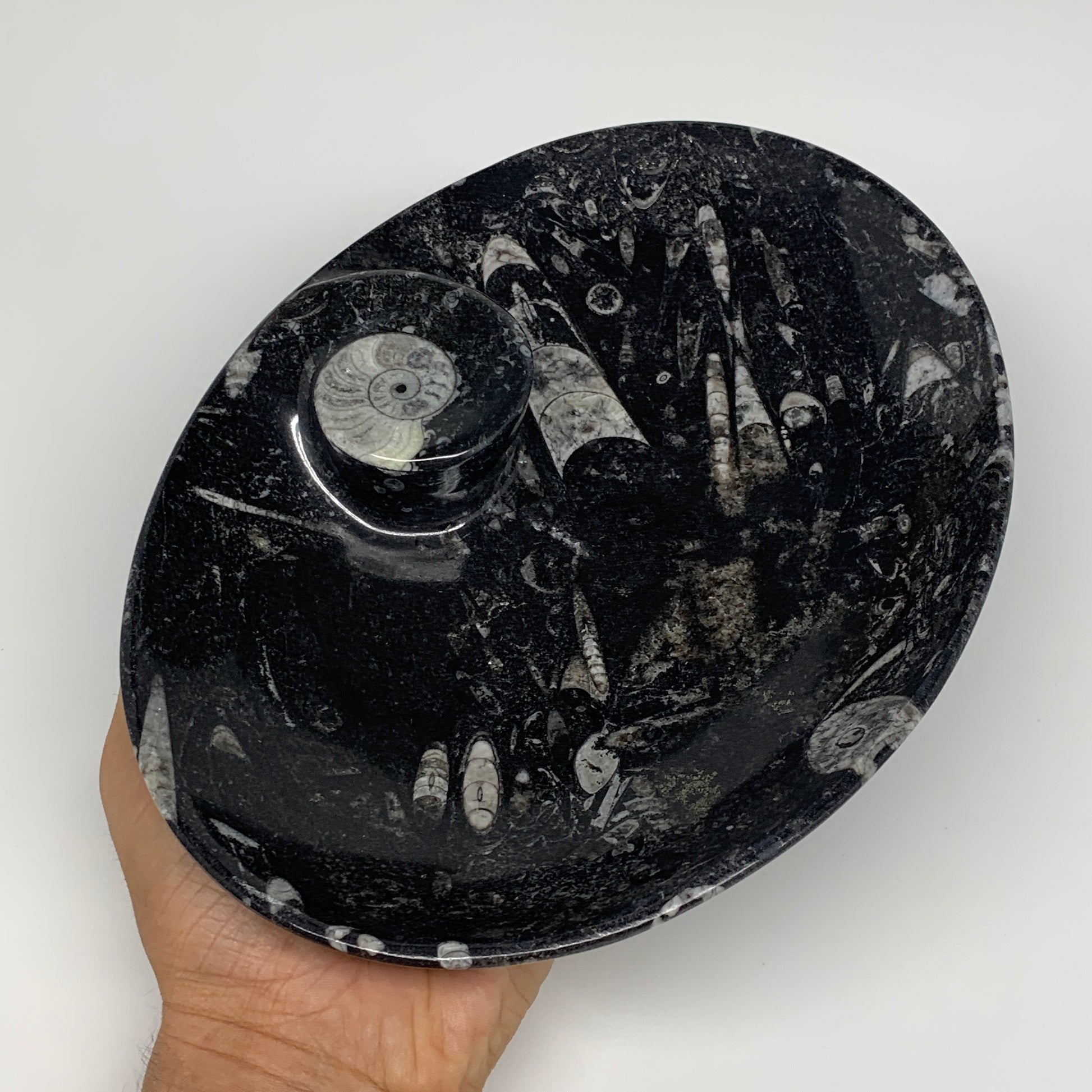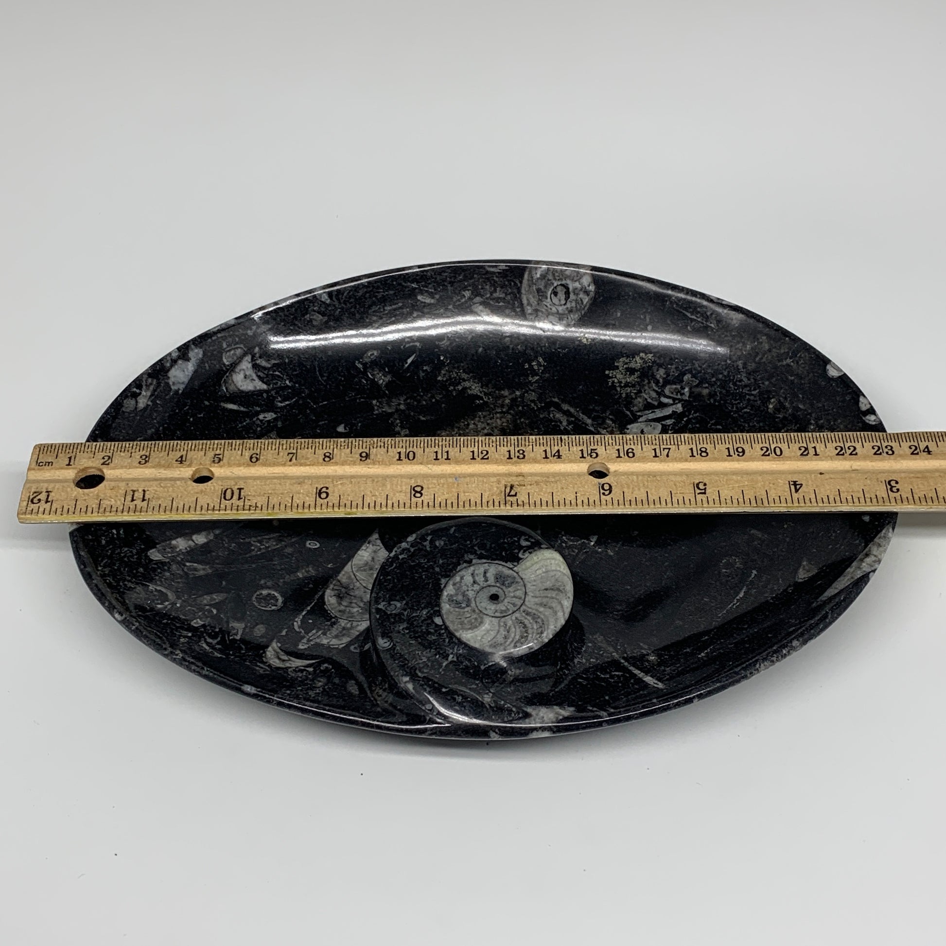 690g, 8.75"x6.5" Black Fossils Ammonite Orthoceras Bowl Oval Ring @Morocco,B8375