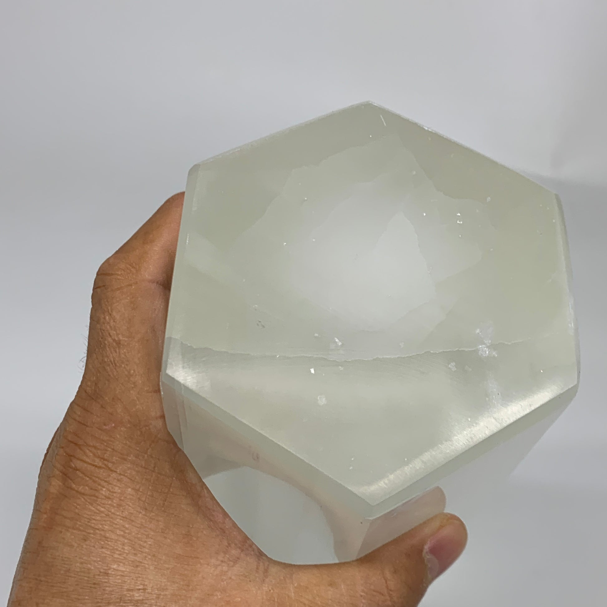 This is a natural product so specification varies from item to item. Due to its soft nature, scratches, chips, dents, Rustics, Crack looking lines, Inclusions, Repairs and fractures looking lines are very common in selenites. Therefore, please expect all Selenite products to have some minor issues & imperfections.