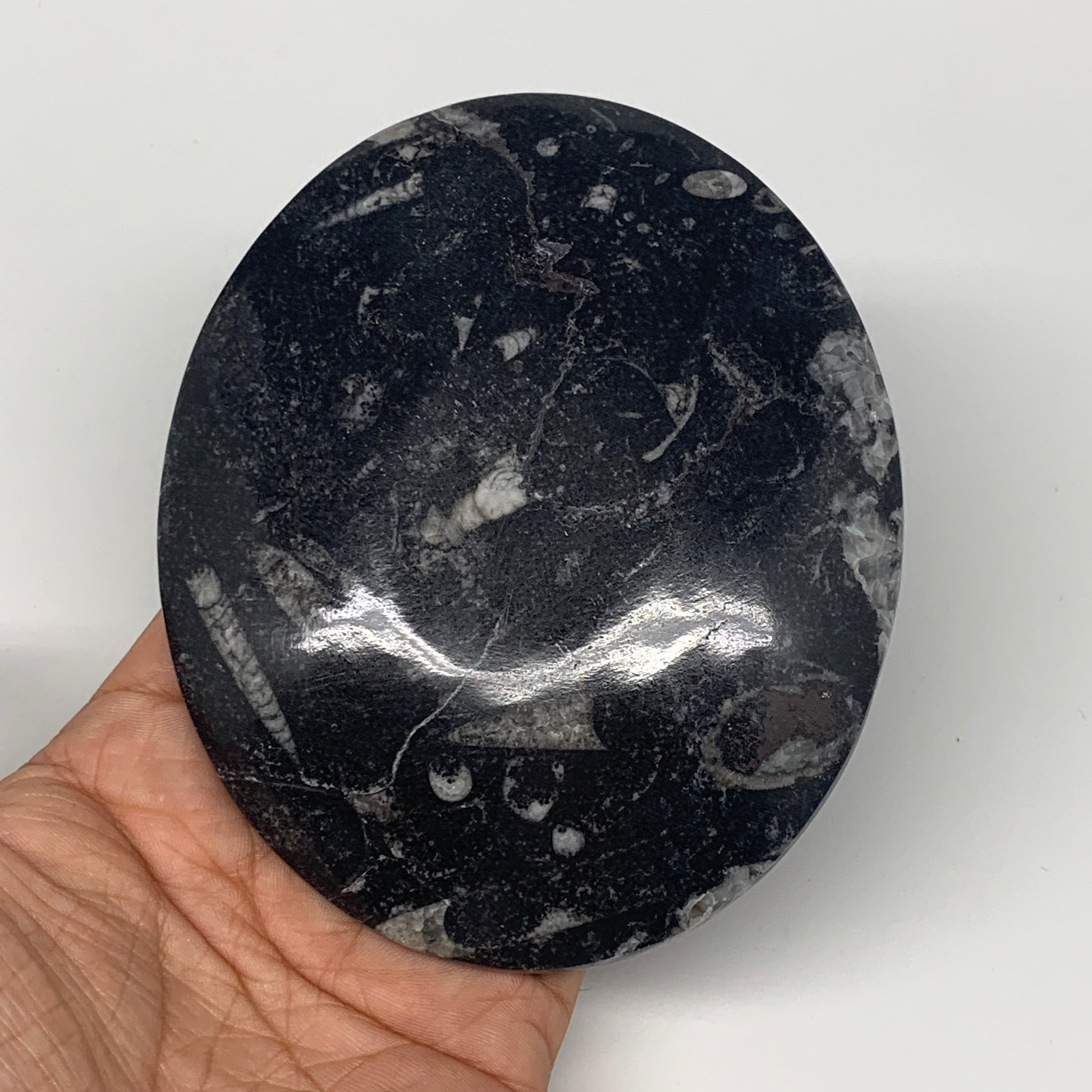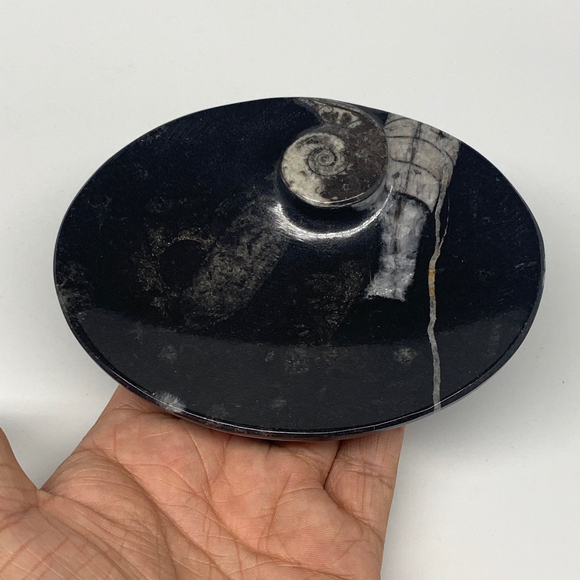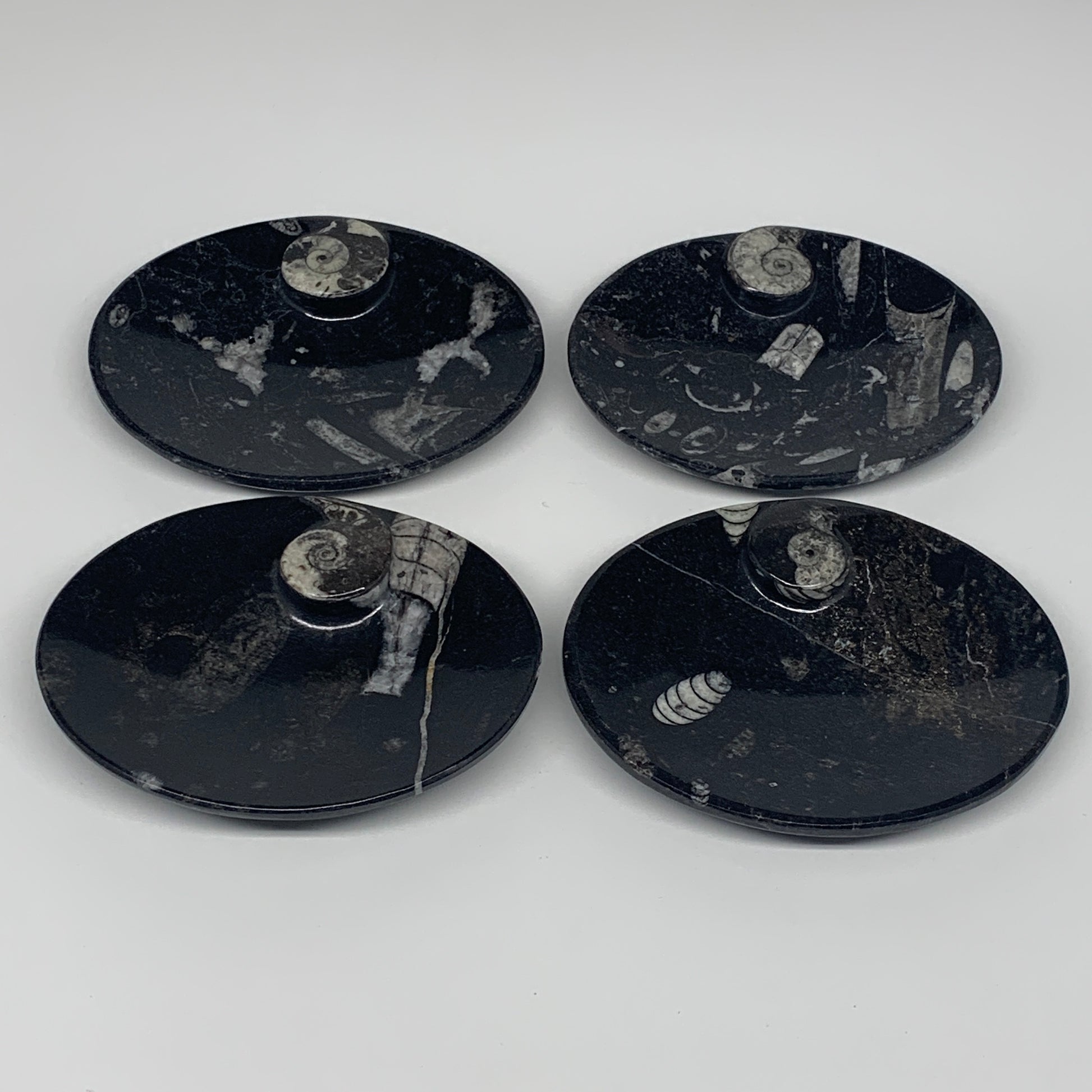 718g, 4pcs, 4.7"x3.8" Small Black Fossils Ammonite Orthoceras Bowl Oval Ring,B88