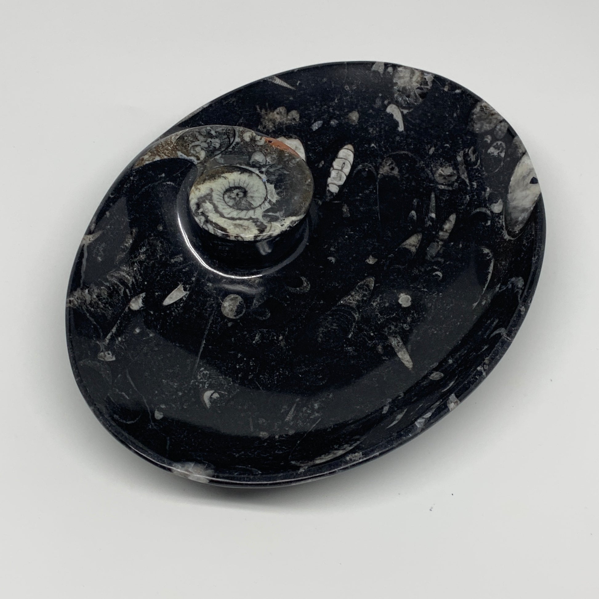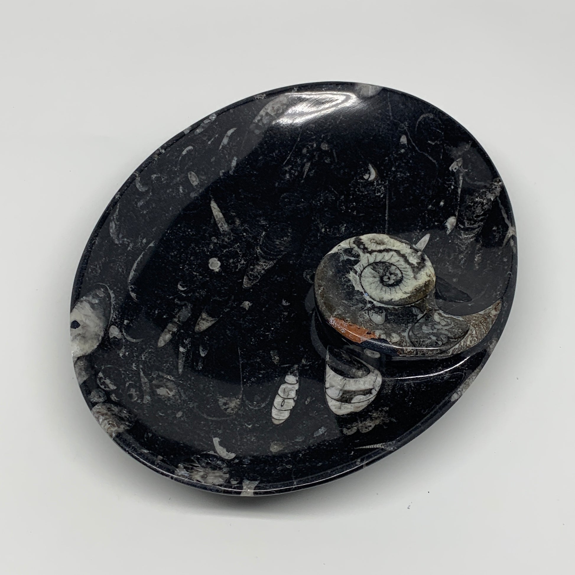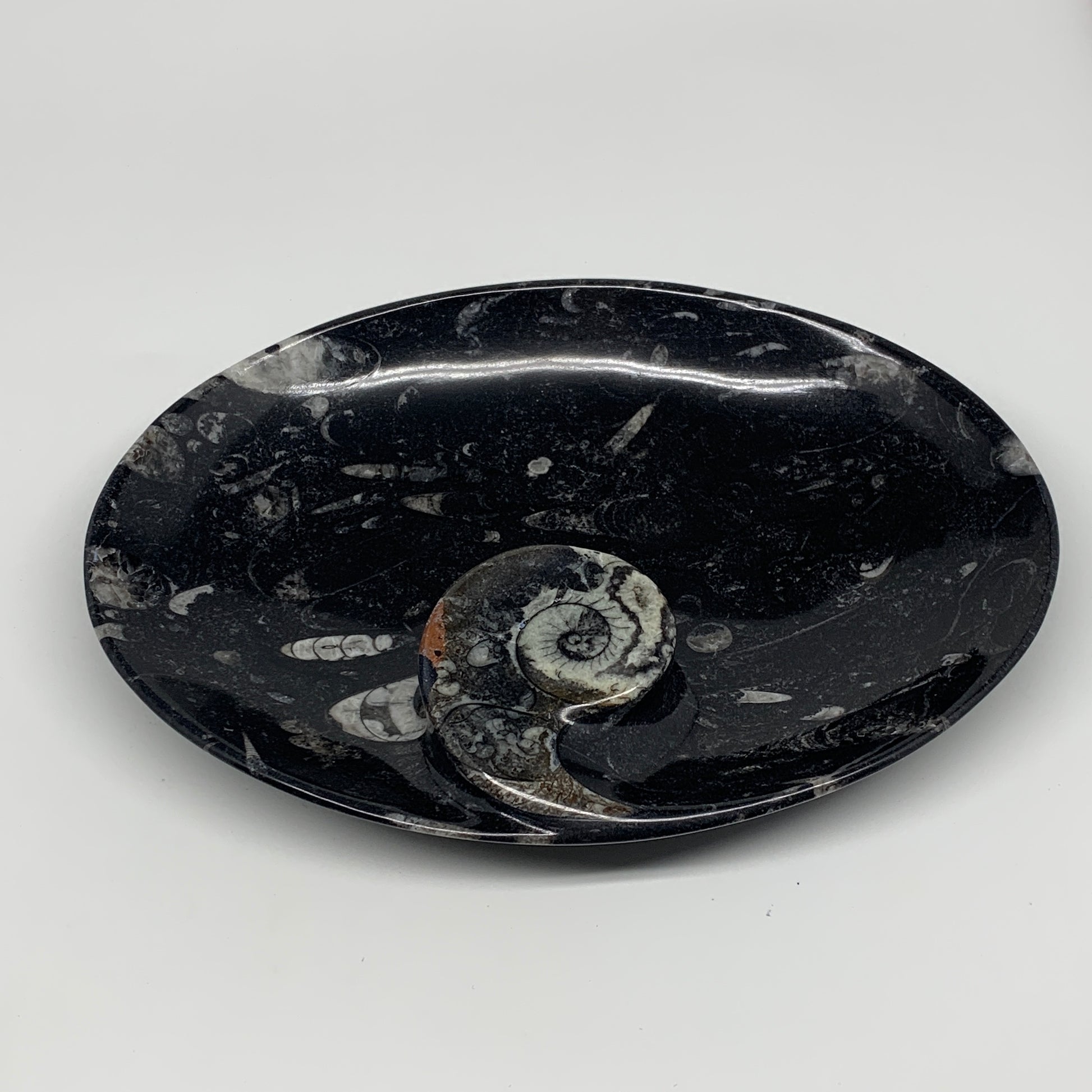 734g, 8.75"x6.5" Black Fossils Ammonite Orthoceras Bowl Oval Ring @Morocco,B8453