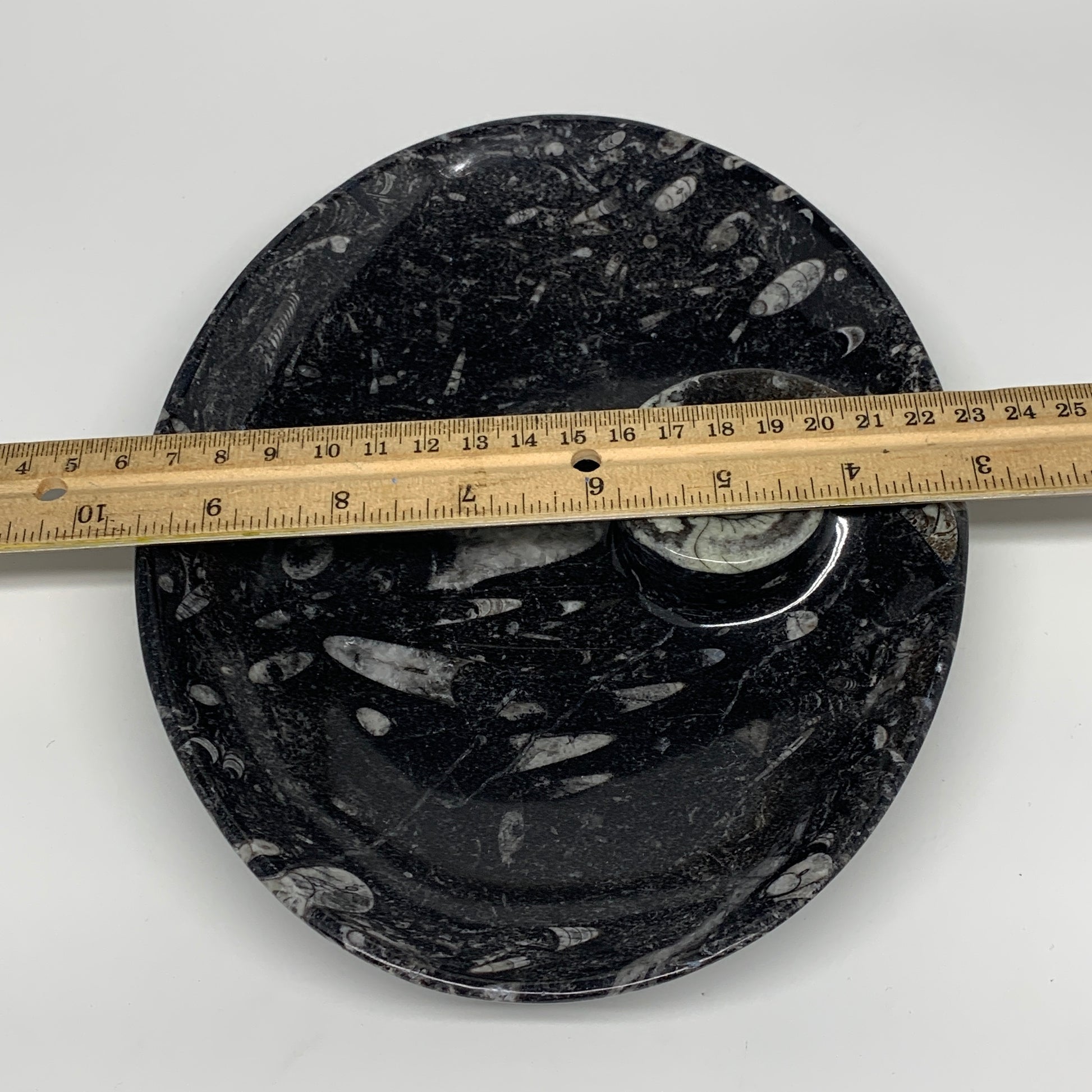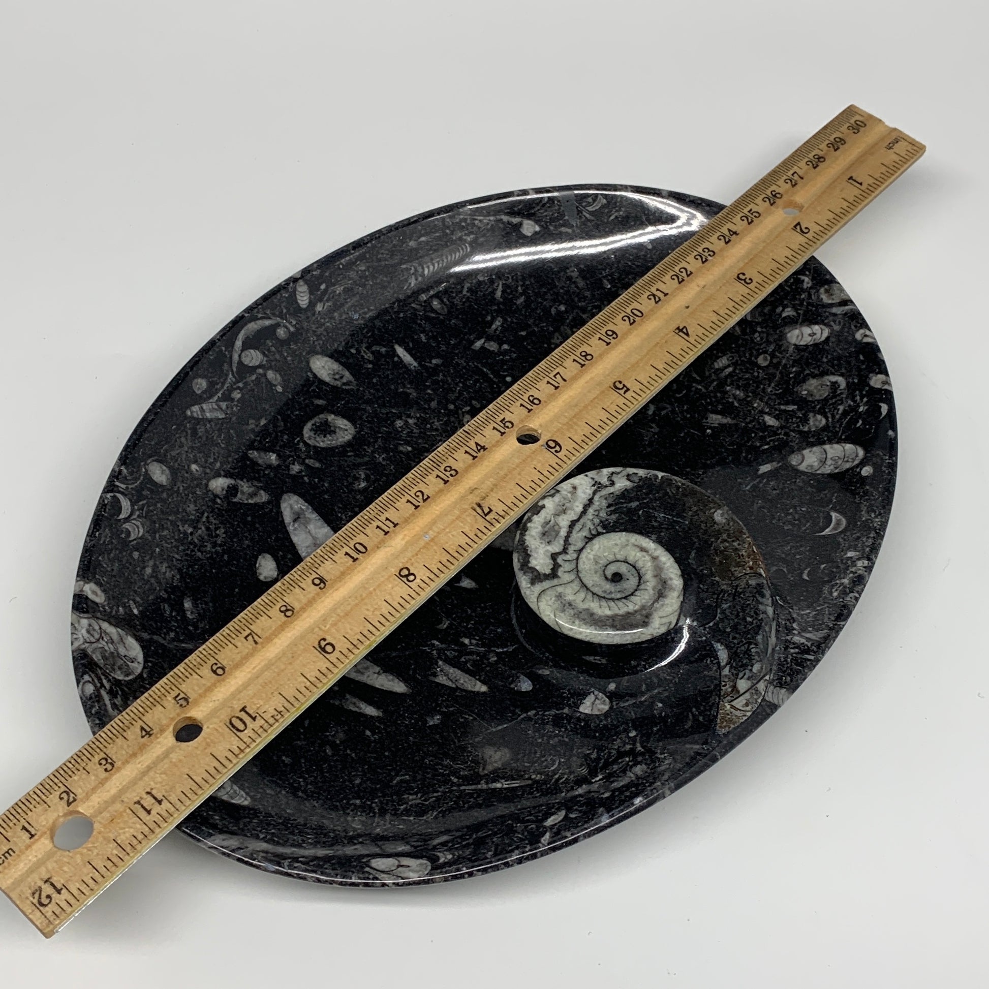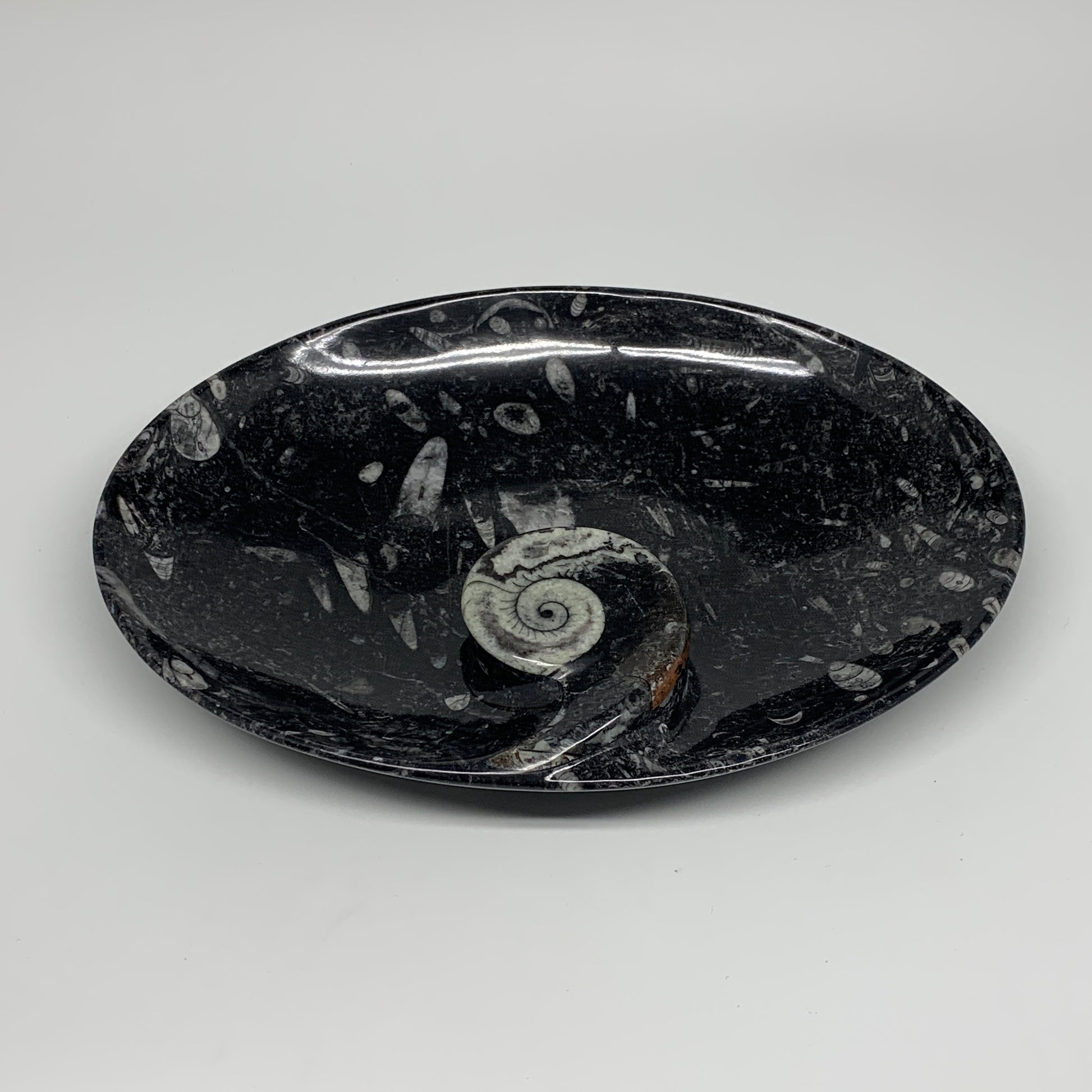 742g, 8.75"x6.5" Black Fossils Ammonite Orthoceras Bowl Oval Ring @Morocco,B8392