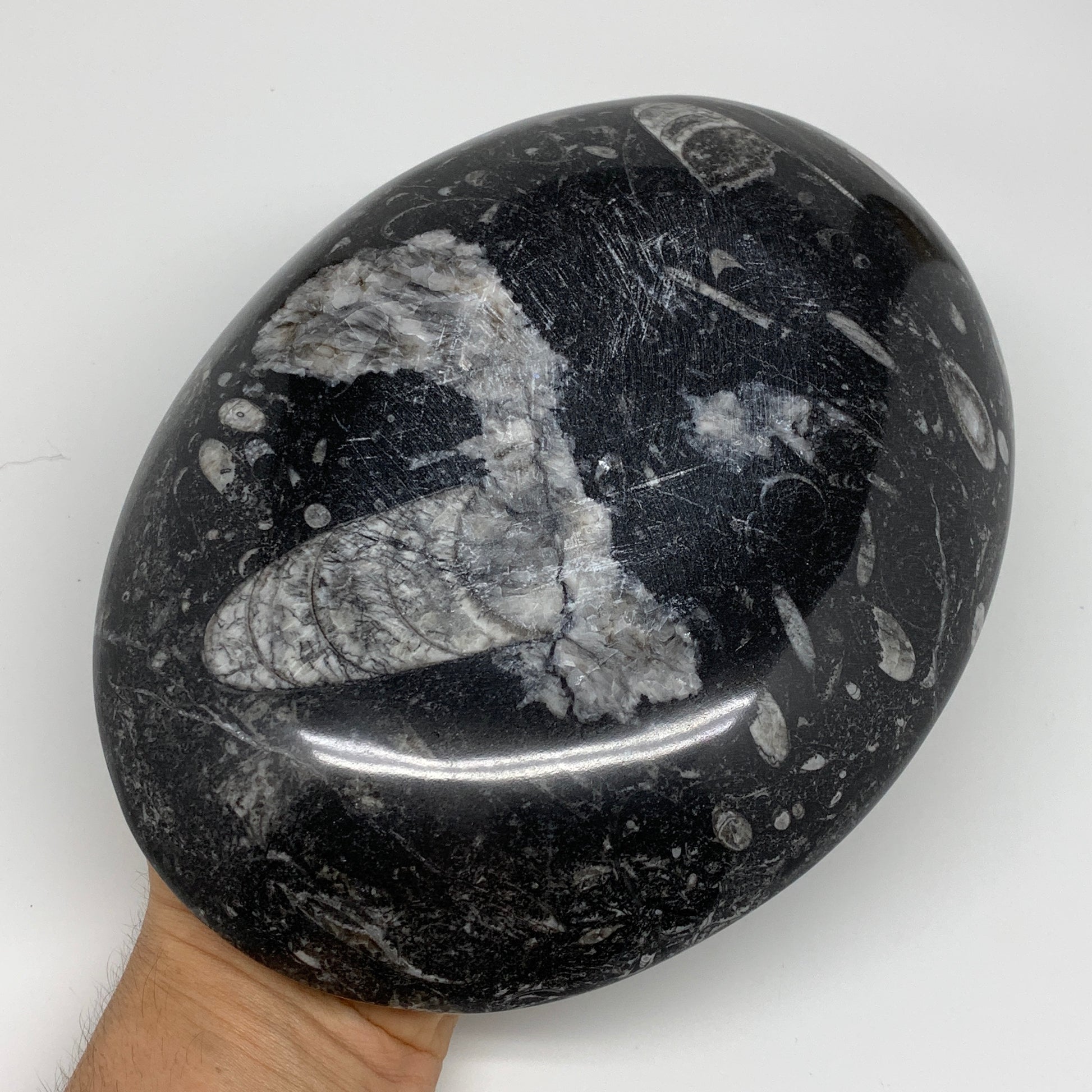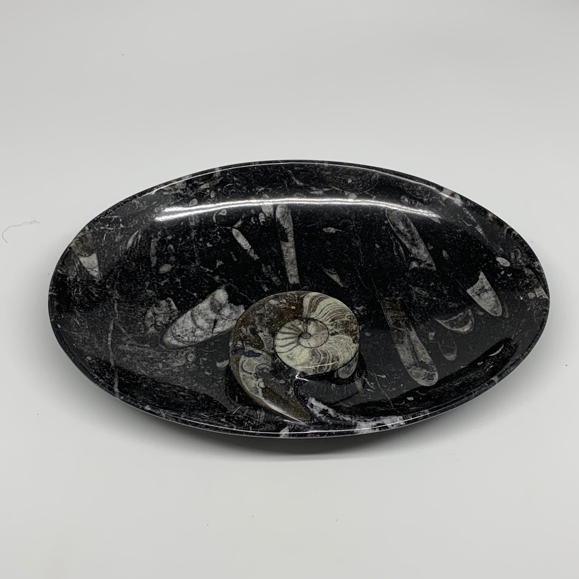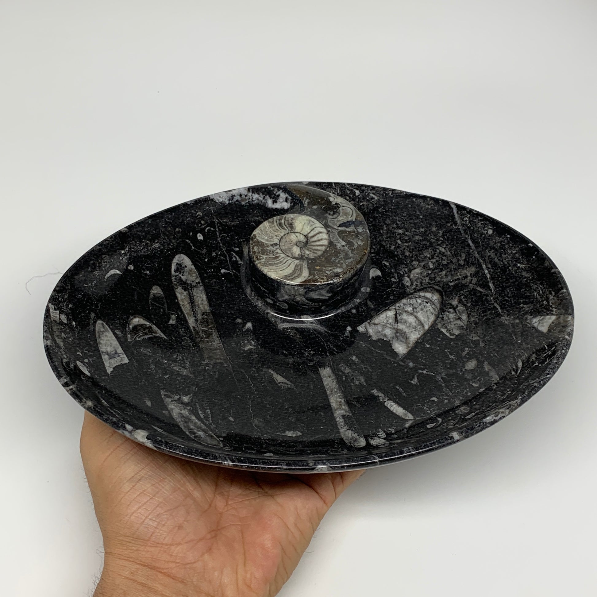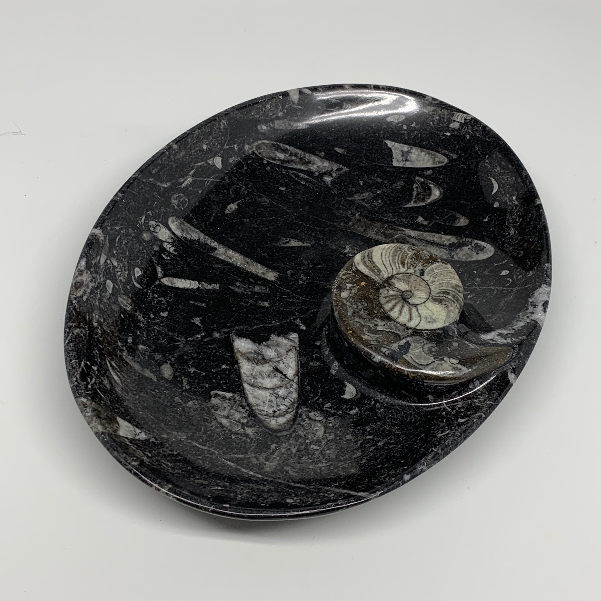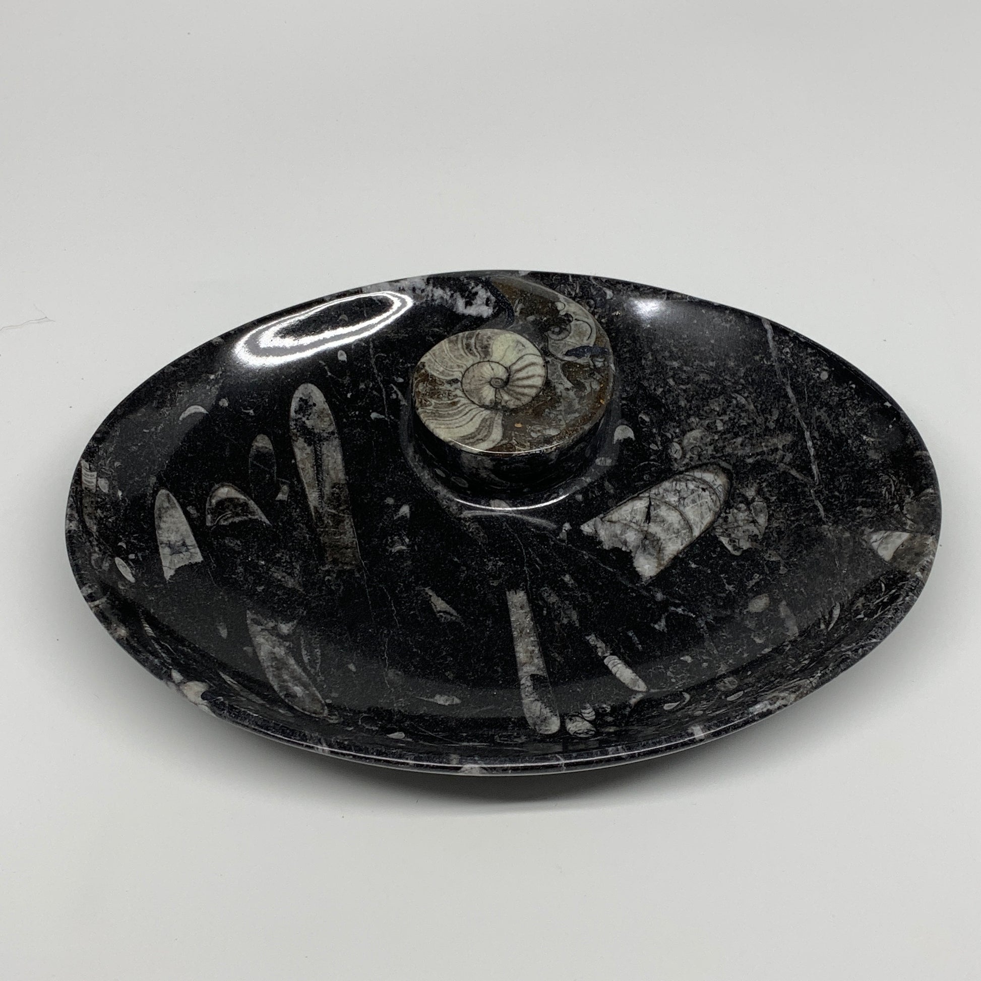 748g, 8.75"x6.5" Black Fossils Ammonite Orthoceras Bowl Oval Ring @Morocco,B8400