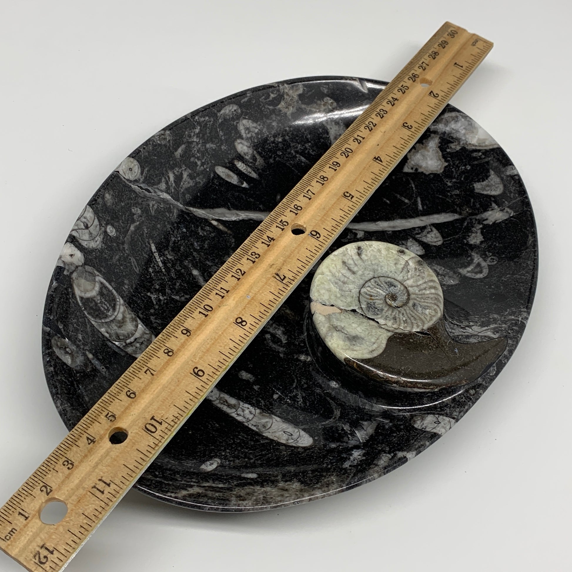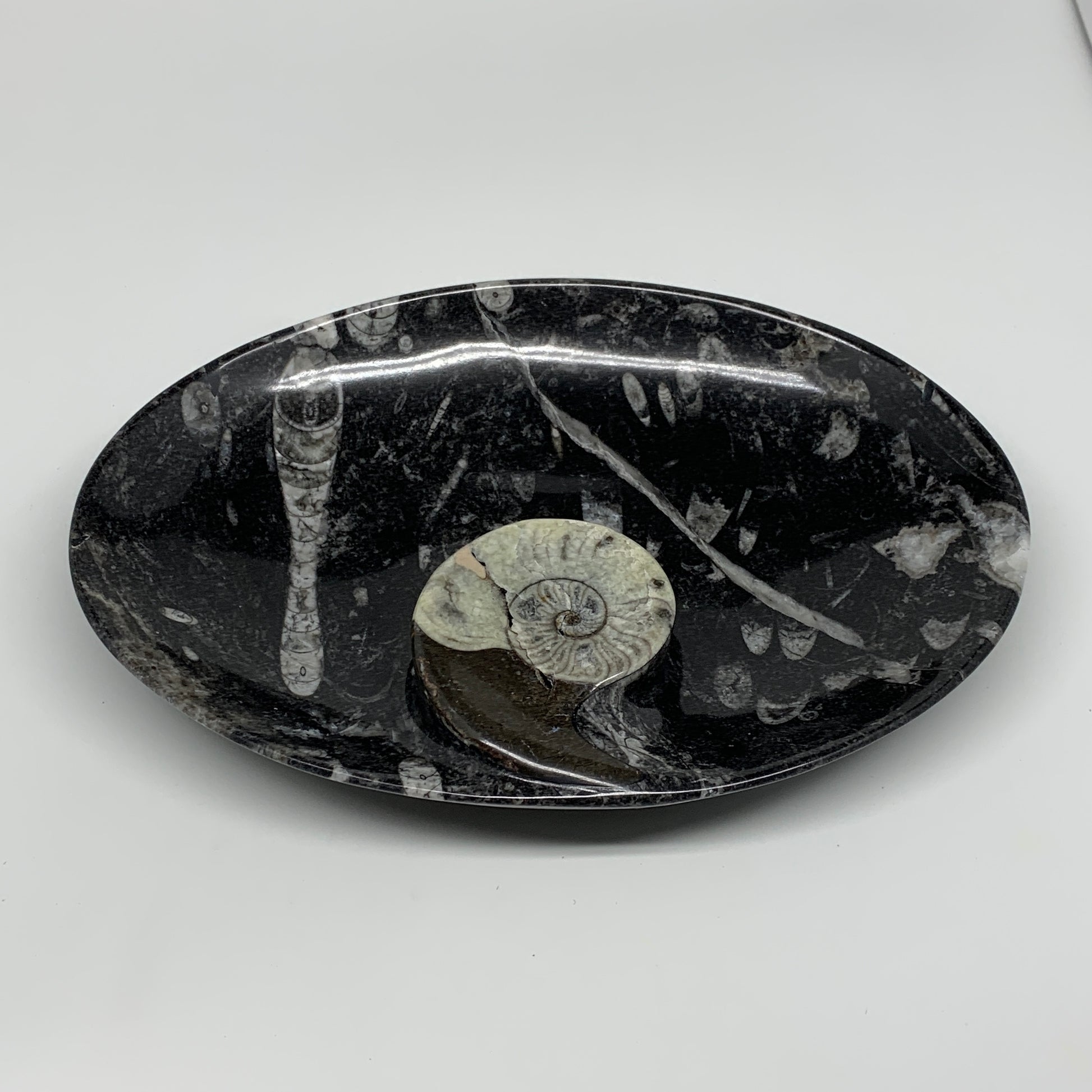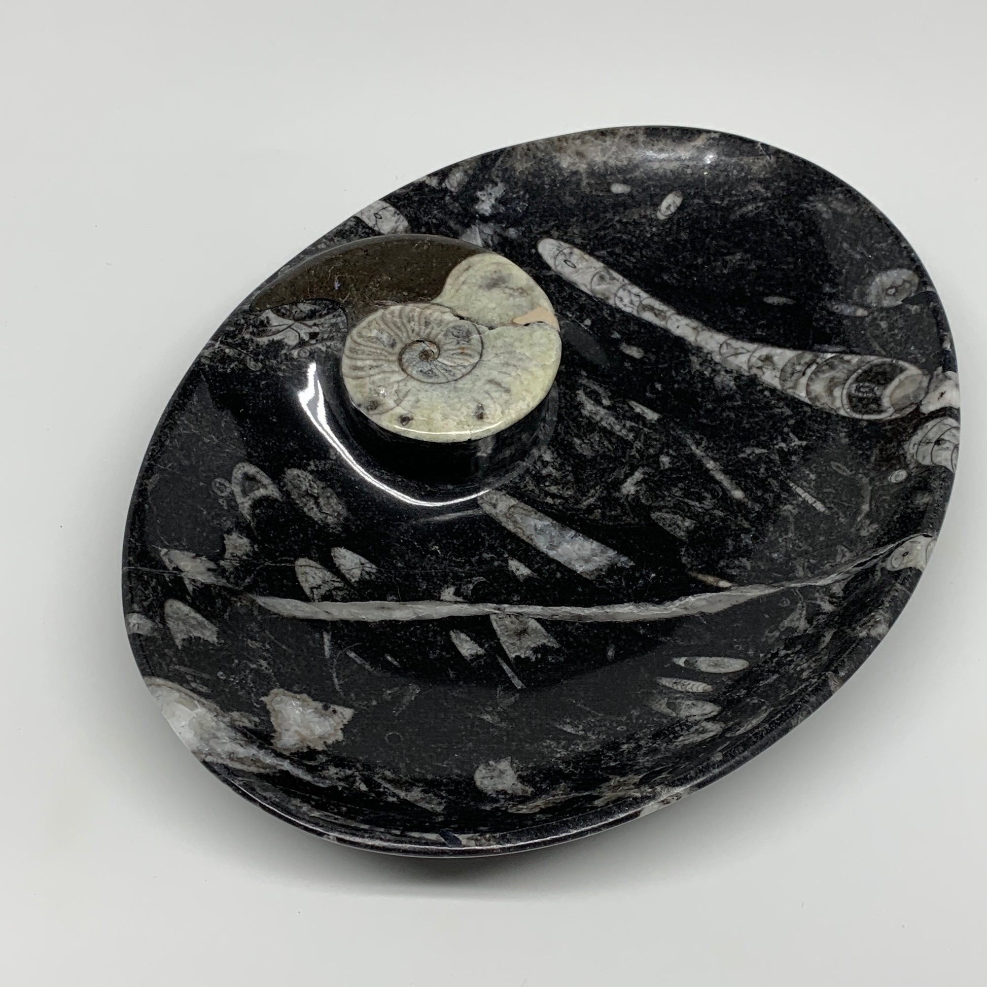 772g, 8.75"x6.5" Black Fossils Ammonite Orthoceras Bowl Oval Ring @Morocco,B8429