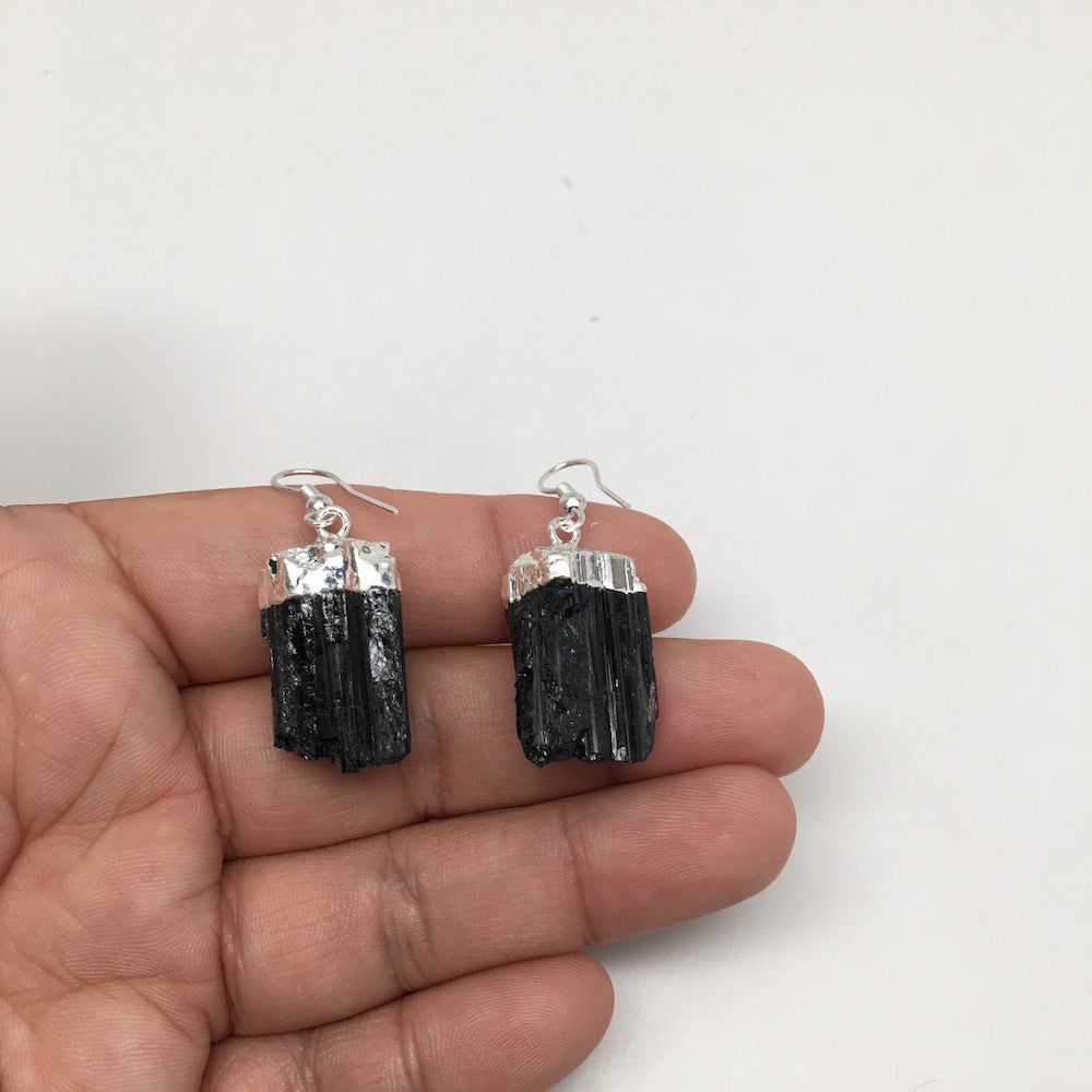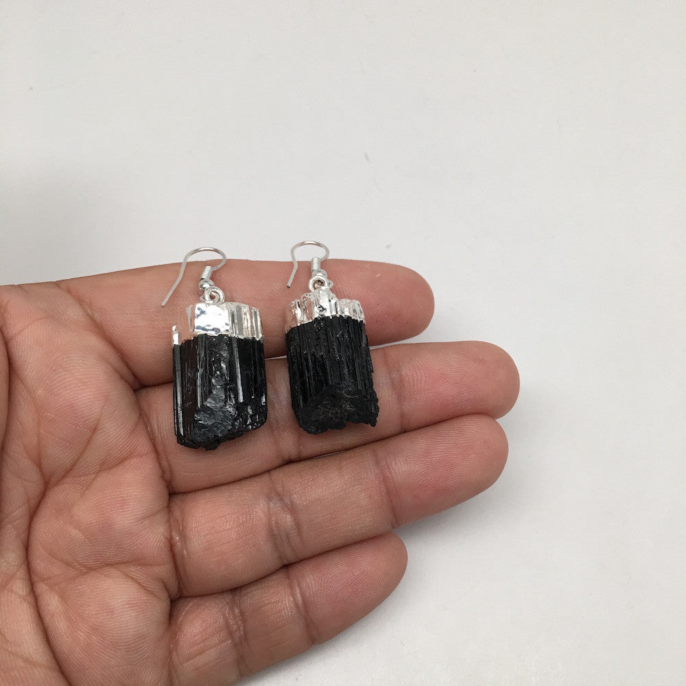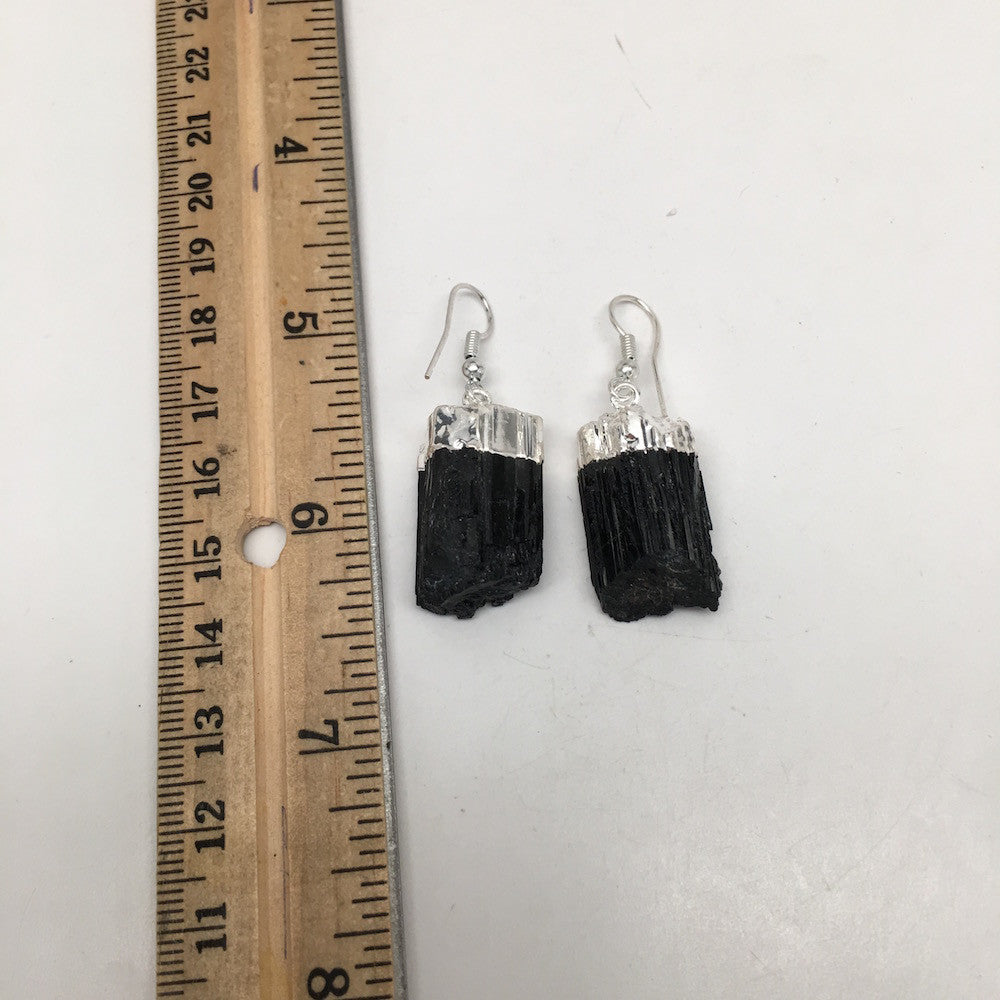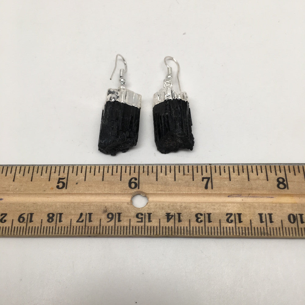 79cts Natural Rough Chunk Black Tourmaline Earrings Silver Plated @Brazil,C772