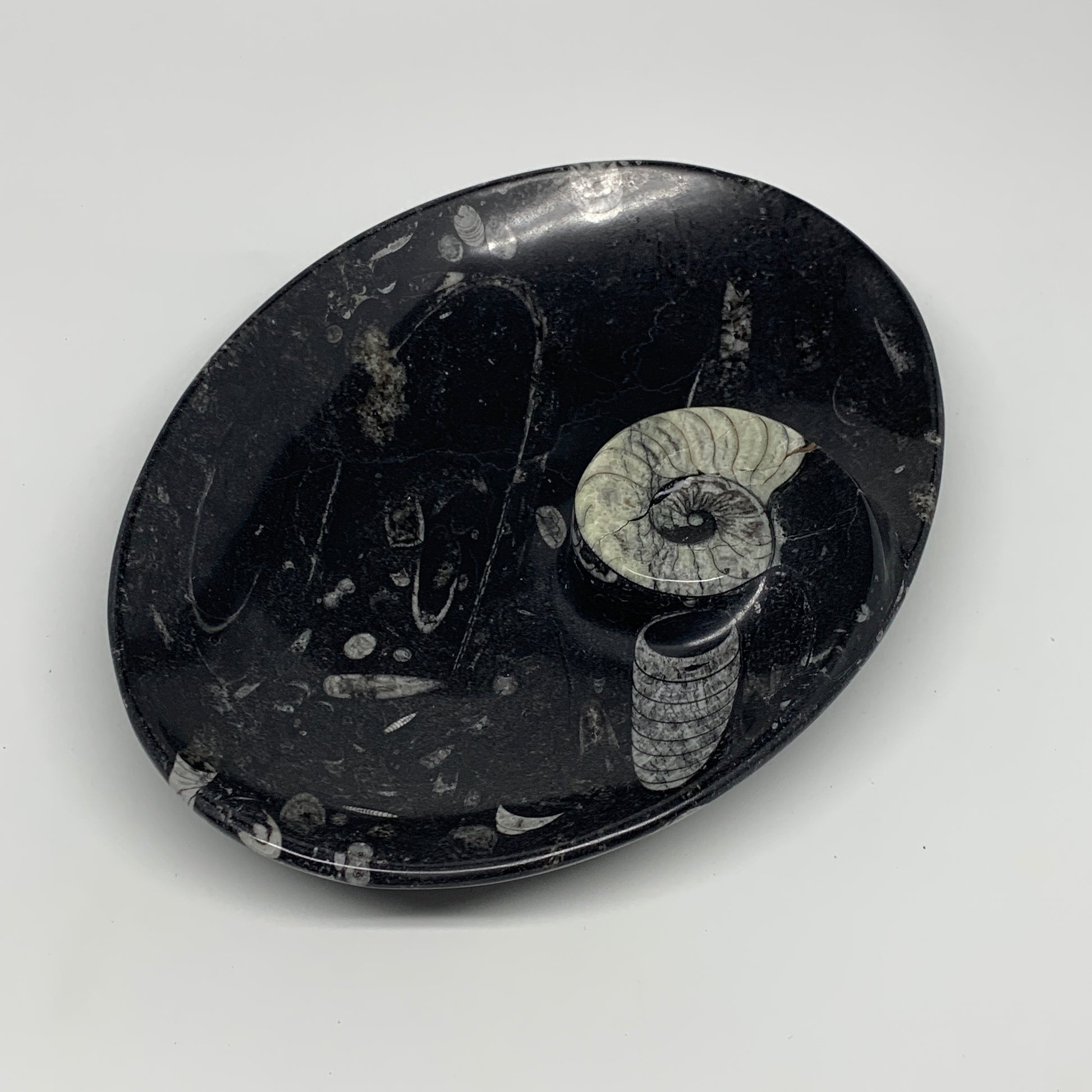 868g, 8.75"x6.5" Black Fossils Ammonite Orthoceras Bowl Oval Ring @Morocco,B8459