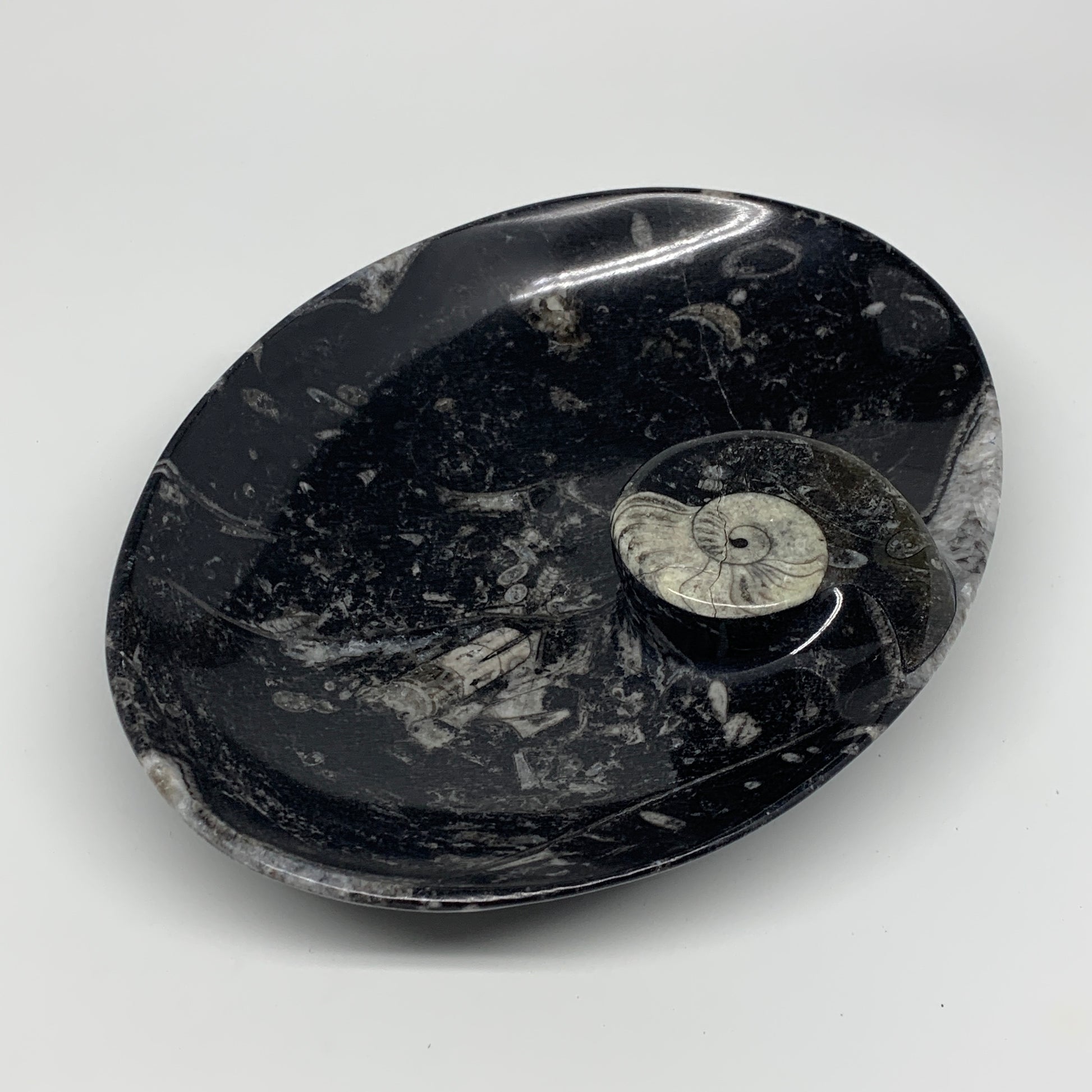 884g, 8.75"x6.5" Black Fossils Ammonite Orthoceras Bowl Oval Ring @Morocco,B8446