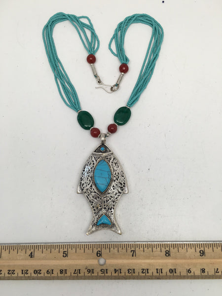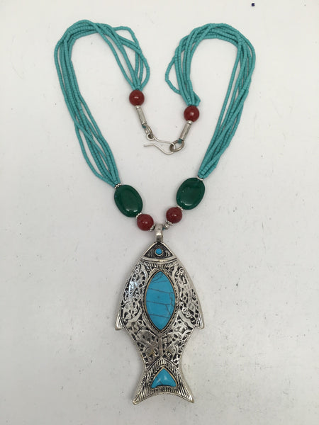 Handmade Afghan Turkmen Tribal Blue Turquoise Inlay Fish Multi Strand Bead Necklace,V209