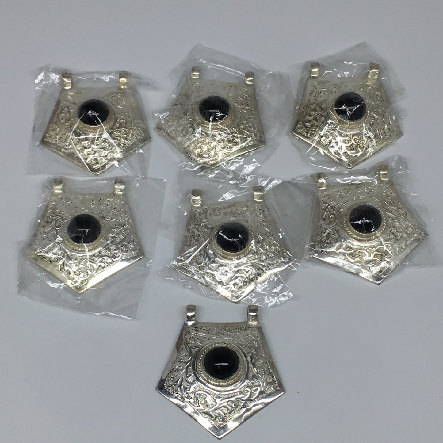 Afghan craftsmen (Afghan Refugees living in Peshawar, Pakistan) make all these necklaces and other pieces of authentic beautiful jewelry one by one and by hand. All of the crafters are self-employed and make these items by taking orders. The metals used in these kinds of jewelry are called different names, some call it German silver, some called it Gypsy and some call it Alpaca Silver. However, the metal is similar to Tibetan Jewelry. The metal doesn't change color either and can be cleaned just like silver. These Jewelry have been in the market for centuries.