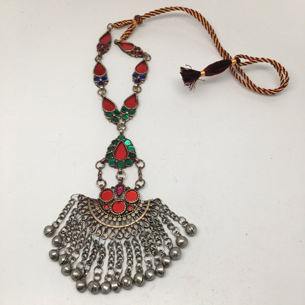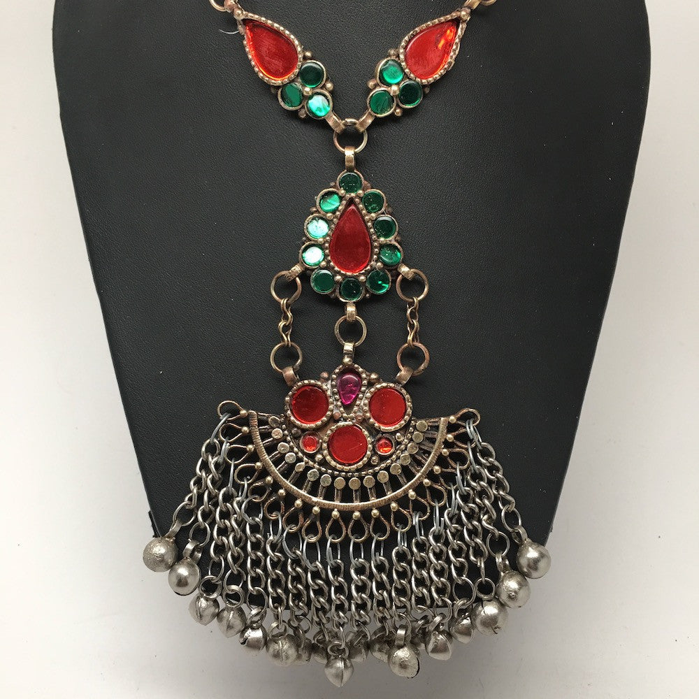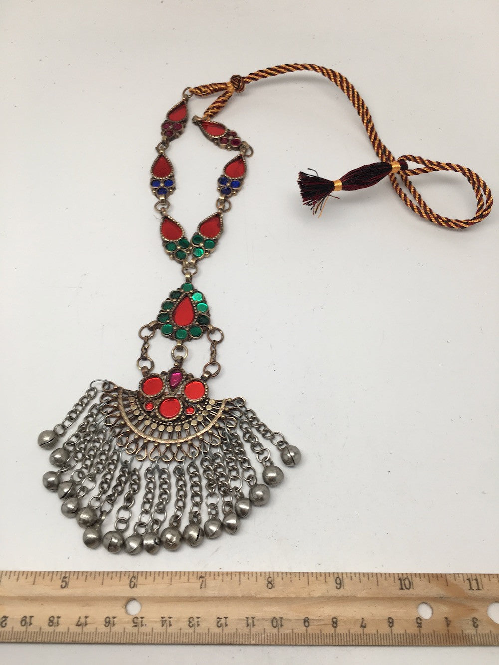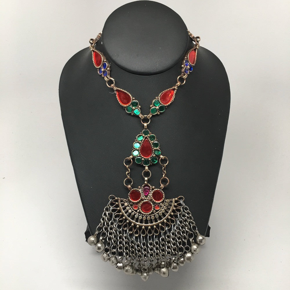 Handmade Afghan Tribal Kuchi Multi-Color Glass Bells Boho ATS Necklace, KN359