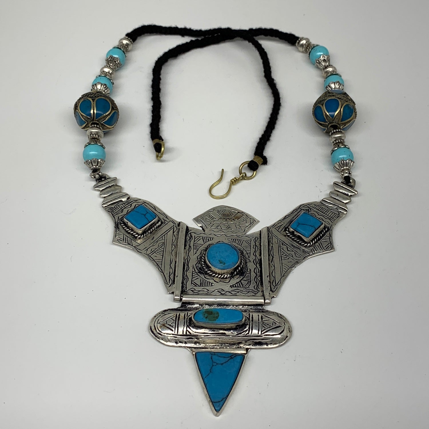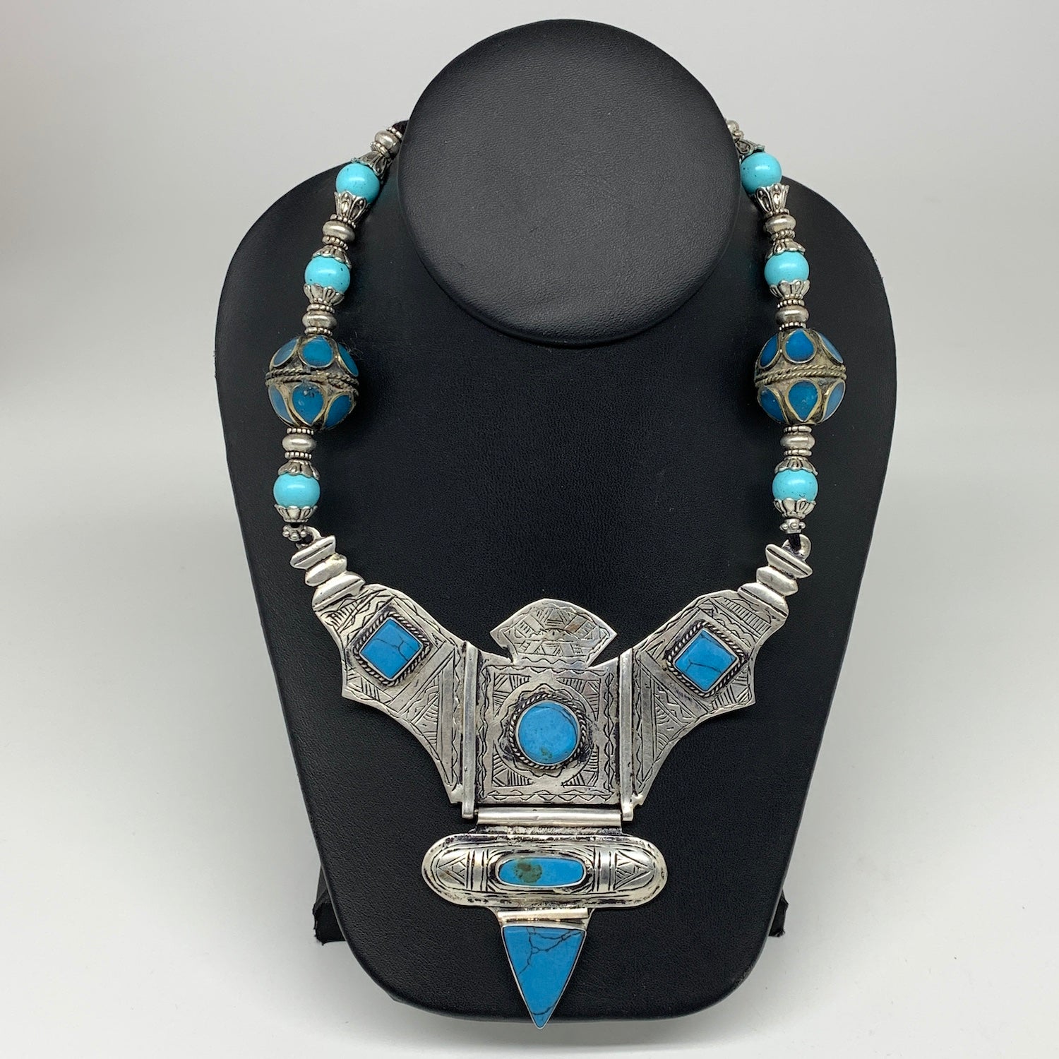 Turkmen Necklace Antique Afghan Tribal Blue Turquoise Inlay V-Neck, Necklace T50N