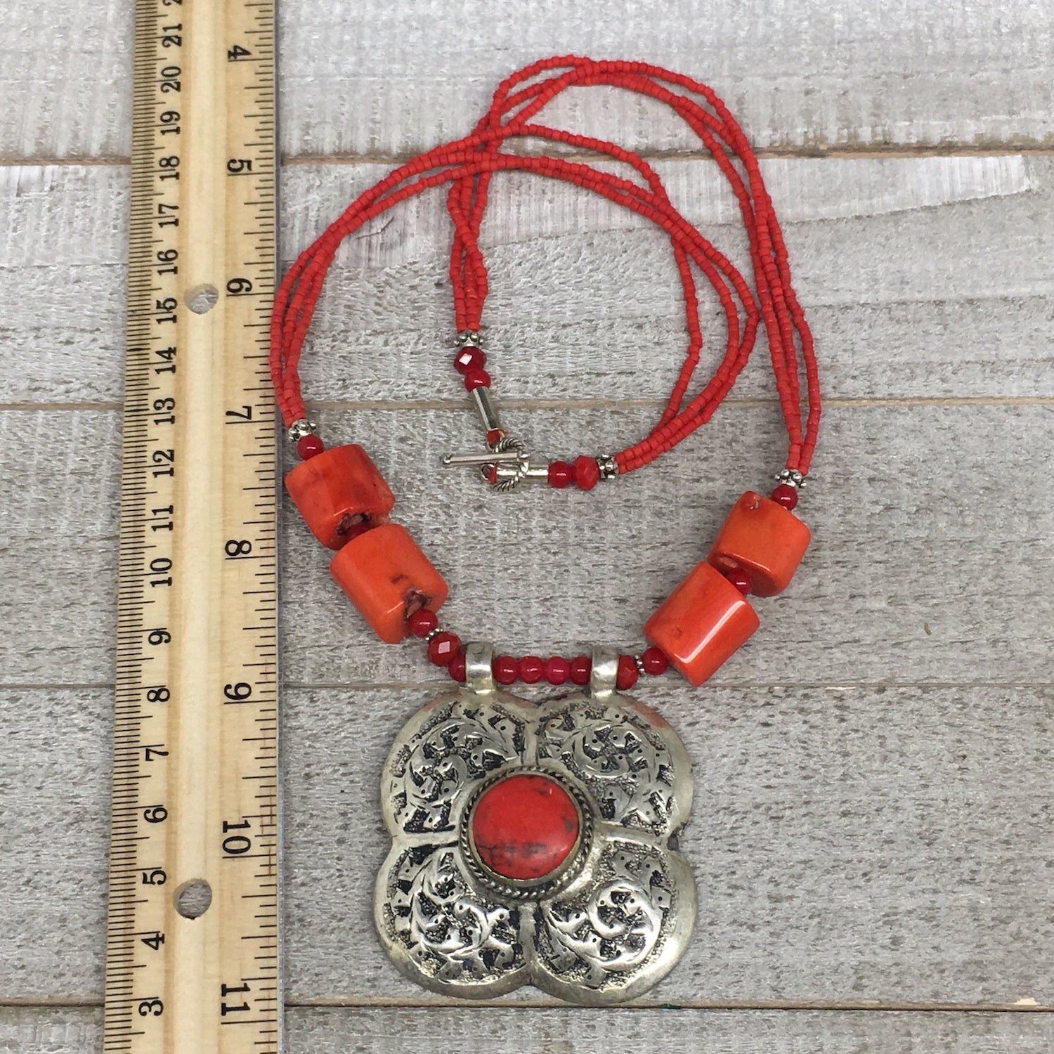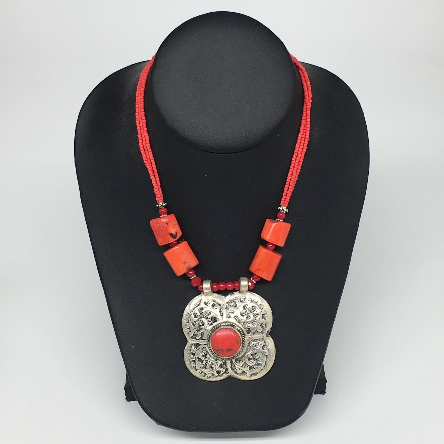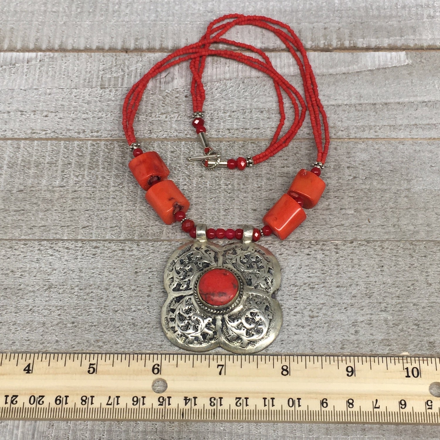 1pc, Turkmen Necklace Pendant Statement Tribal Coral Inlay Beaded,20-21", BN38