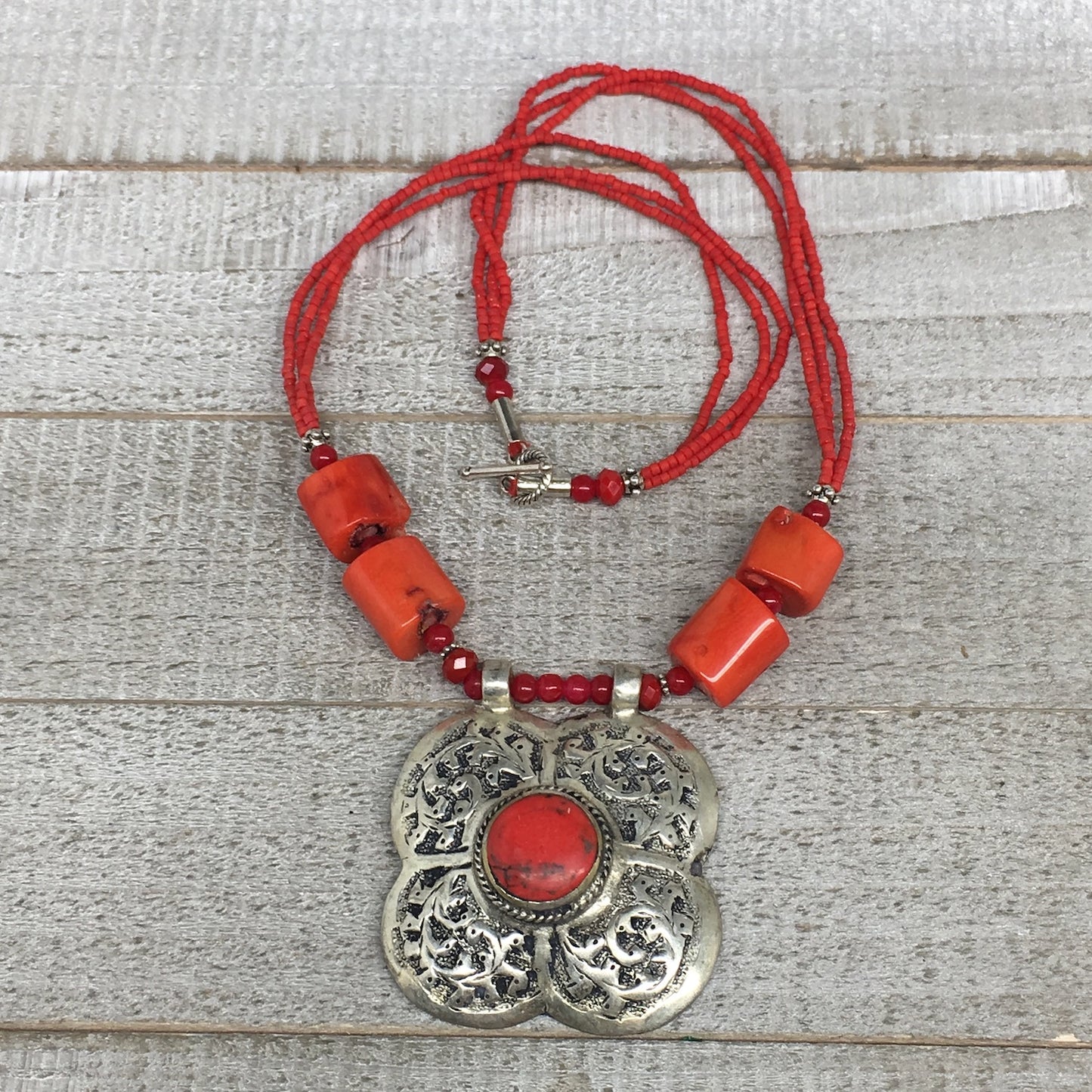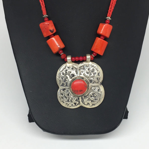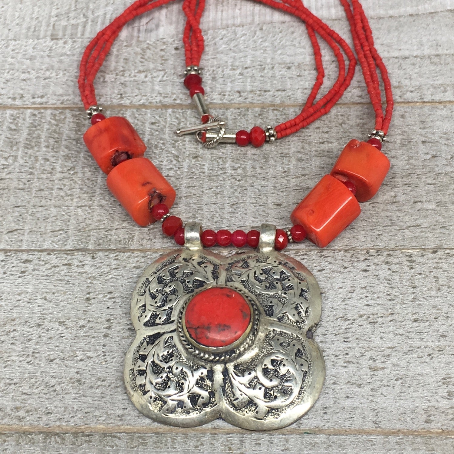 1pc, Turkmen Necklace Pendant Statement Tribal Coral Inlay Beaded,20-21", BN38