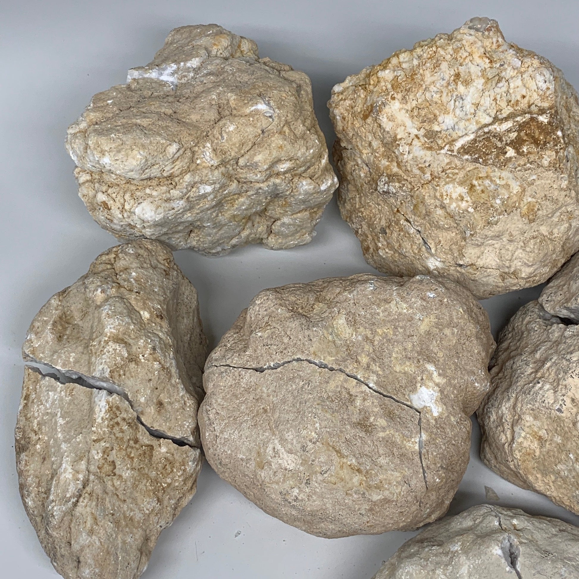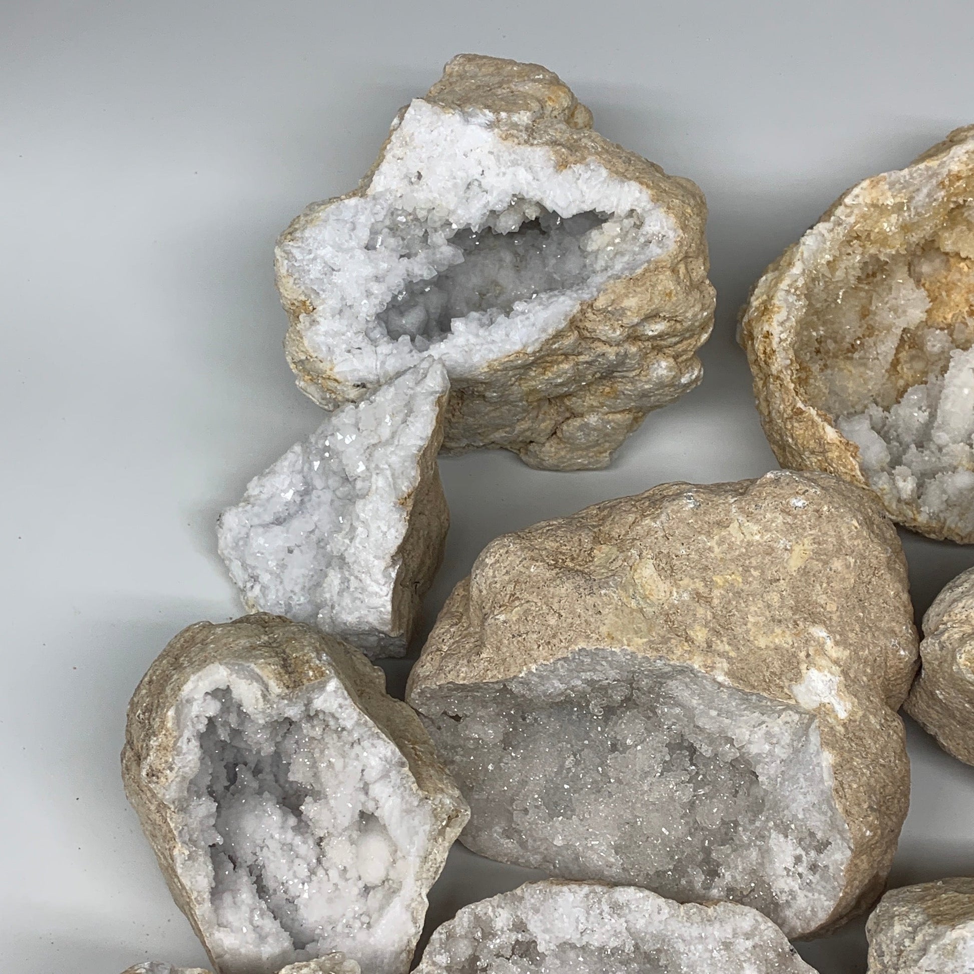 This was a natural calcite/quartz rock broken in two pieces and inside is a geode. Some people call it quartz geode and some call it calcite geode. The geode edges may have small missing parts, not broken perfectly, edges maybe damaged slightly and many other imperfections. Simply because it was broken by hammer, not machine. So, expect minor imperfections. When you take it out of the shipping box or open it, small residuals and pieces will fall off from inside if you hold it up. That is normal because these are natural rough crystals not polished. If you put them back, the edges may not fit back 100% due to broken edges of each geode.